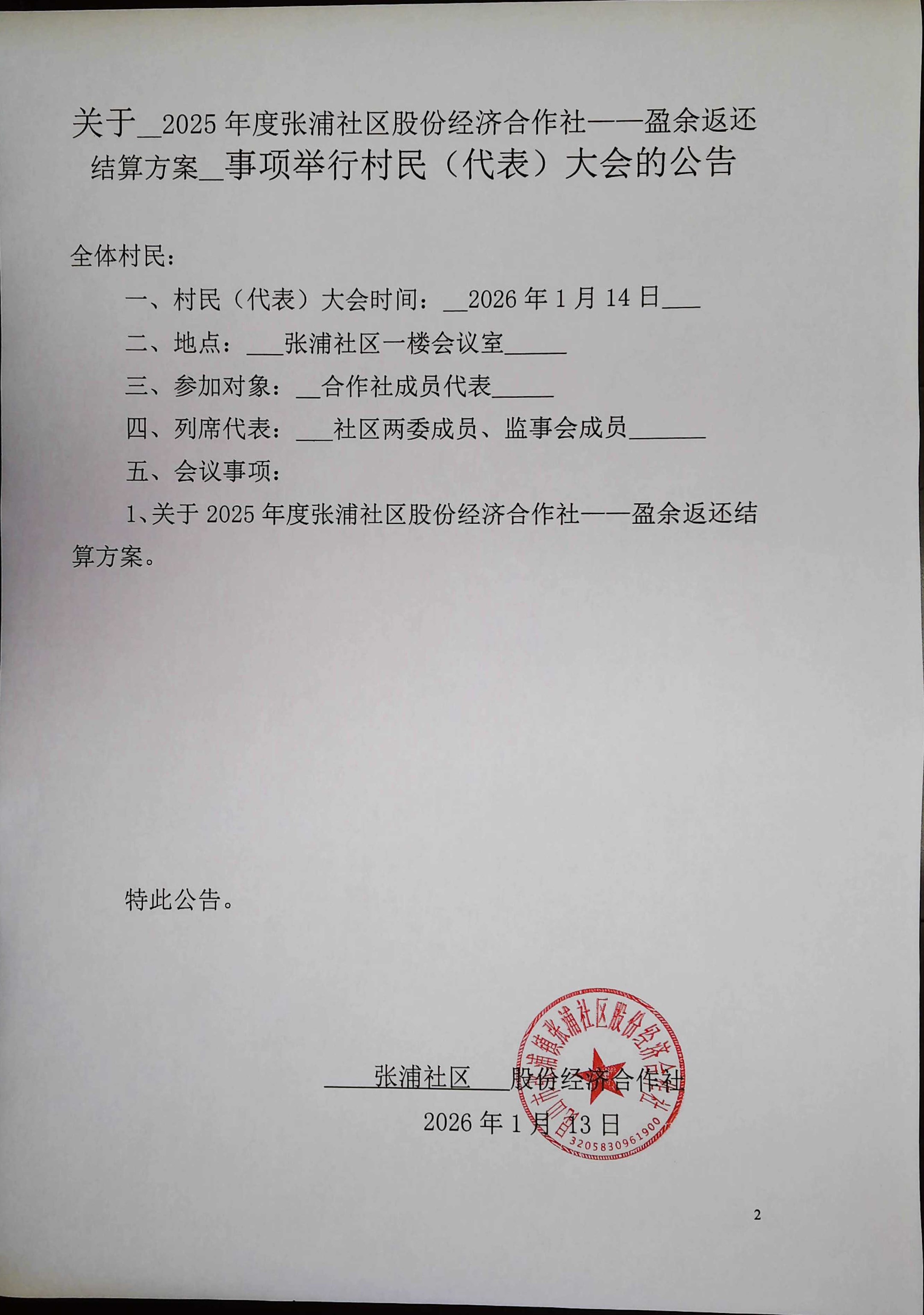 关于2025年度盈余返还结算方案事项举行村(代表)大会的公告