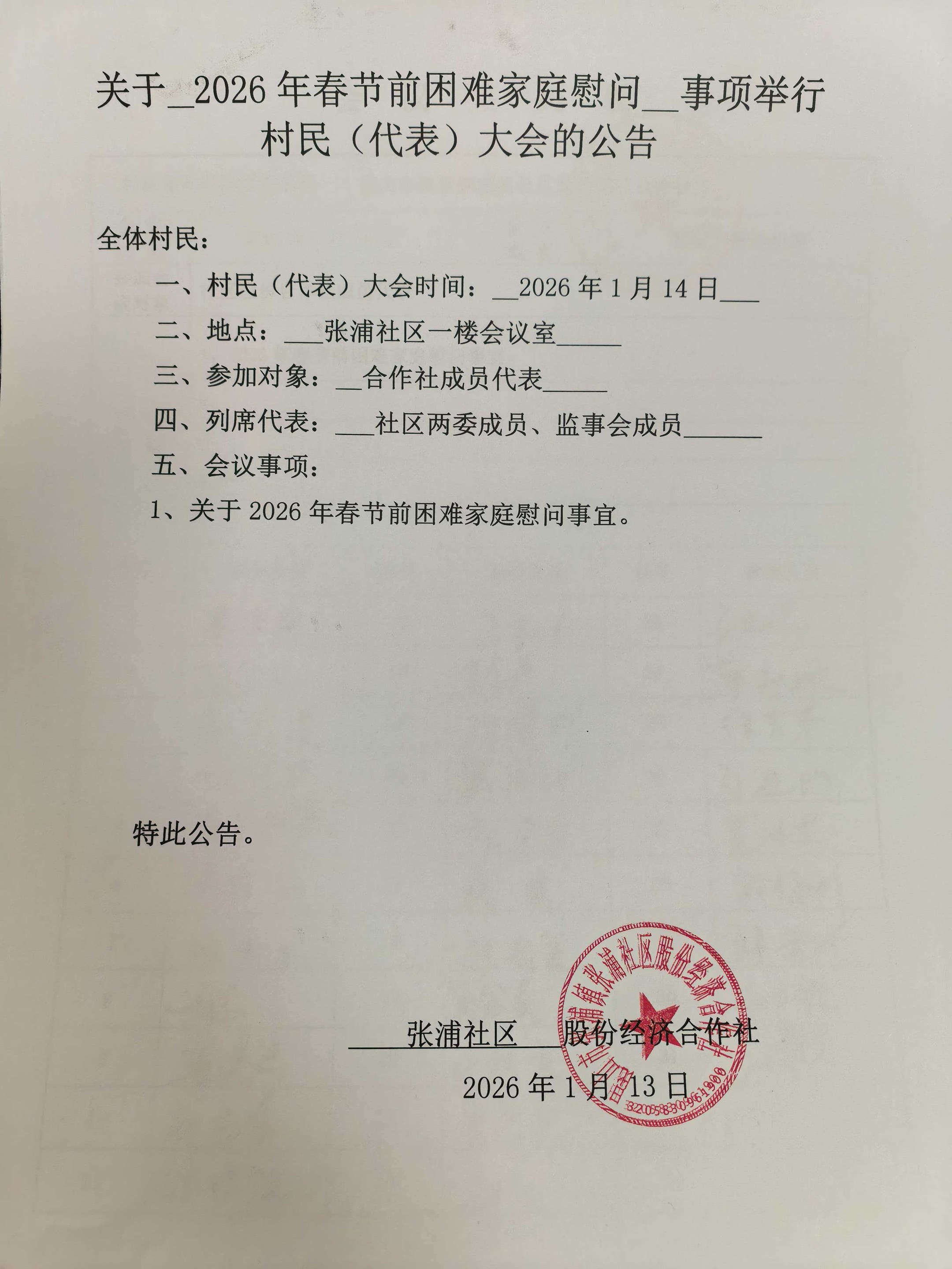 关于2026年春节前困难家庭慰问事项举行村(代表)大会的公告