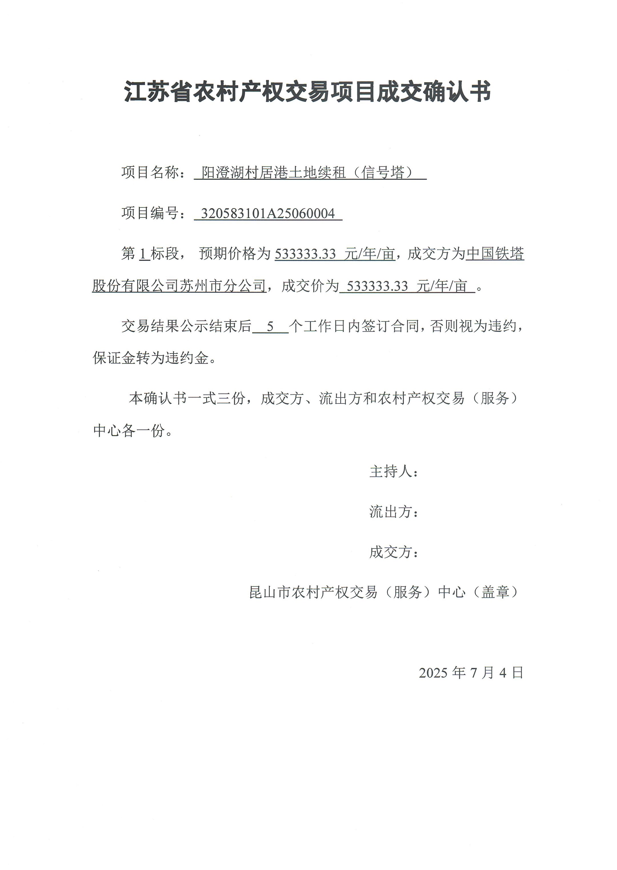 阳澄湖村居港土地续租(中国铁搭股份有限公司苏州市分公司)成交公告