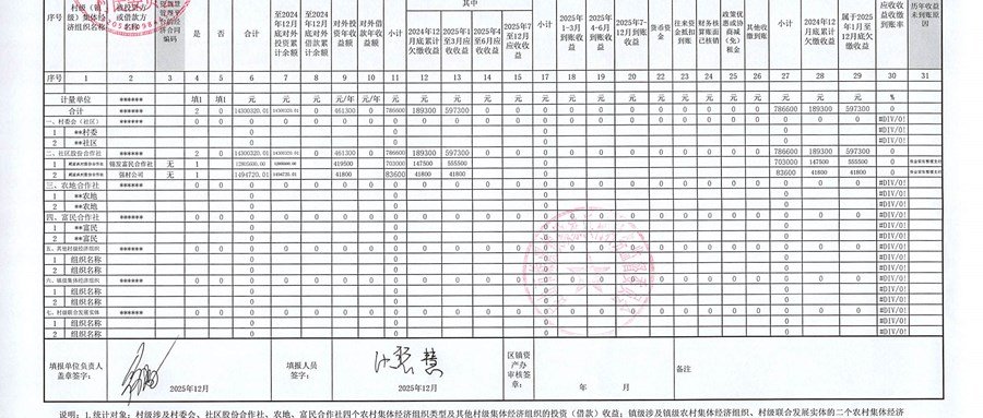 (截止日期2025年12月31日)农村集体资产、资源租赁发包经济合同执行进度明细表、投资收益清缴进度明细表