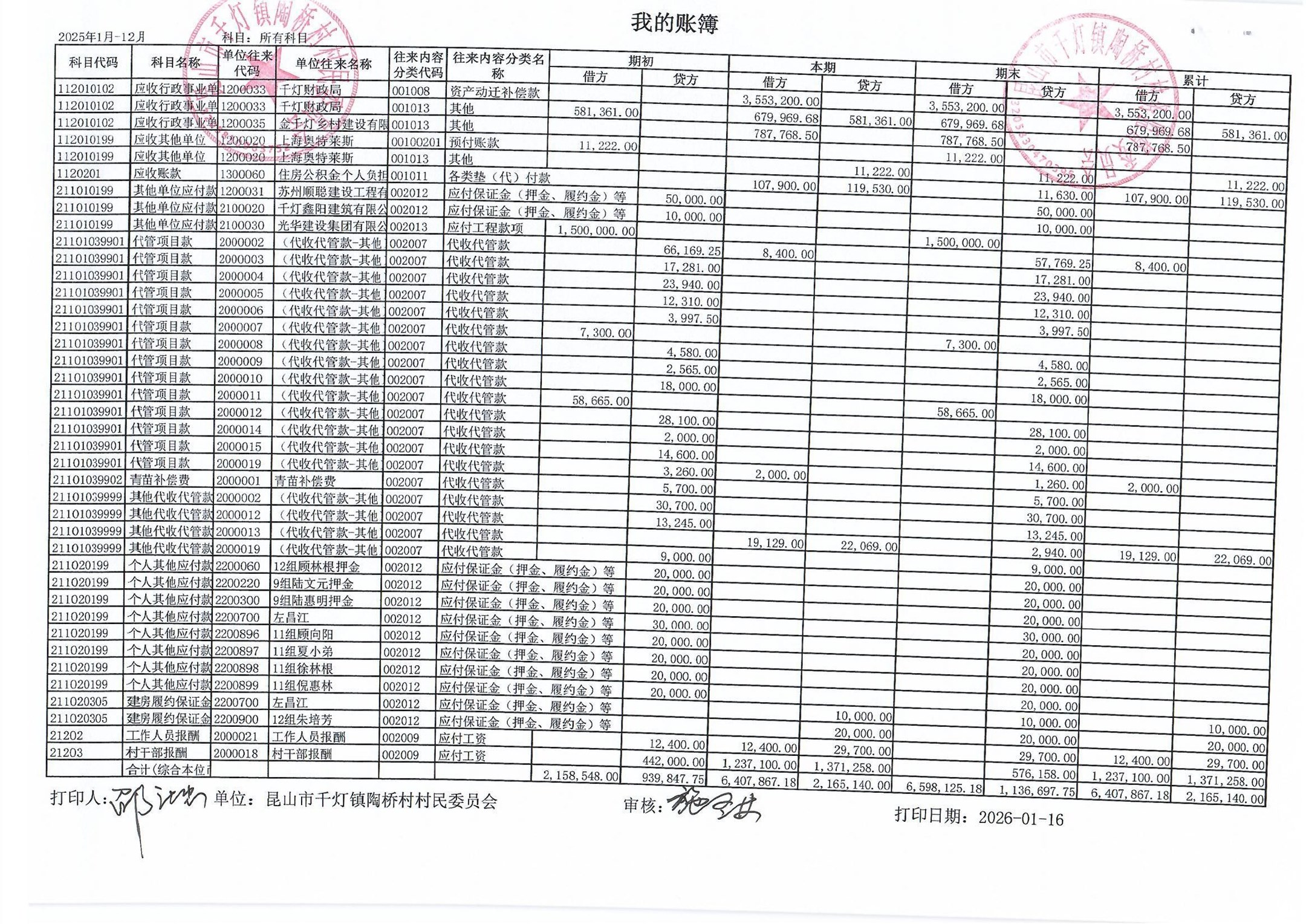 陶桥村村民委员会2025年12月财务公开内容: