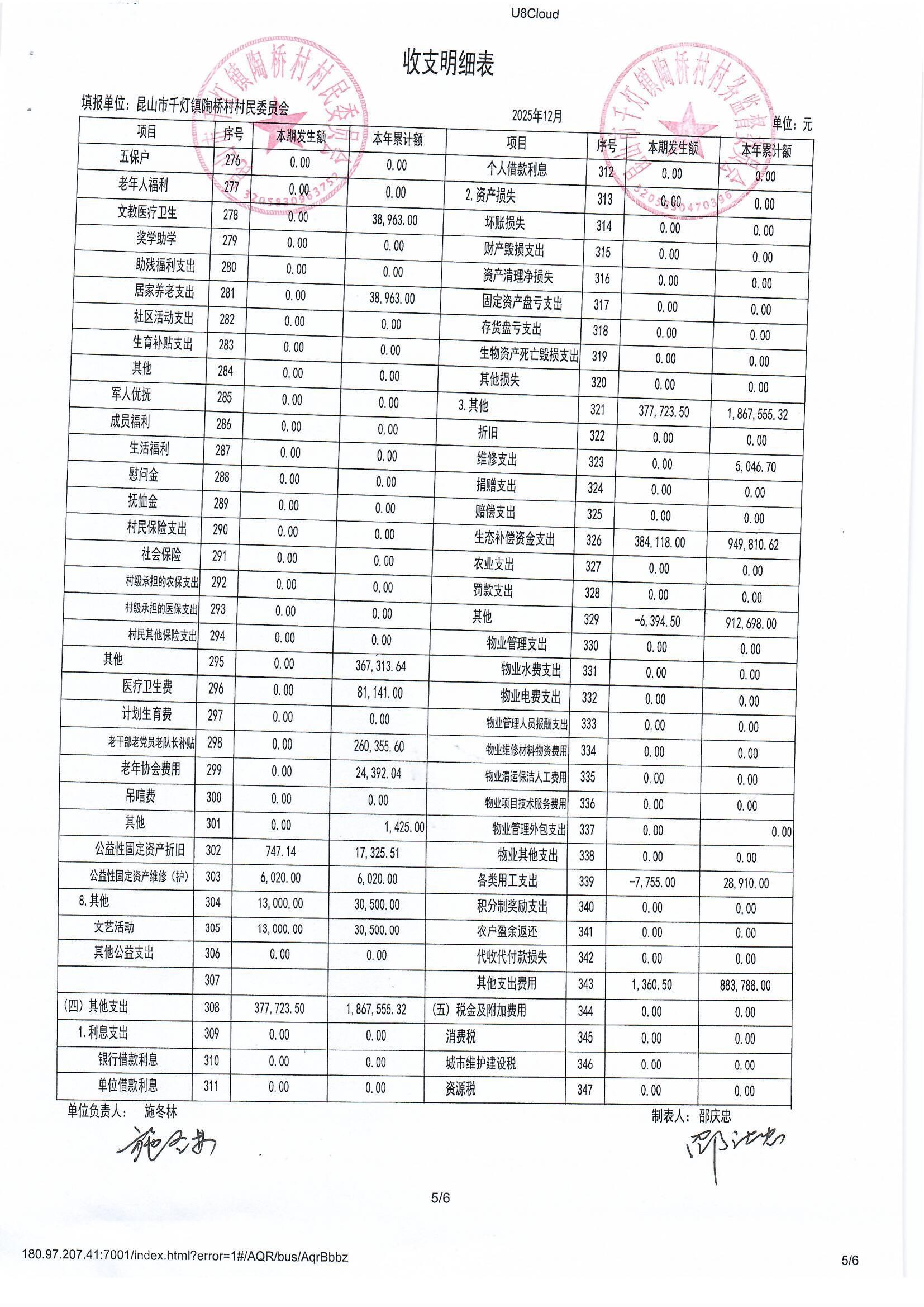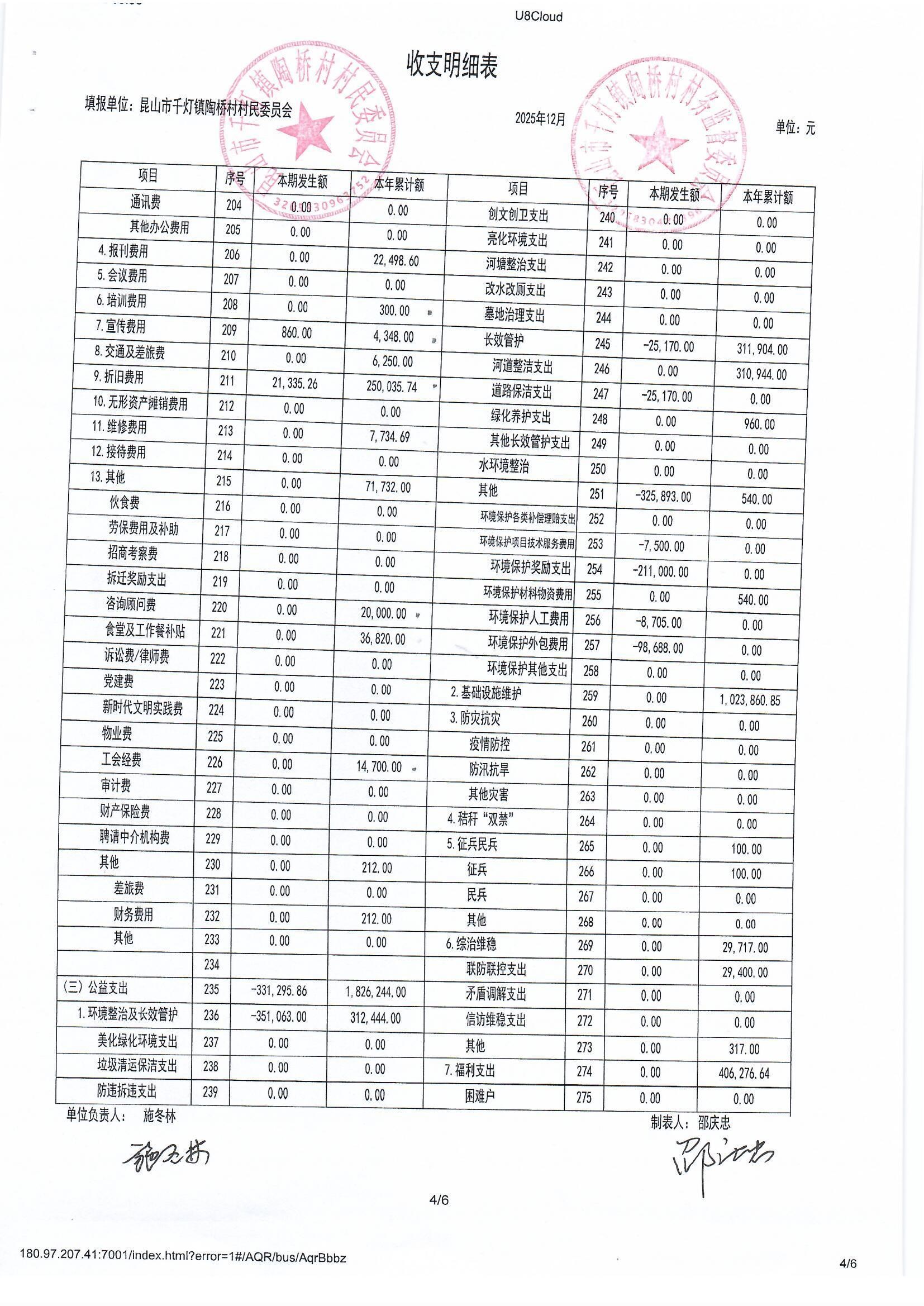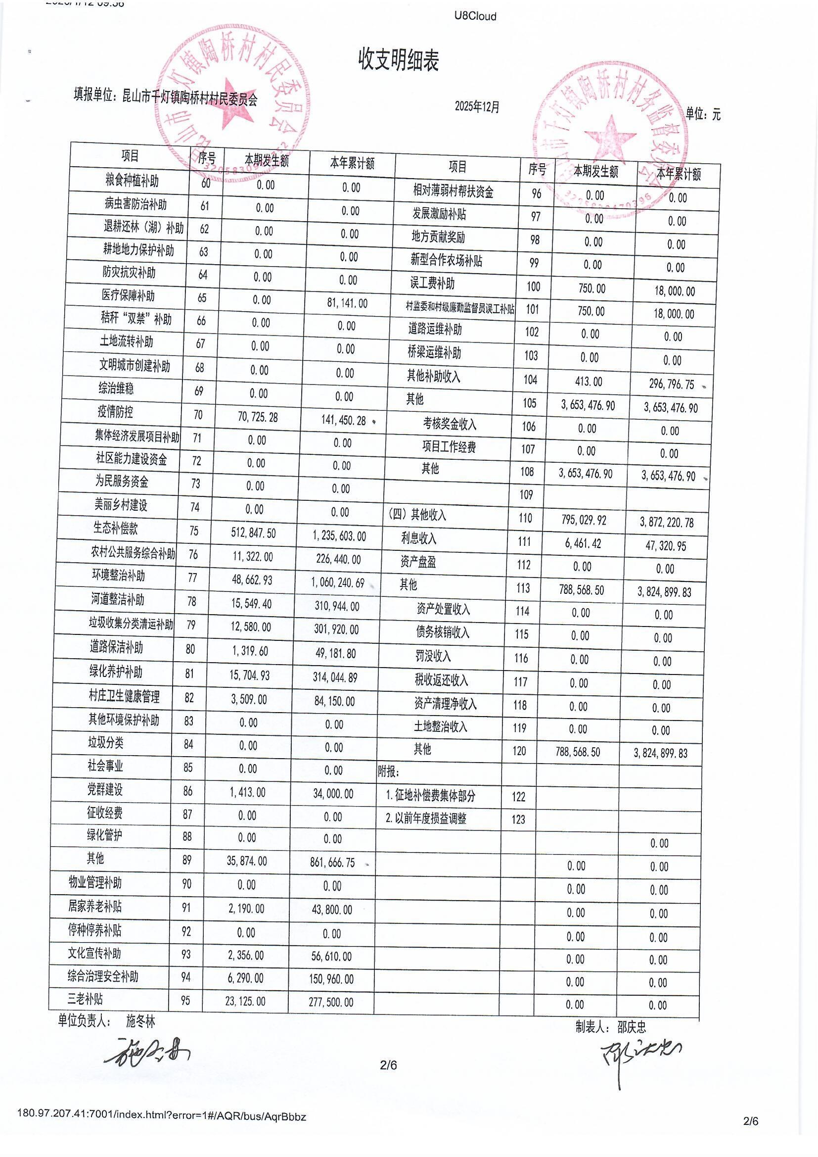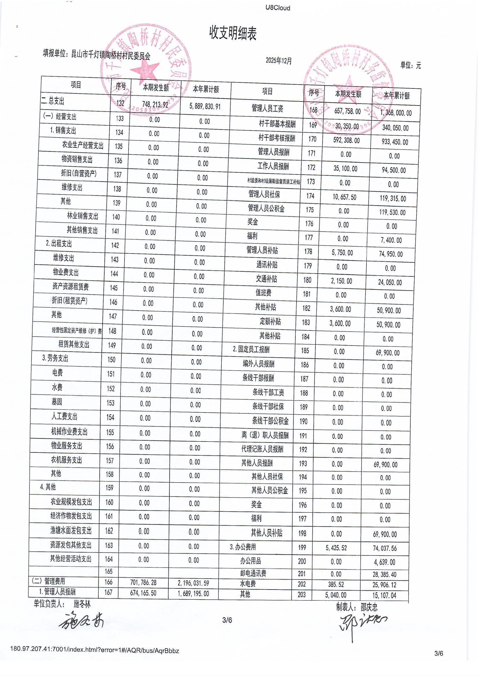 陶桥村村民委员会2025年12月财务公开