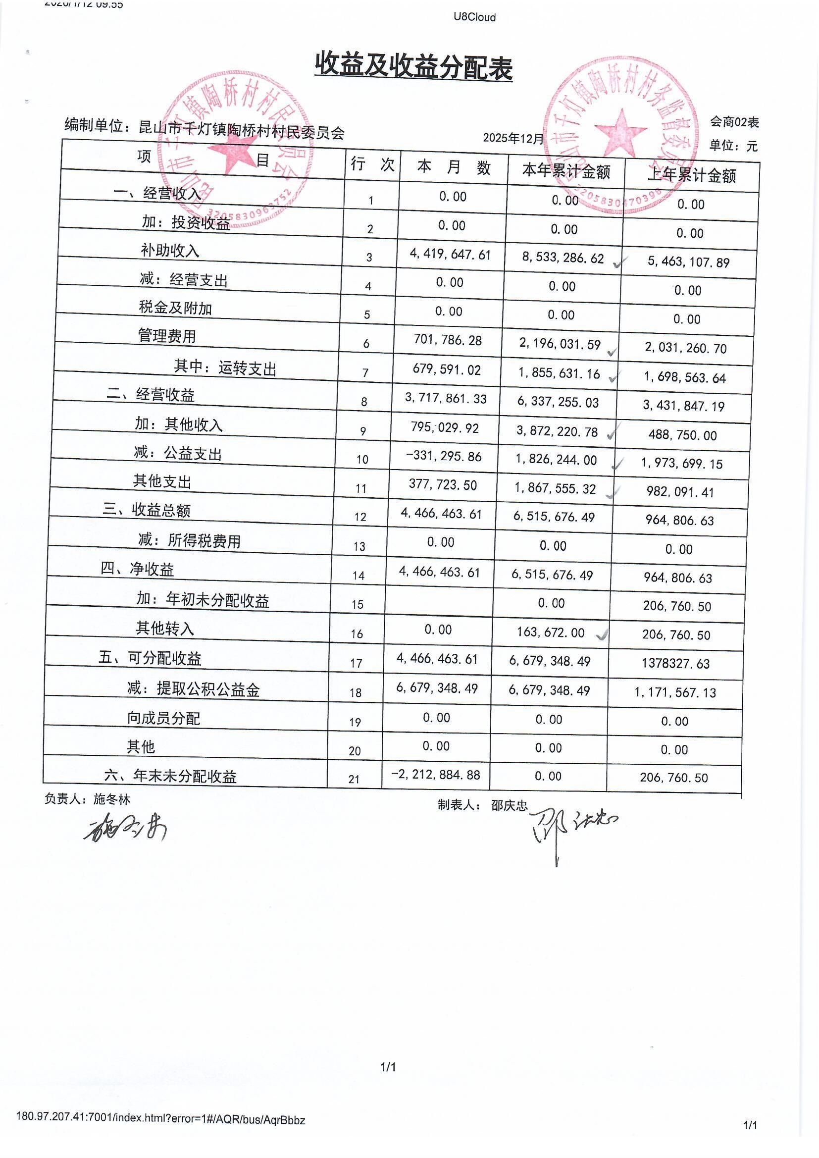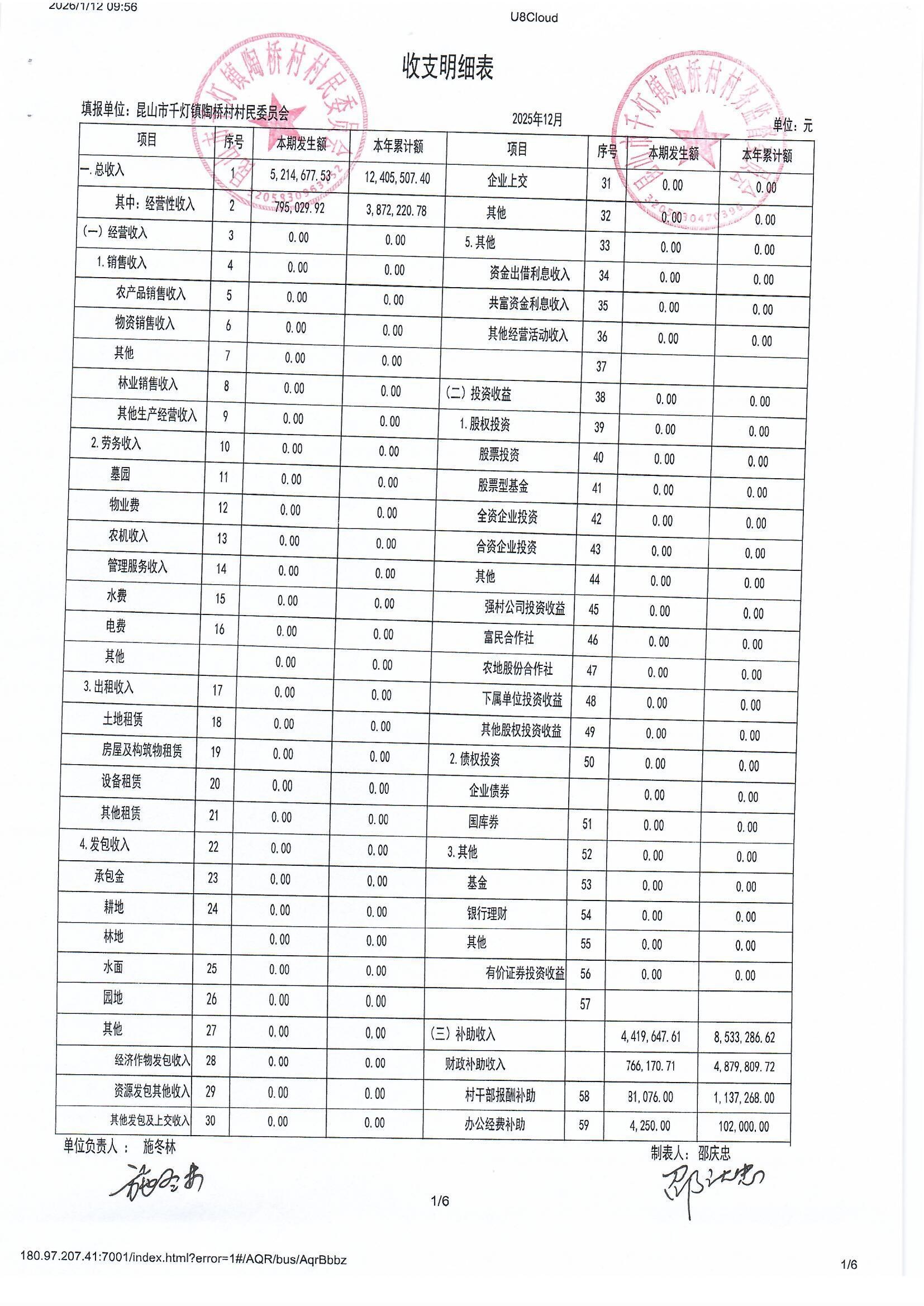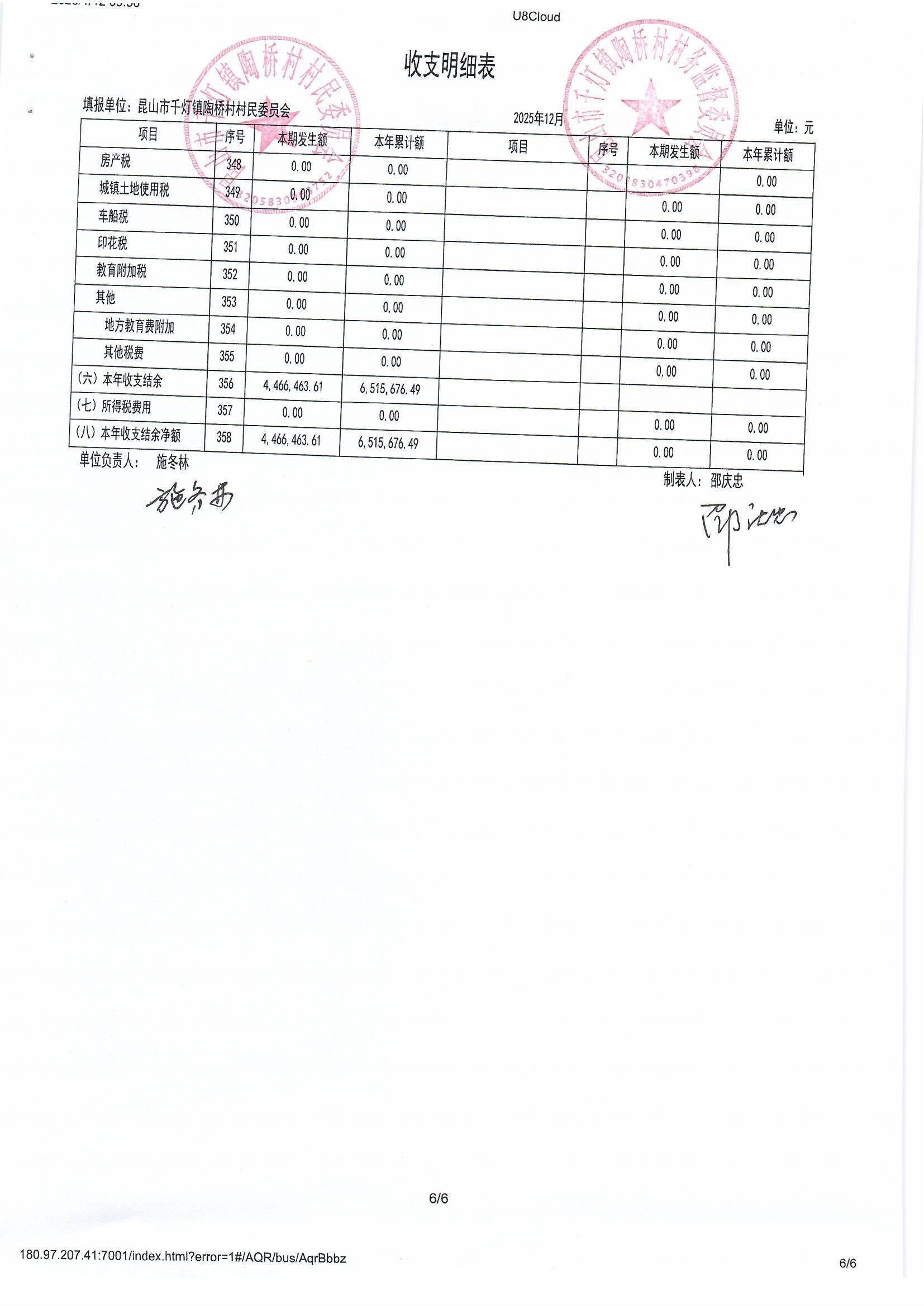 陶桥村村民委员会2025年12月财务公开