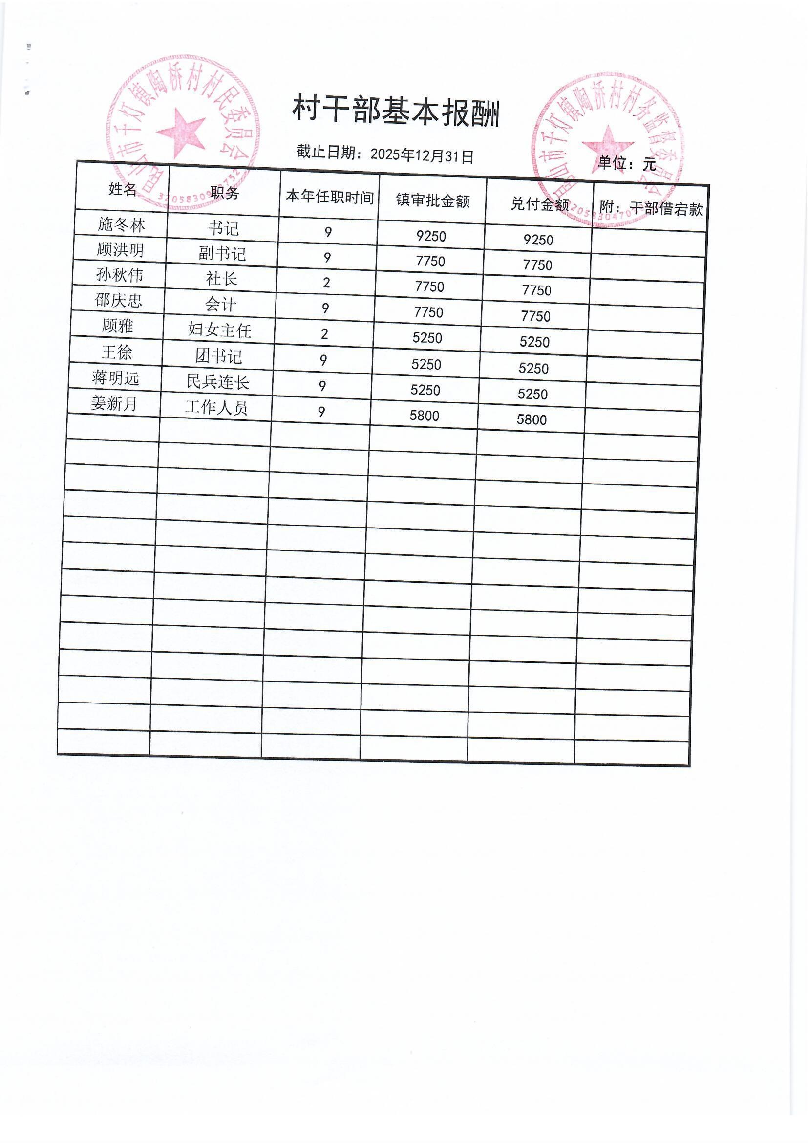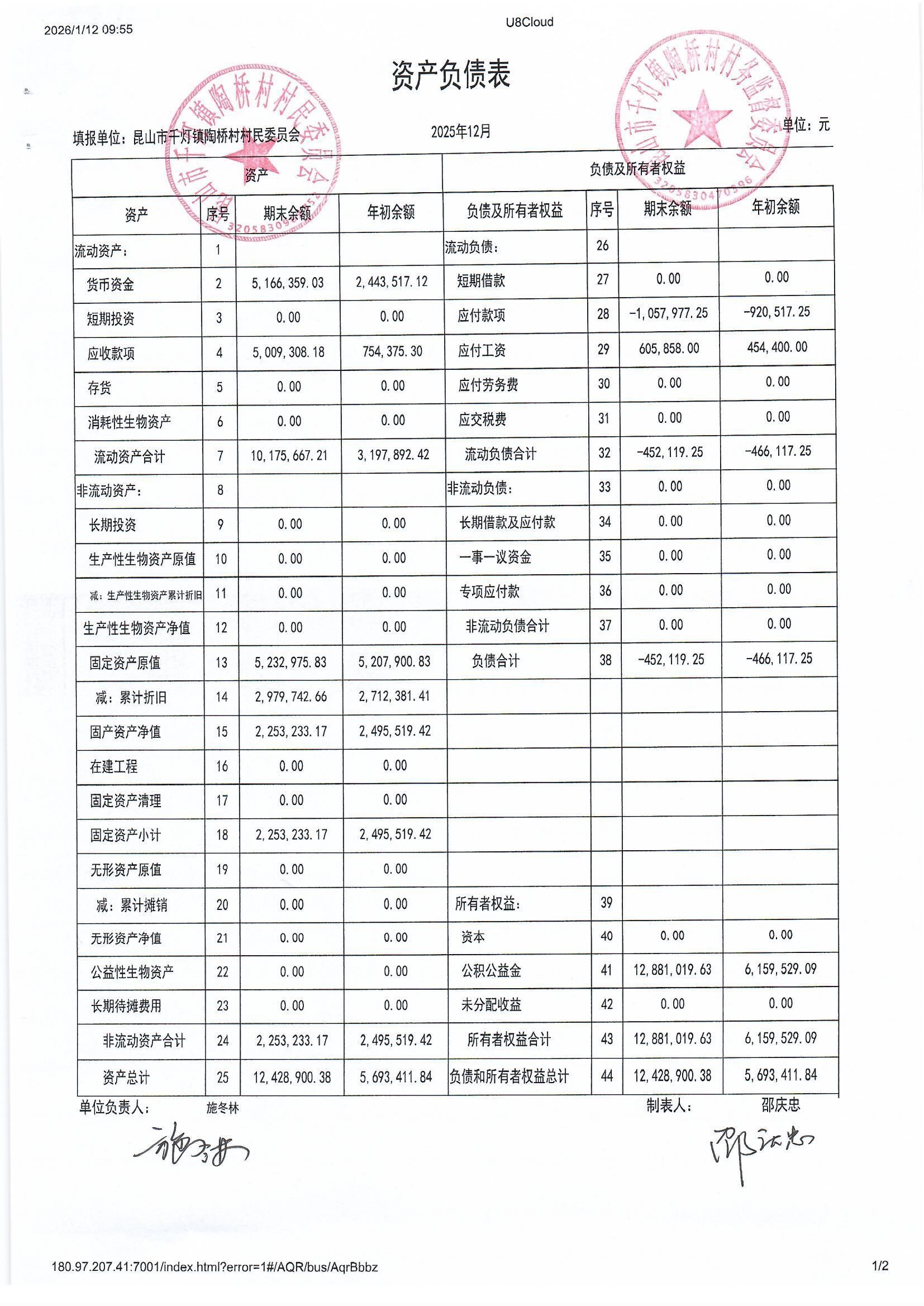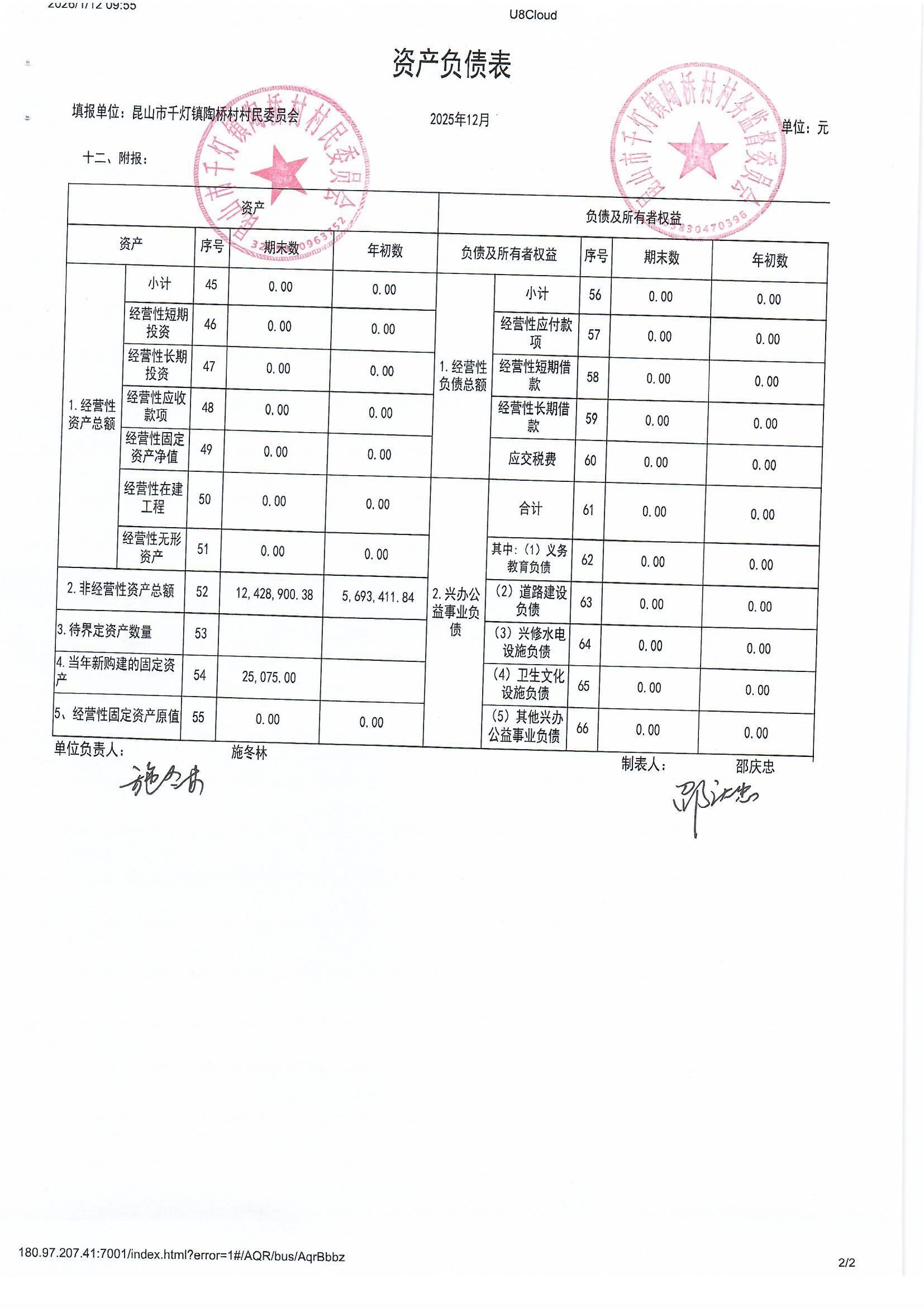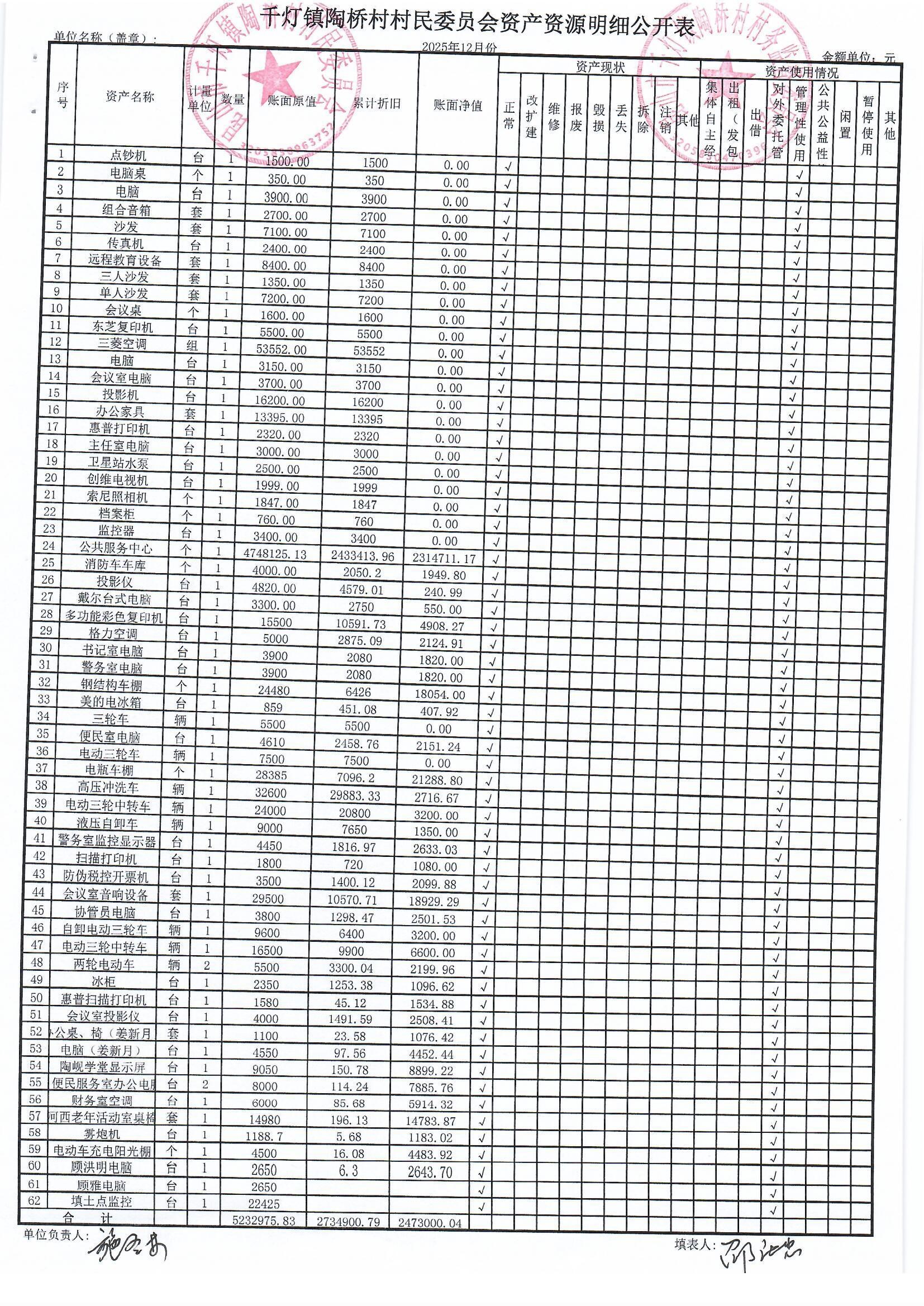 陶桥村村民委员会2025年12月财务公开