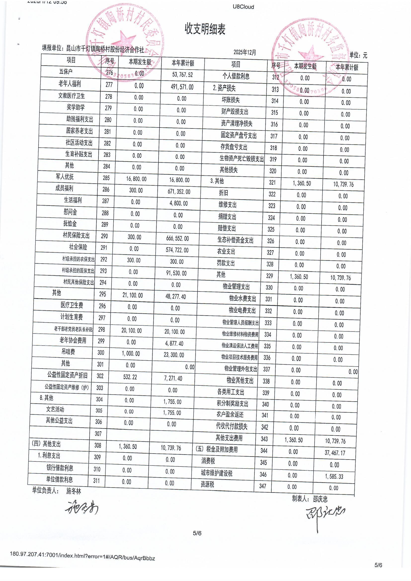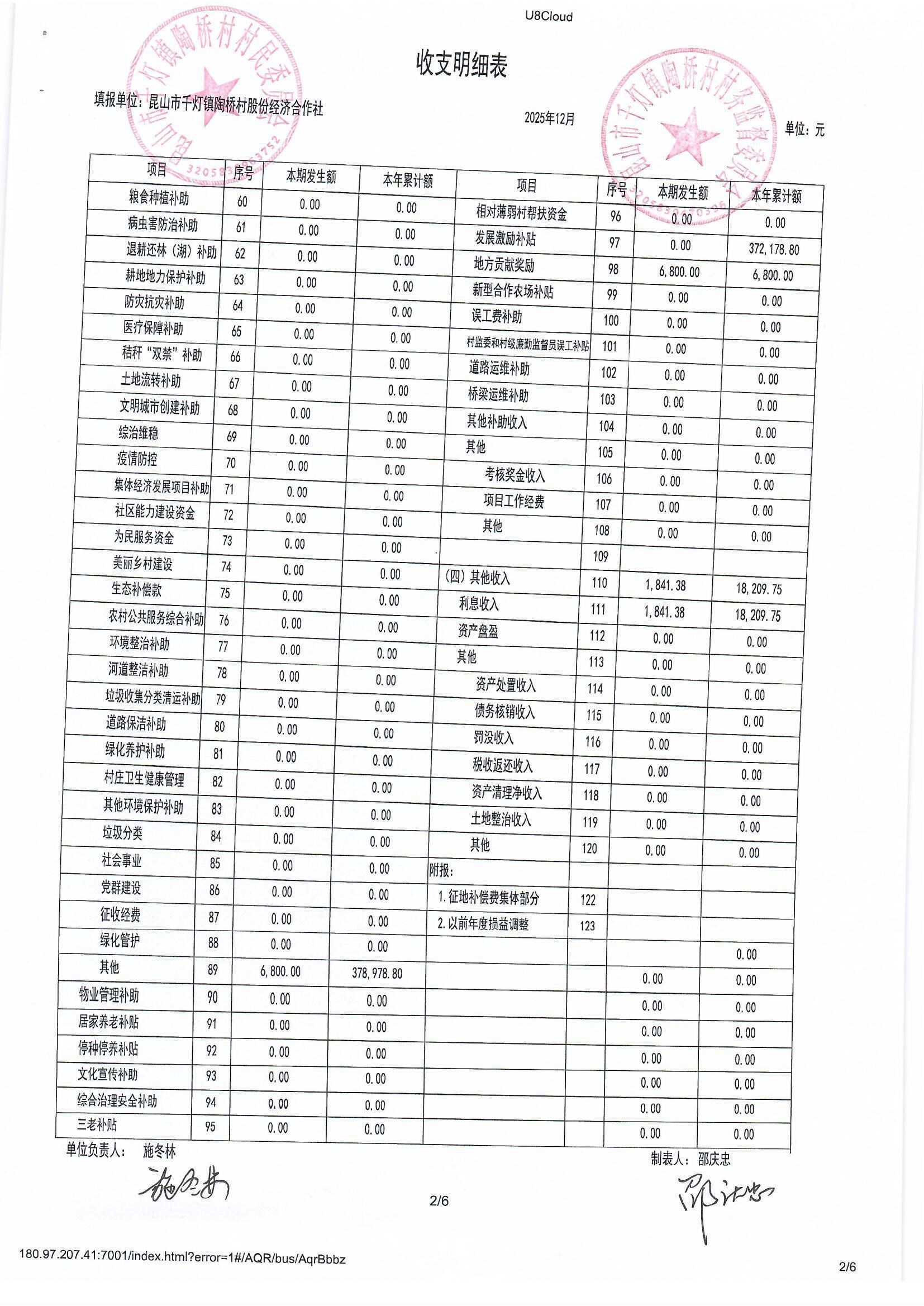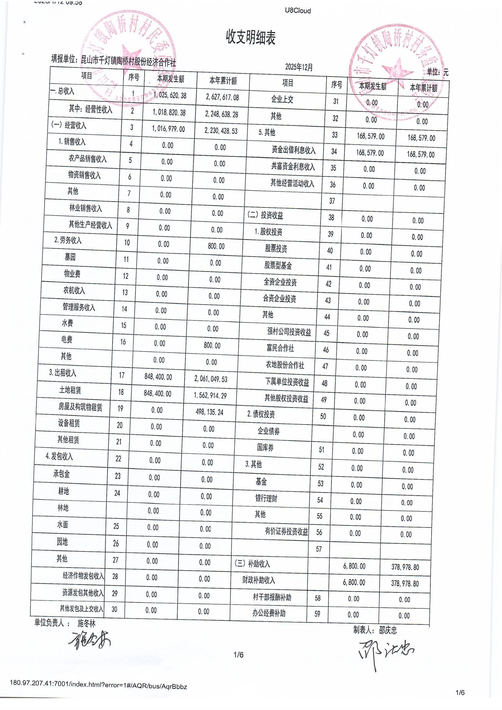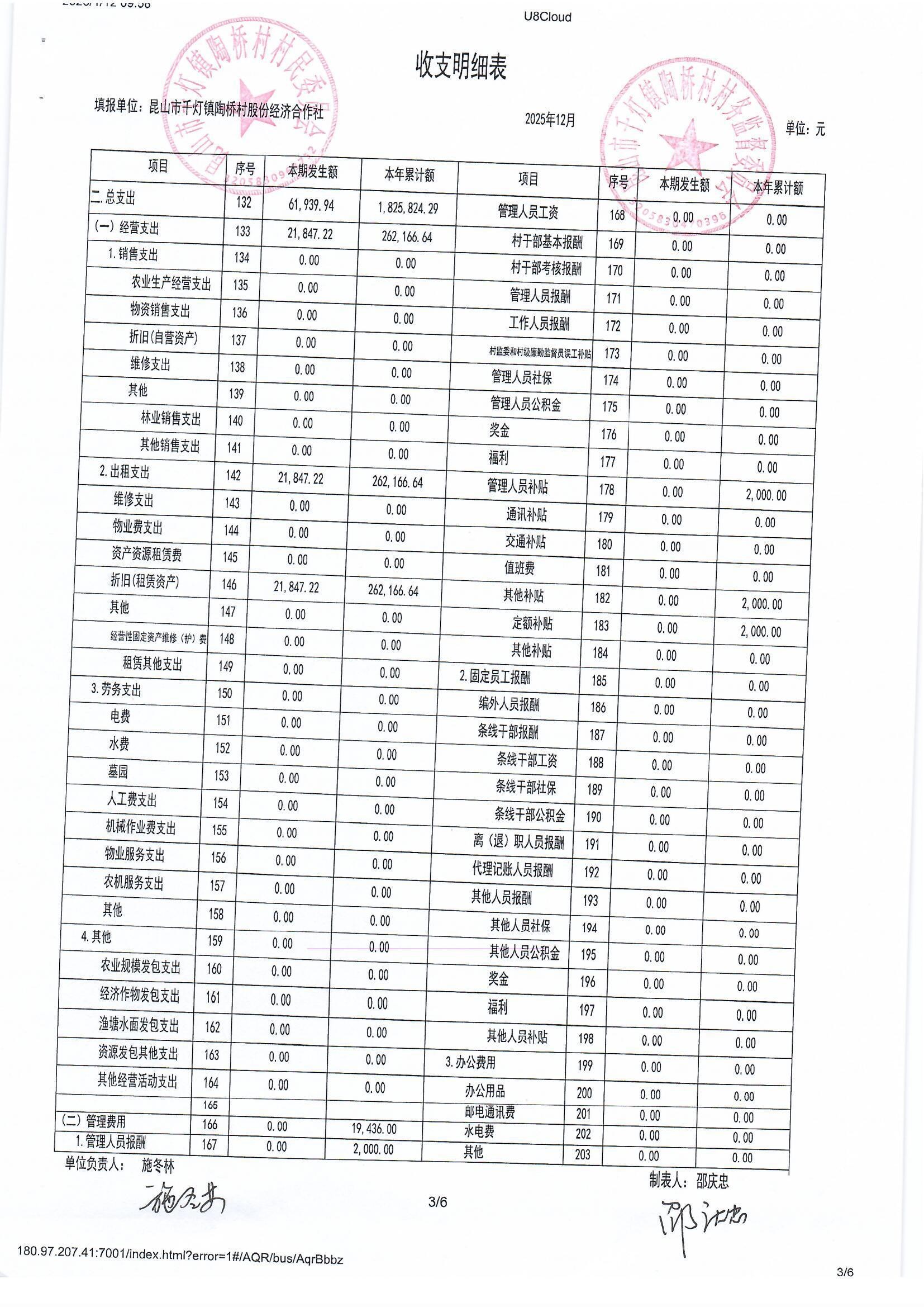 陶桥村股份经济合作社2025年12月财务公开内容: