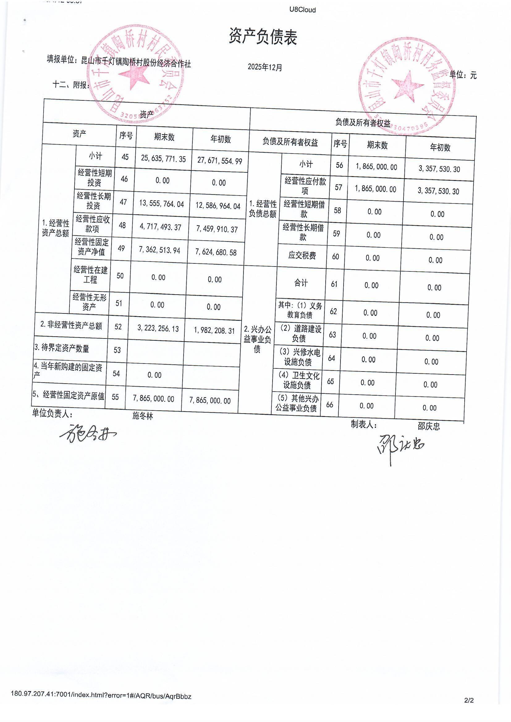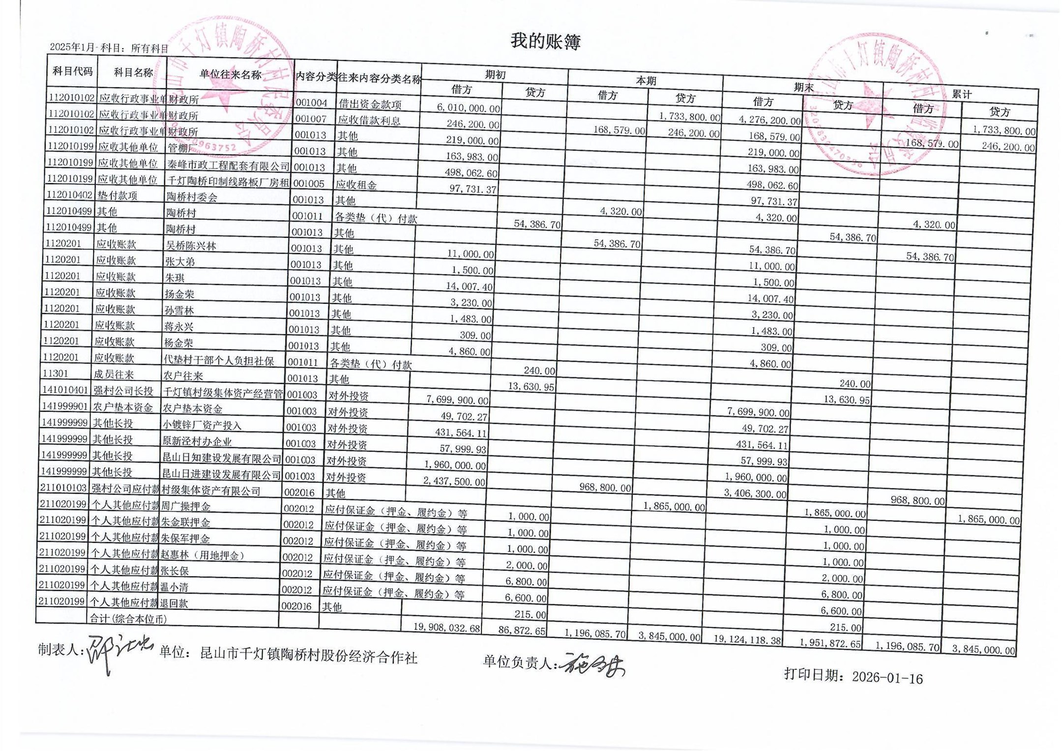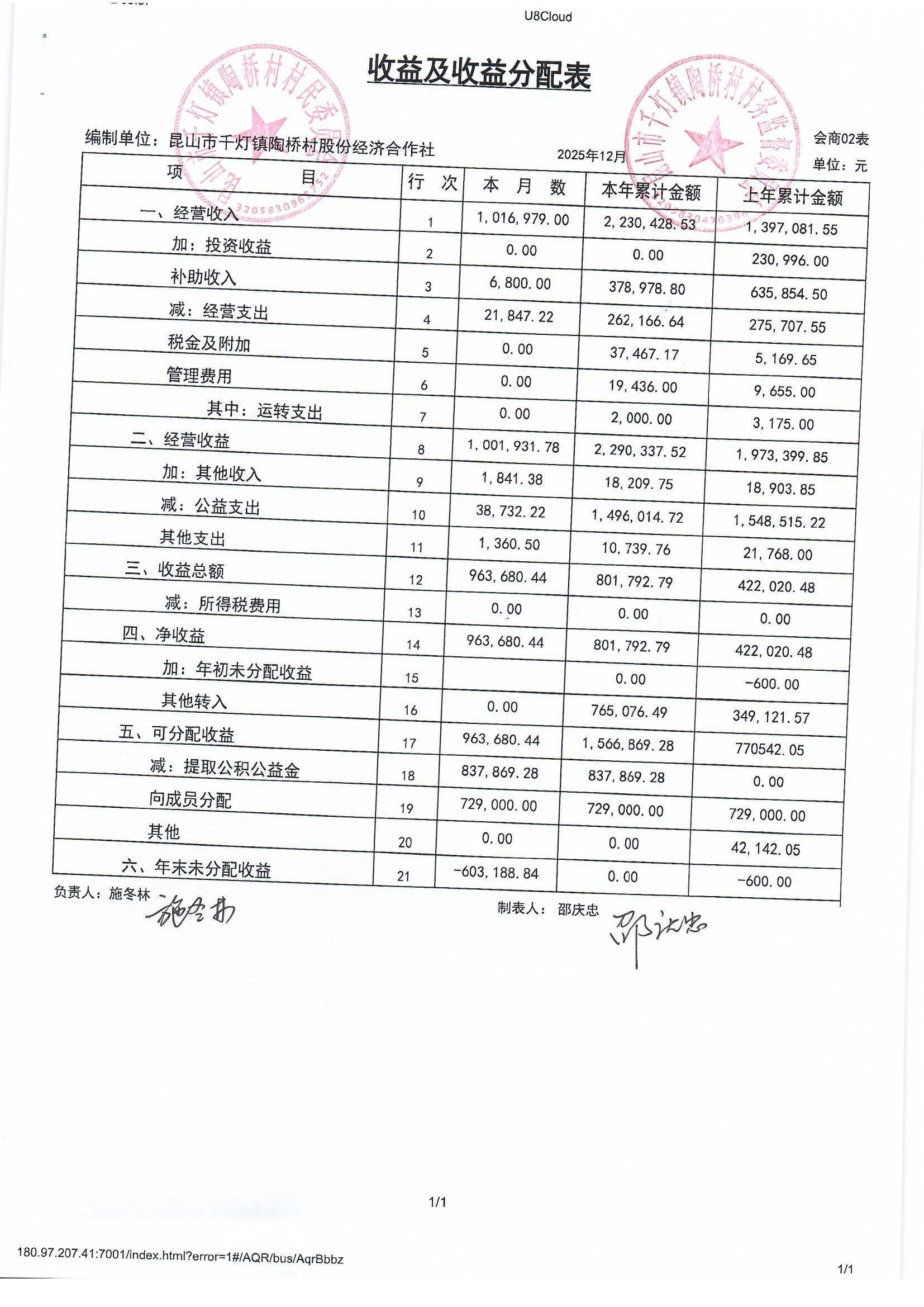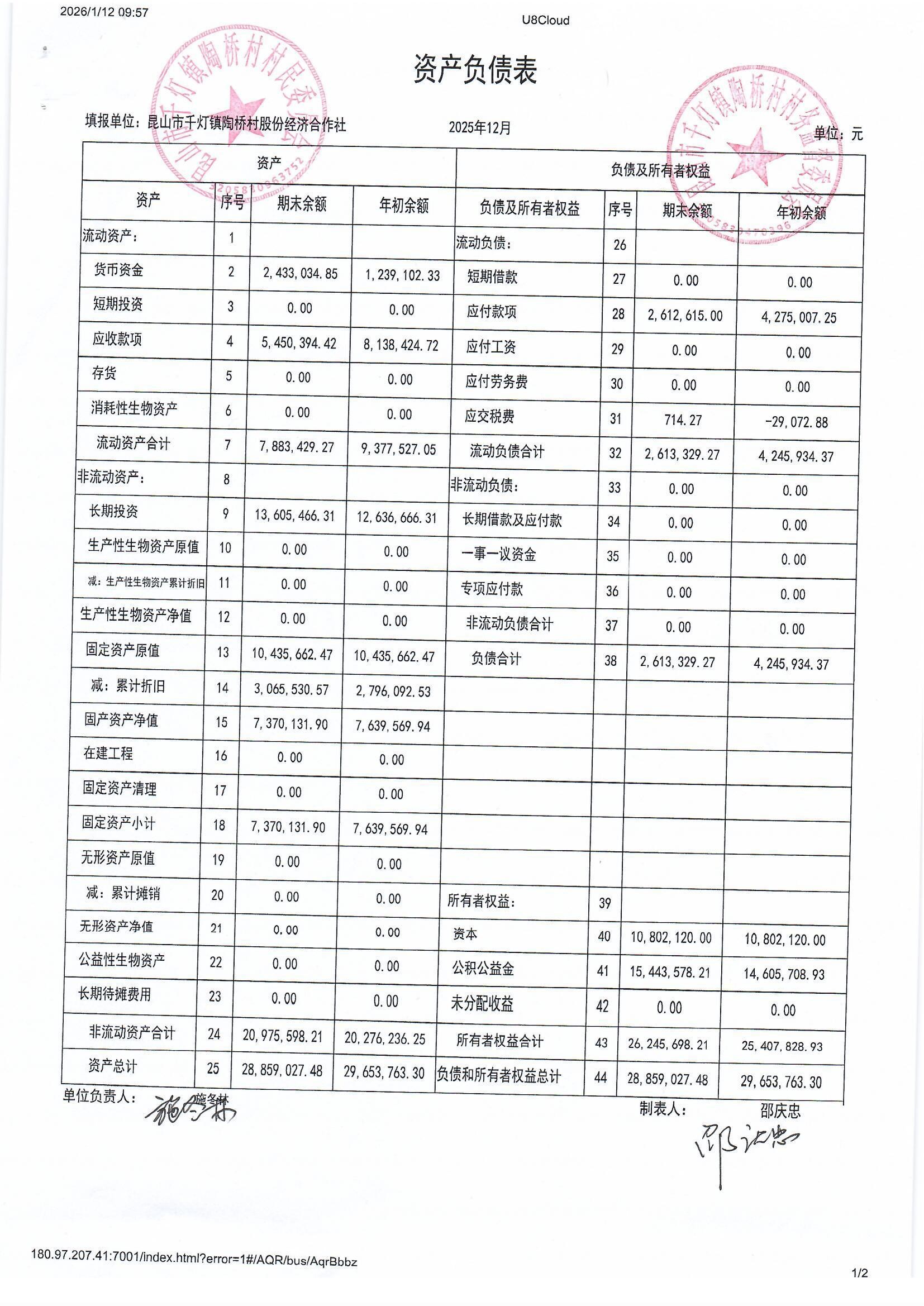 陶桥村股份经济合作社2025年12月财务公开内容:
