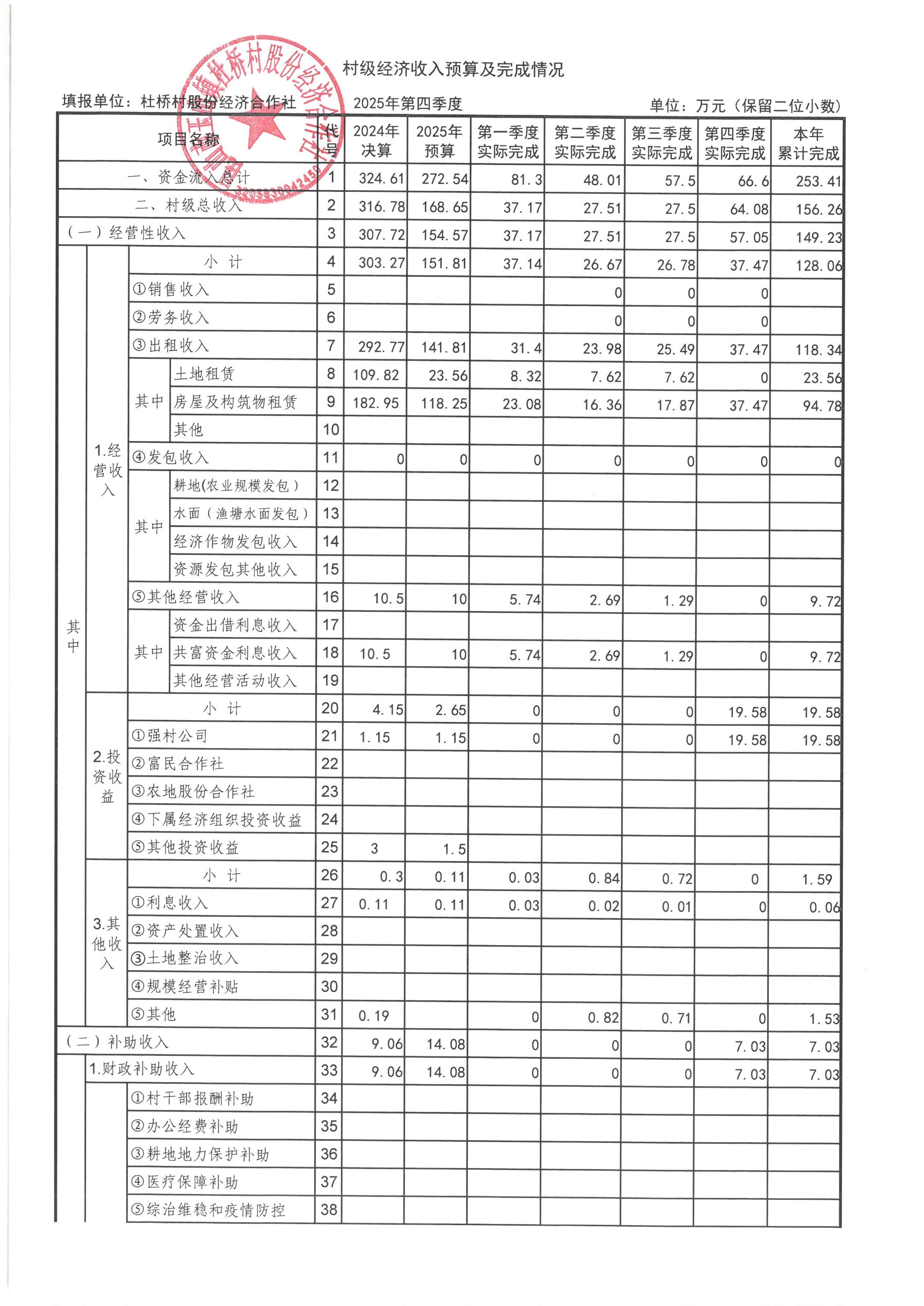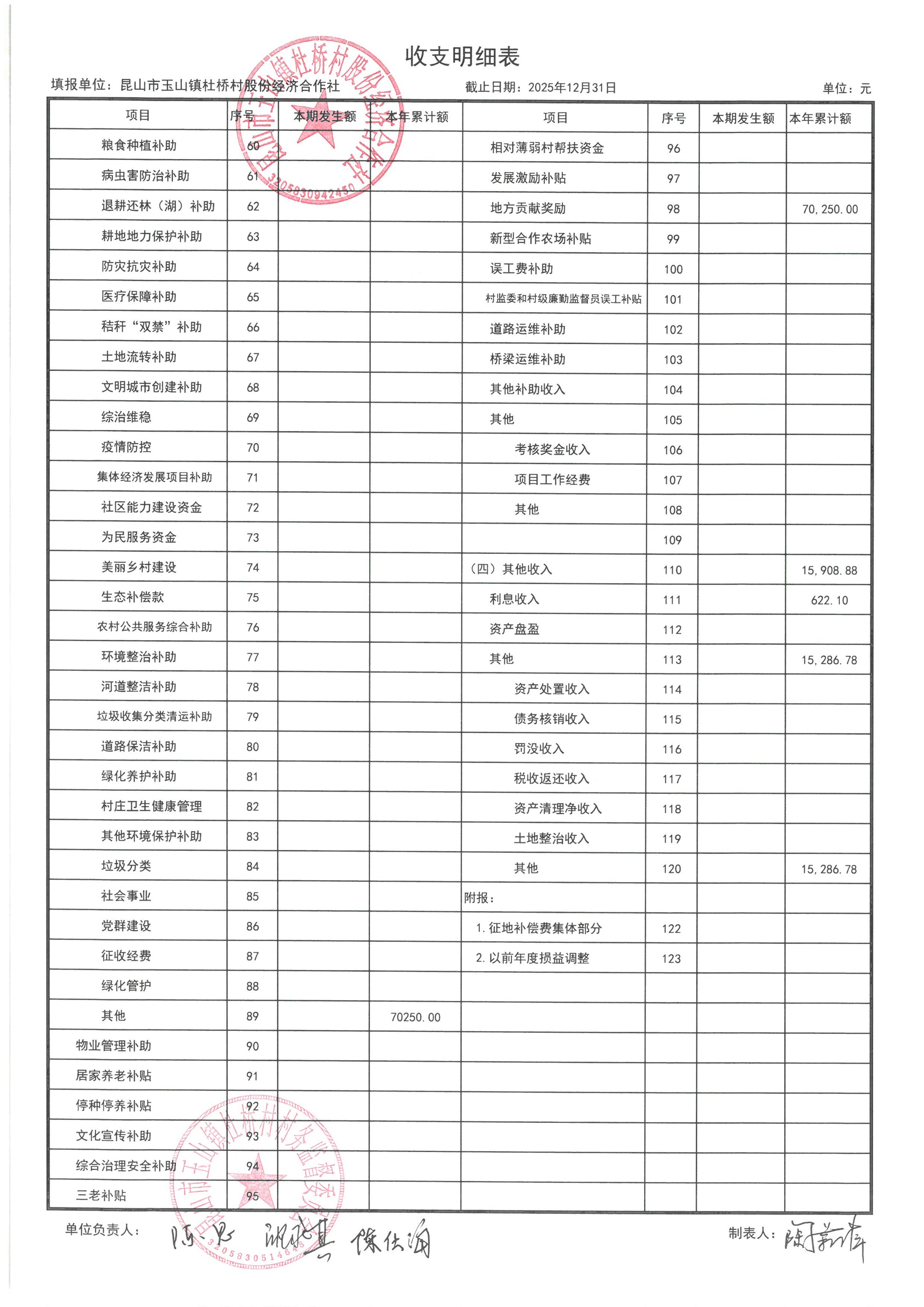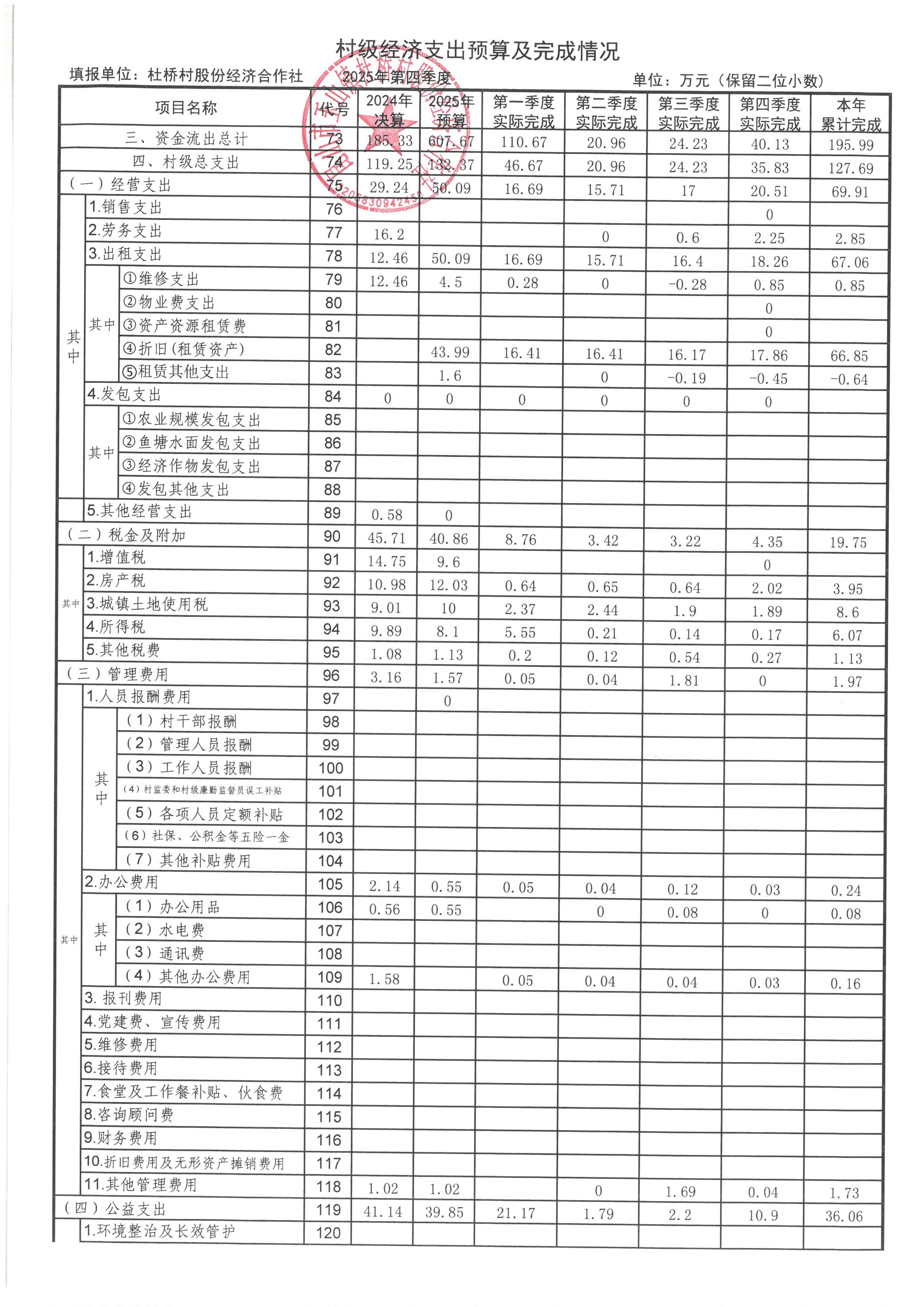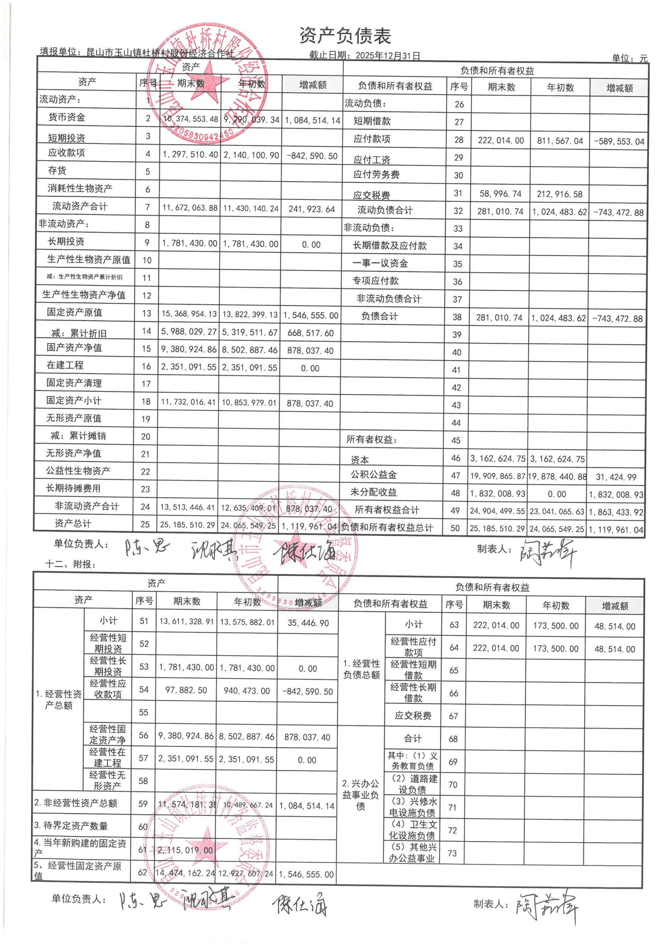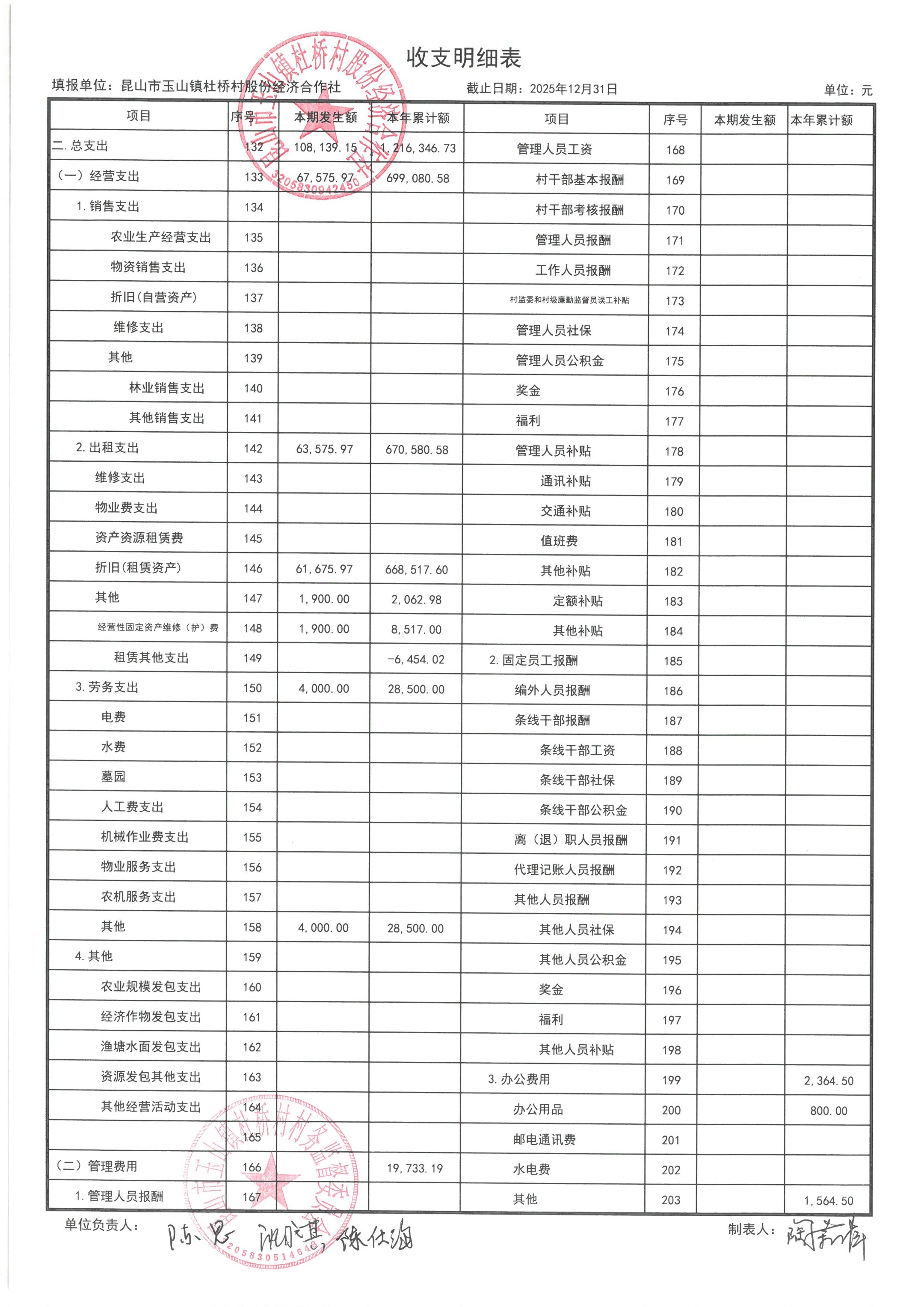 杜桥村股份经济合作社2026年1月份财务公开(2025年12月数据)