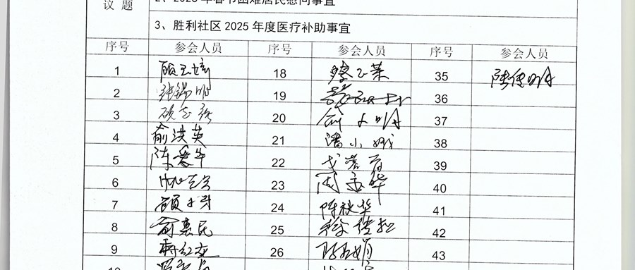 1、2026年春节老年人福利发放事宜 2、2026年春节困难居民慰问事宜 3、胜利社区2025年度医疗补助事宜