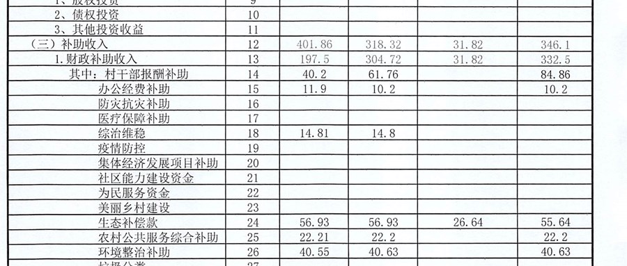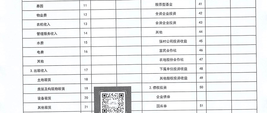 1、资产负债表; 2、收益分配表;3、收支明细表; 4、往来明细;5、固定资产明细;6、村干部基本报酬; 7、村级经济收入预算及完成情况;8、村级经济支出预算及完成情况;