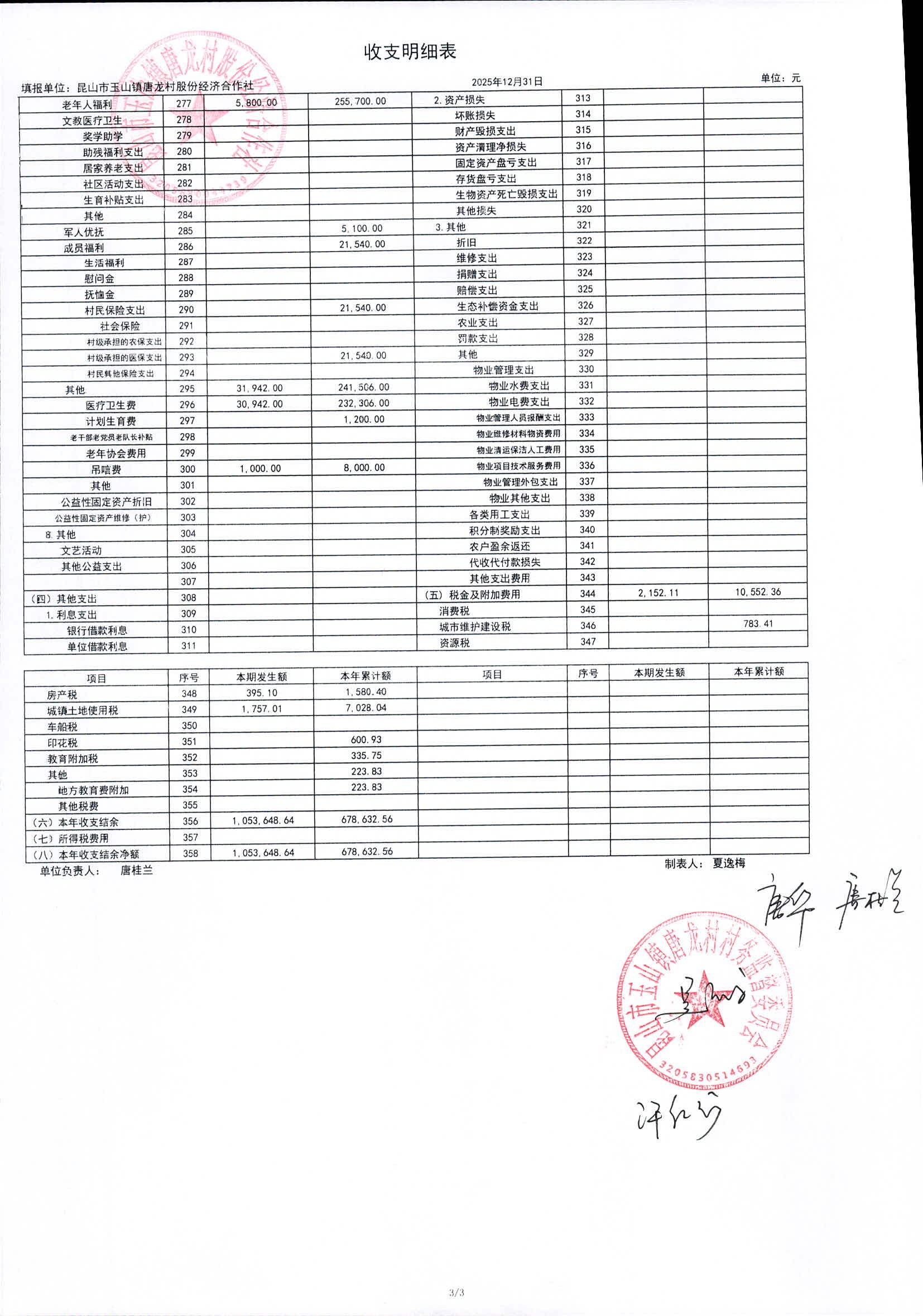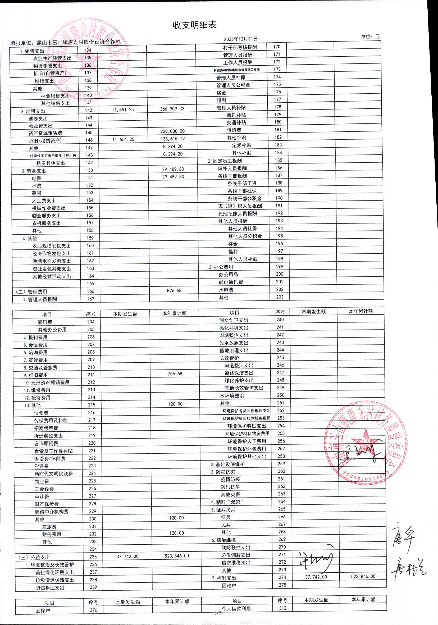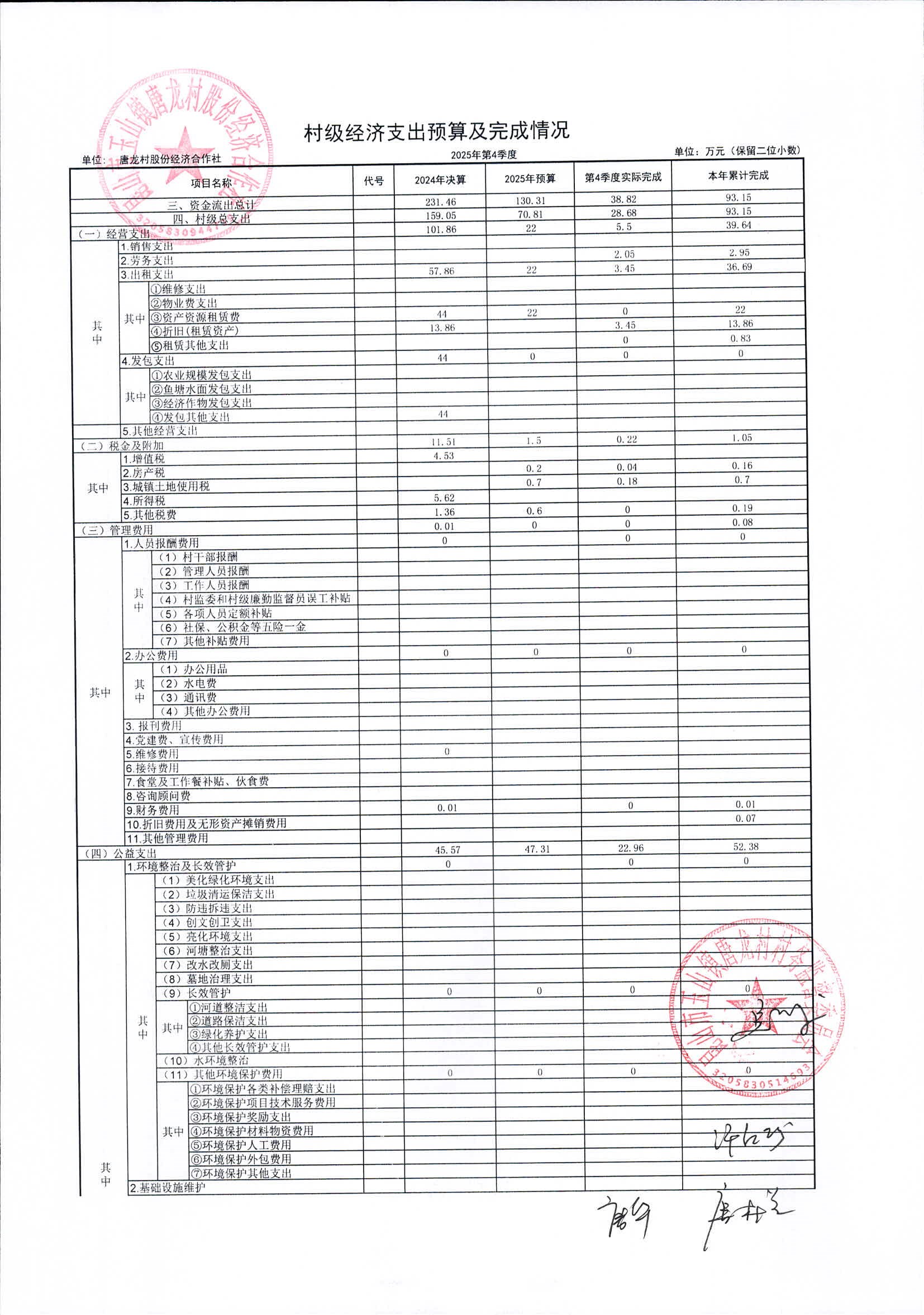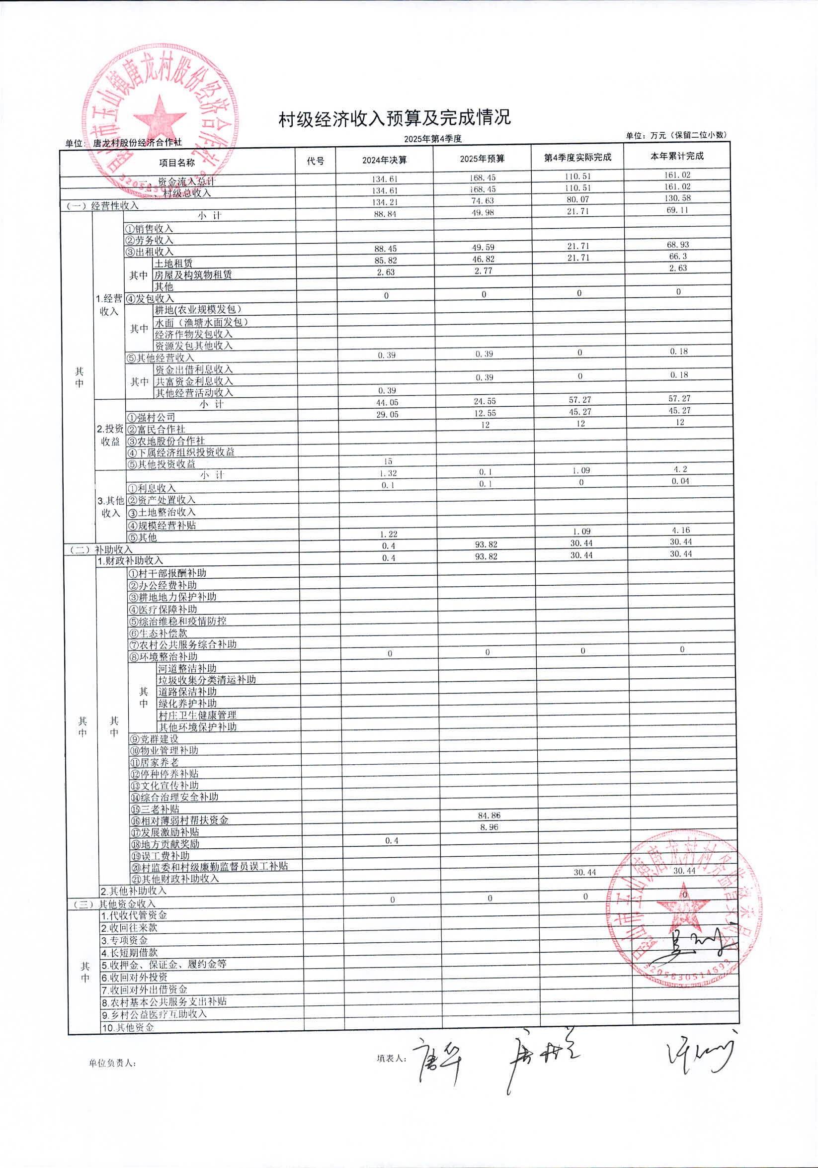 2025年12月唐龙村股份财务公开及村级经济第4季度收入支出预算完成情况