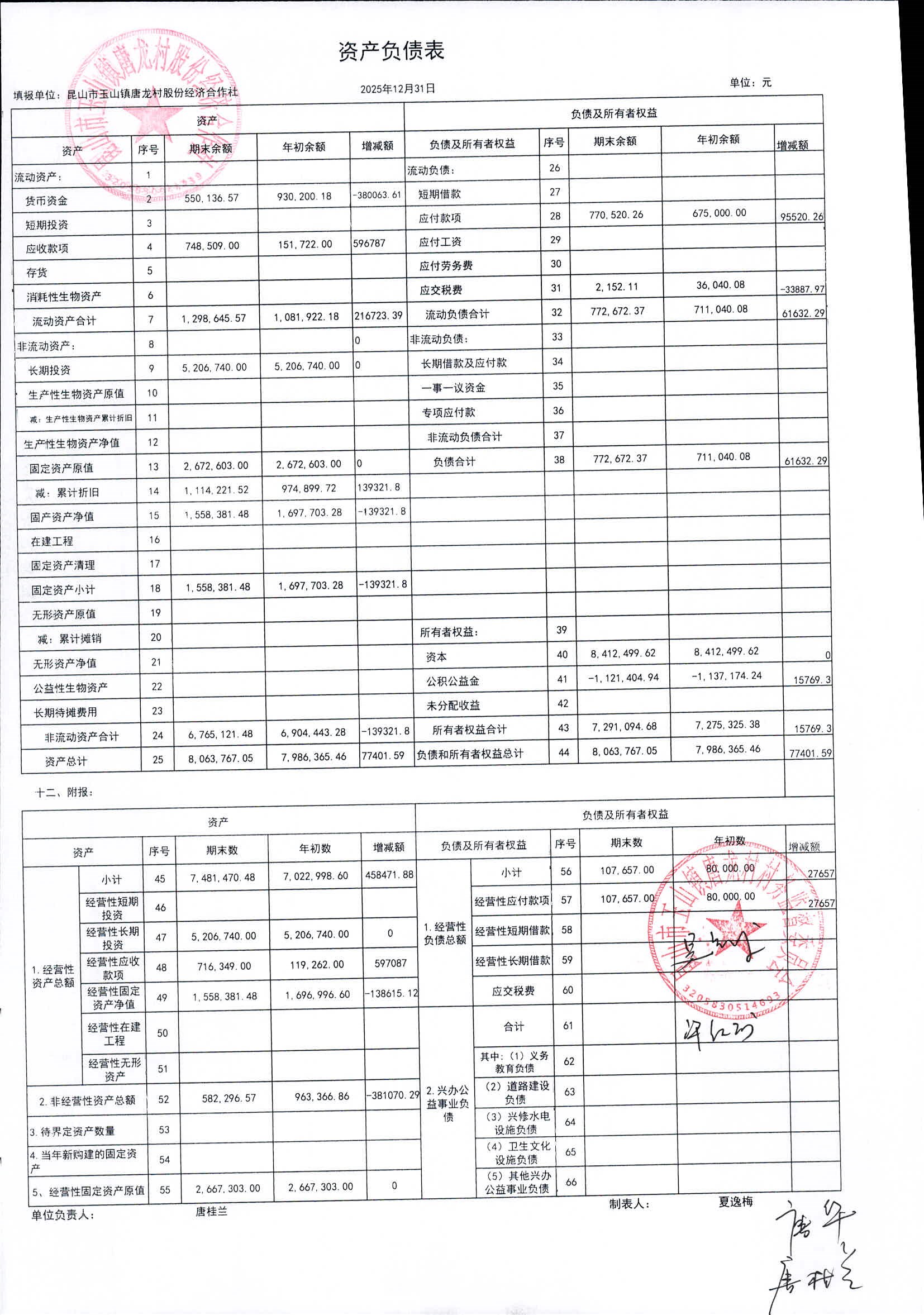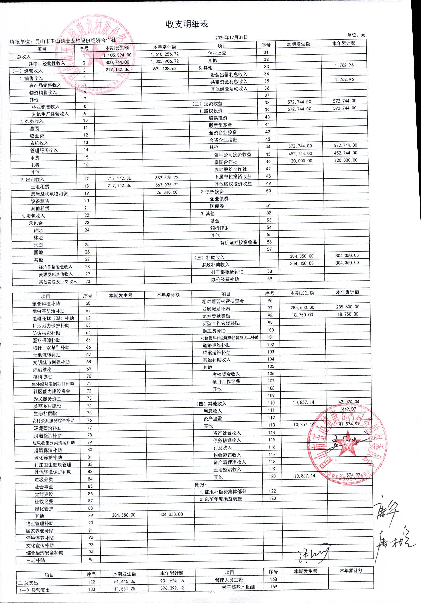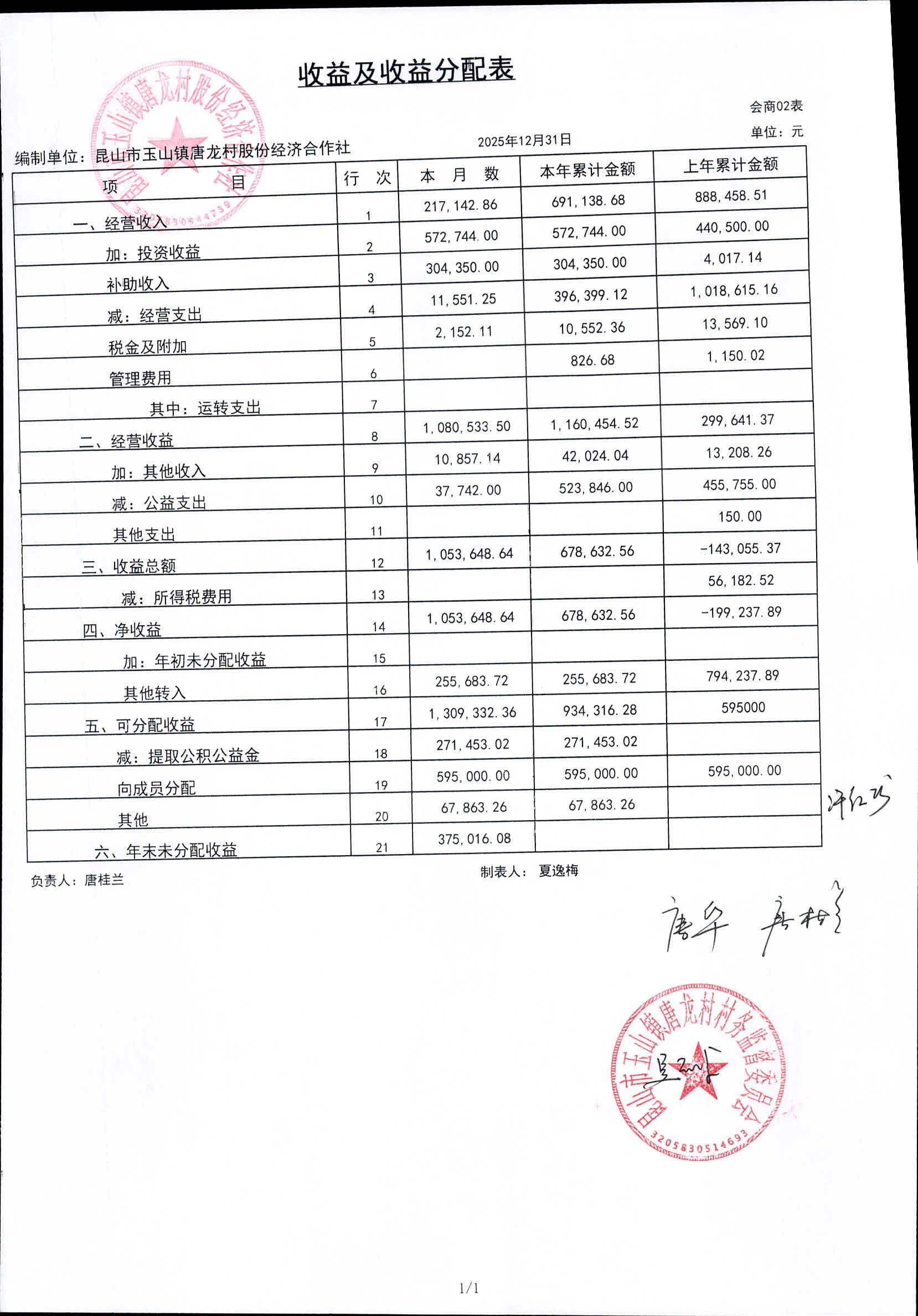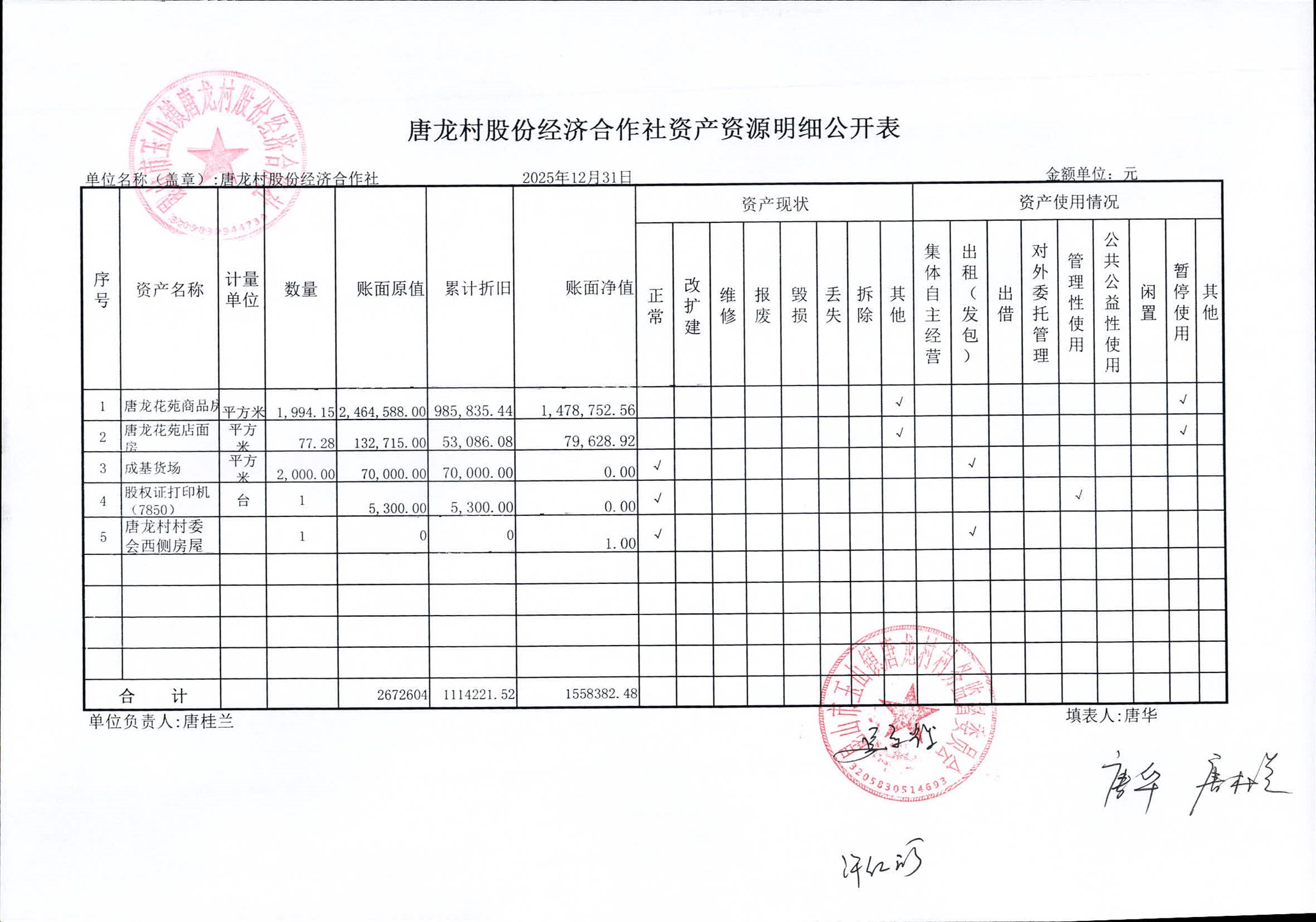 2025年12月唐龙村股份财务公开及村级经济第4季度收入支出预算完成情况