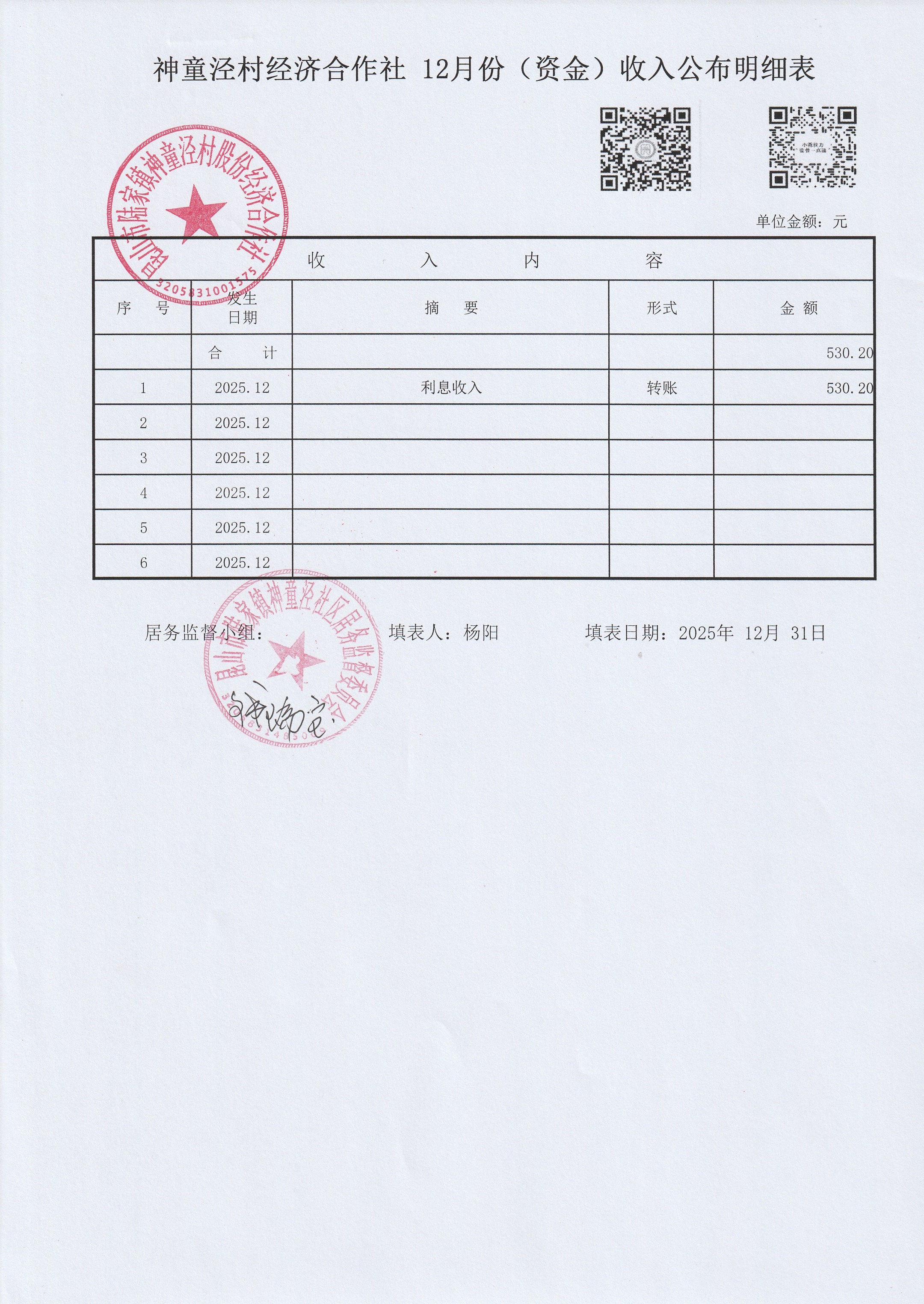神童泾村股份经济合作社12月份(资金)收支公布明细表