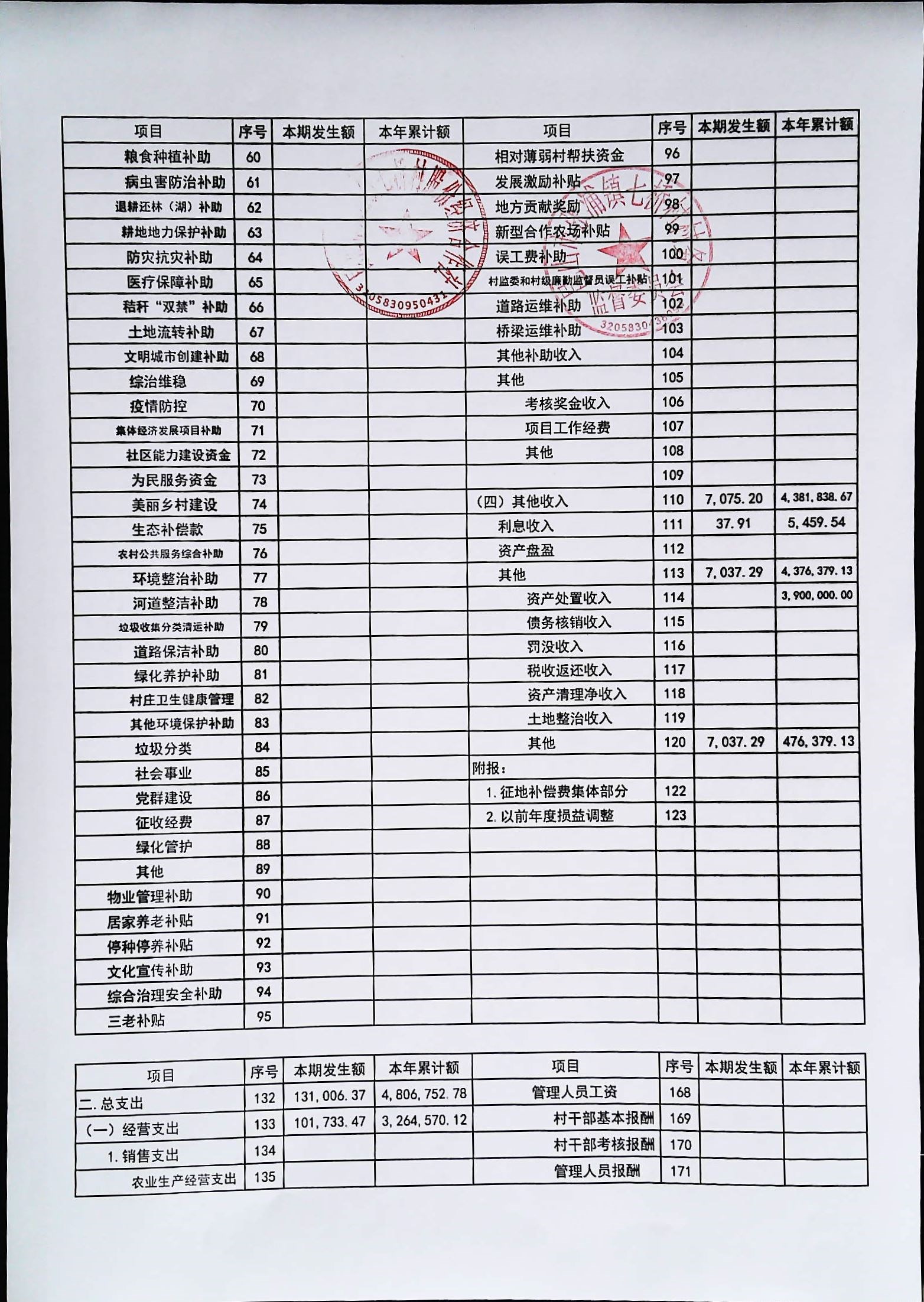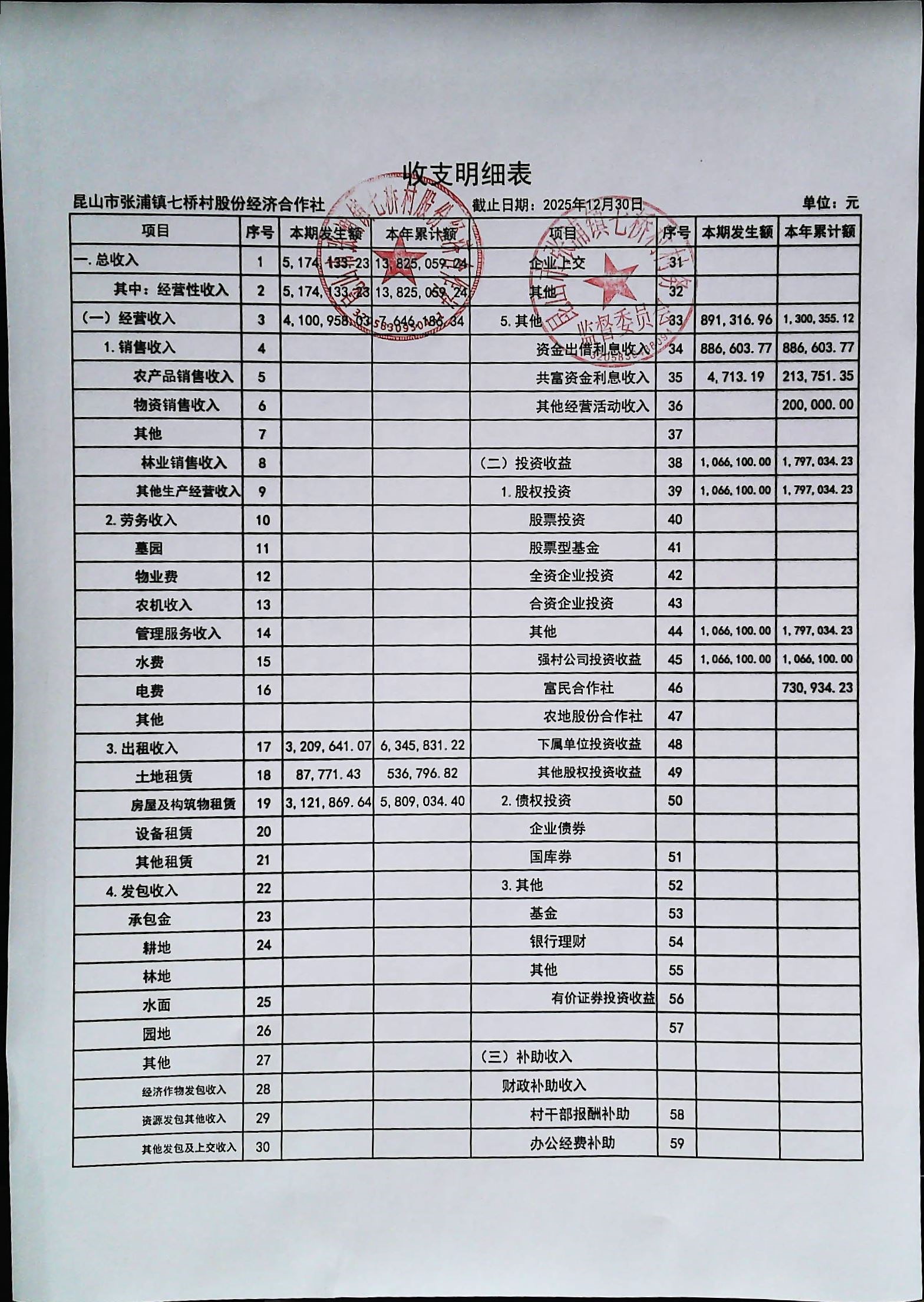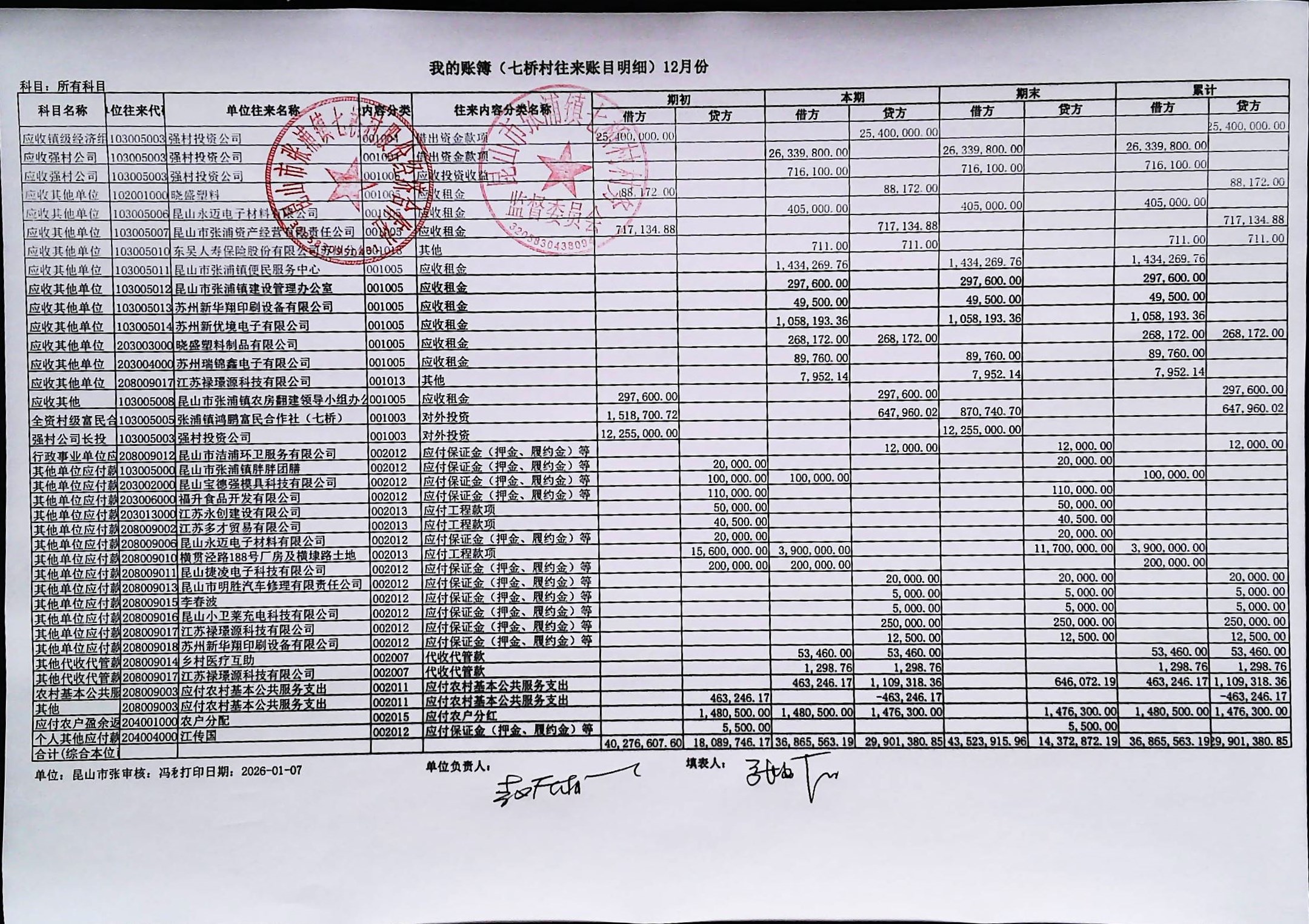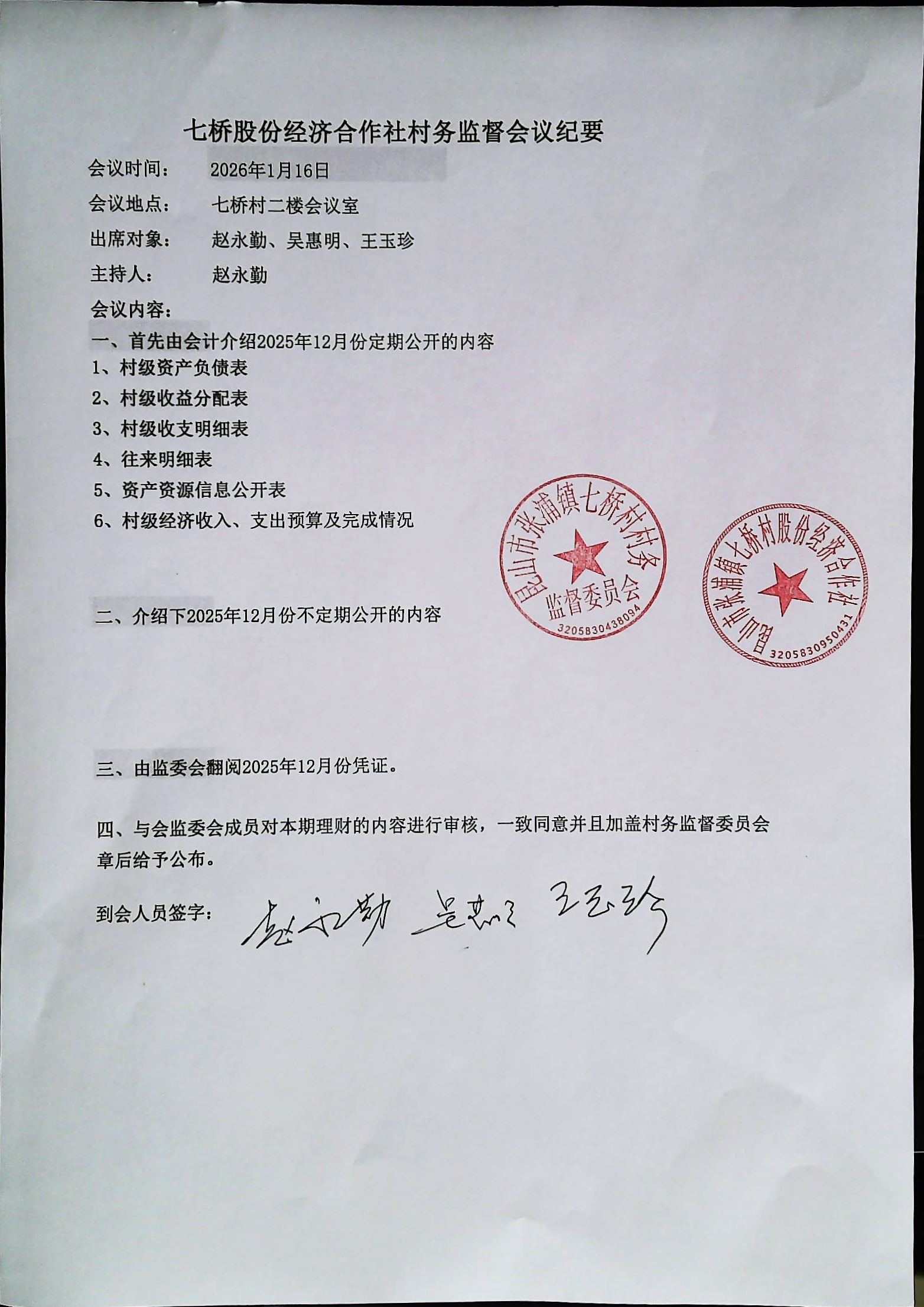 七桥村股份经济合作社2026年1月份财务公开