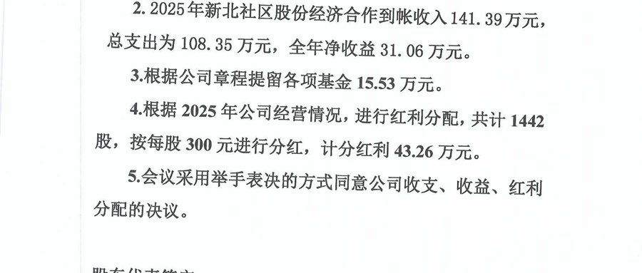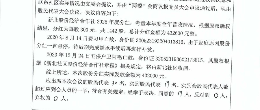 2025年新北股份合作社分红方案及会议公示