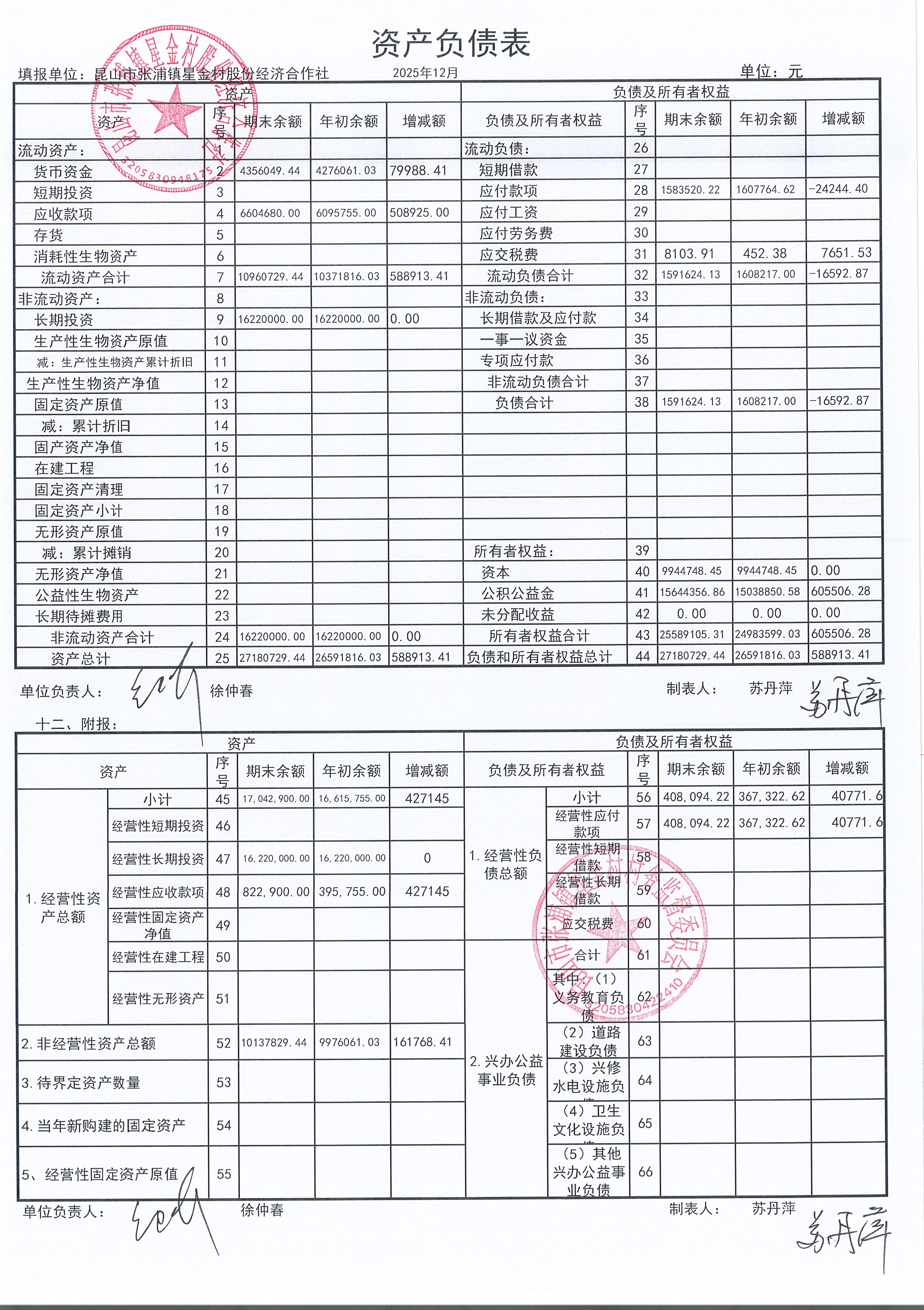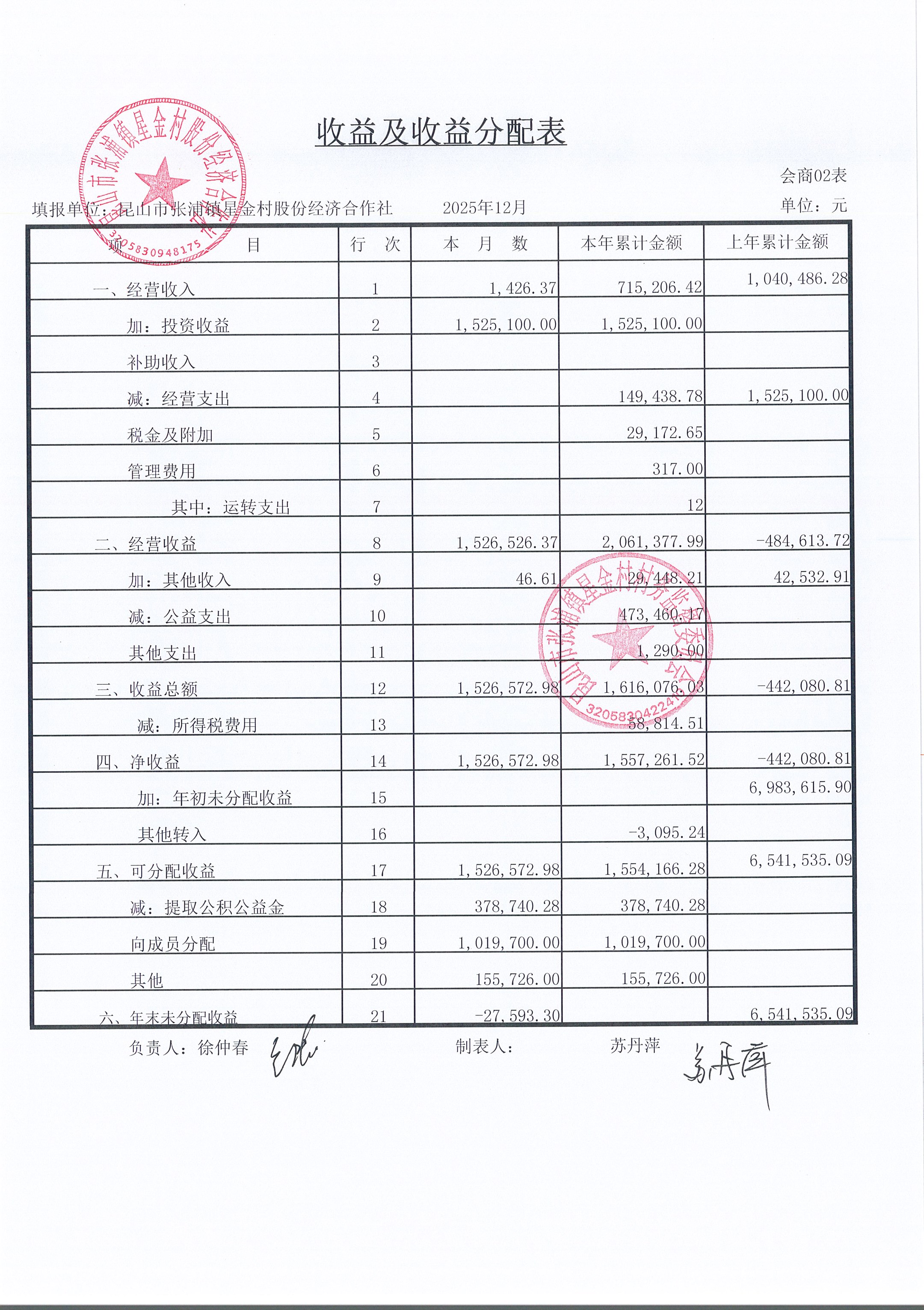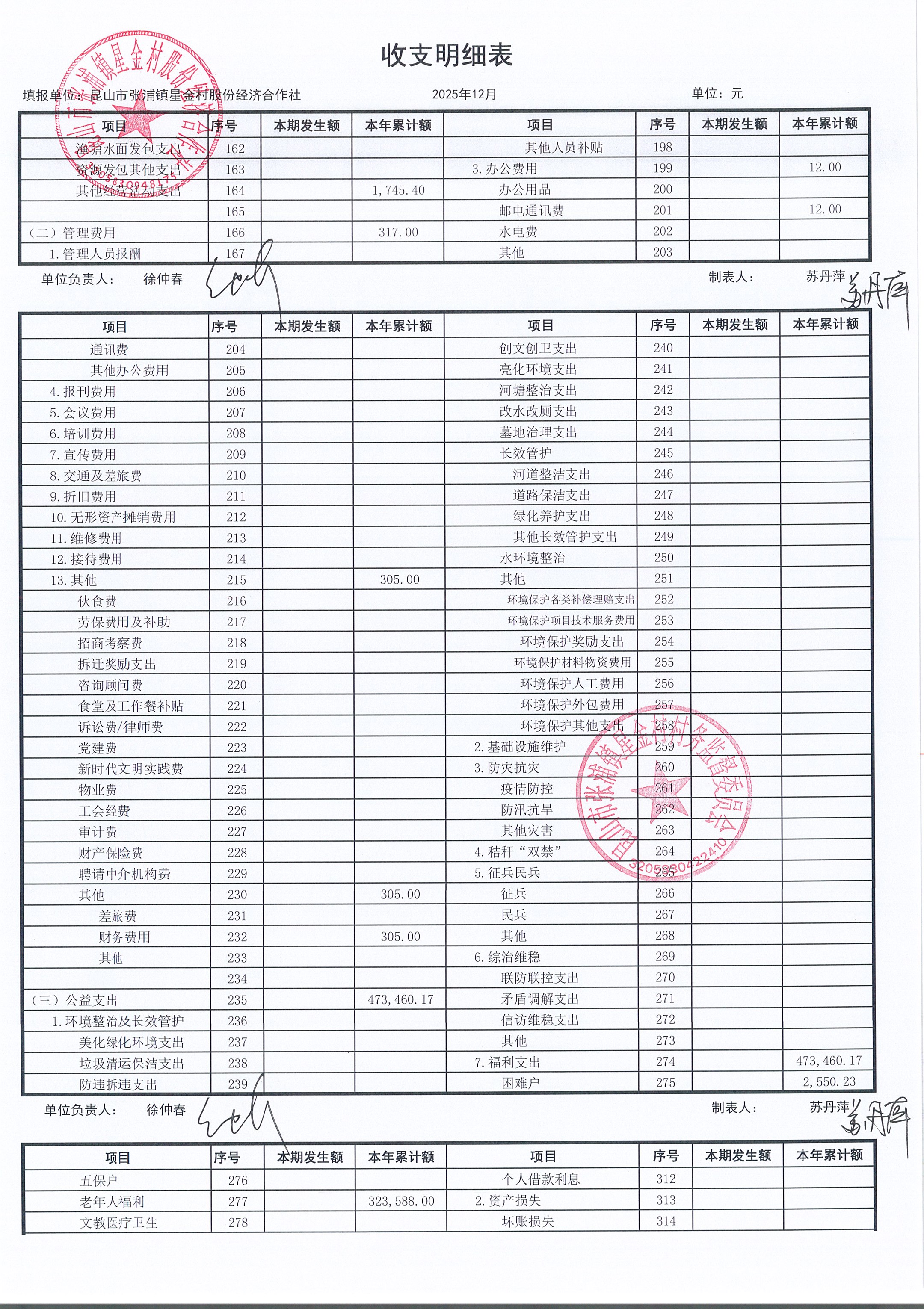 星金村股份经济合作社2025年12月财务公开