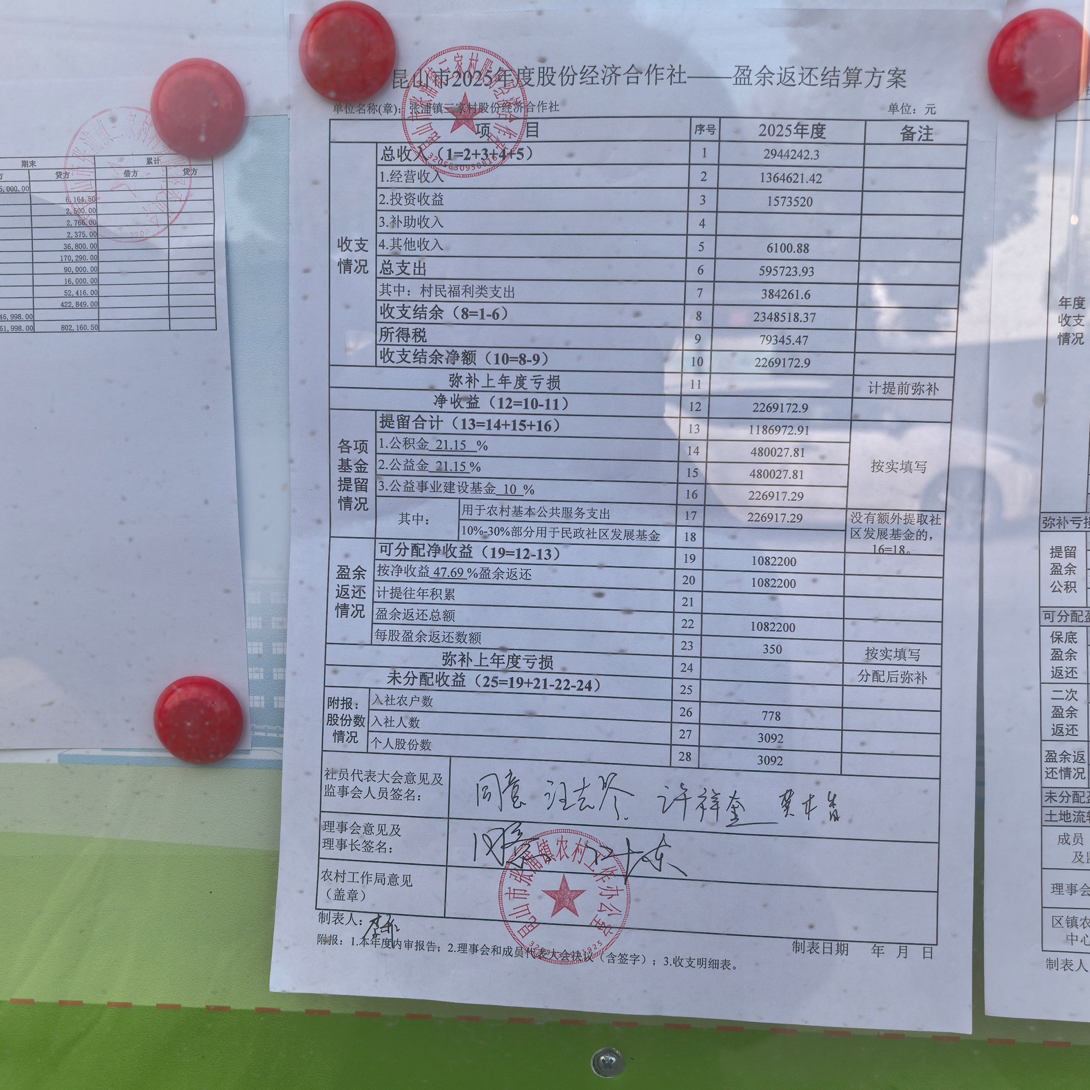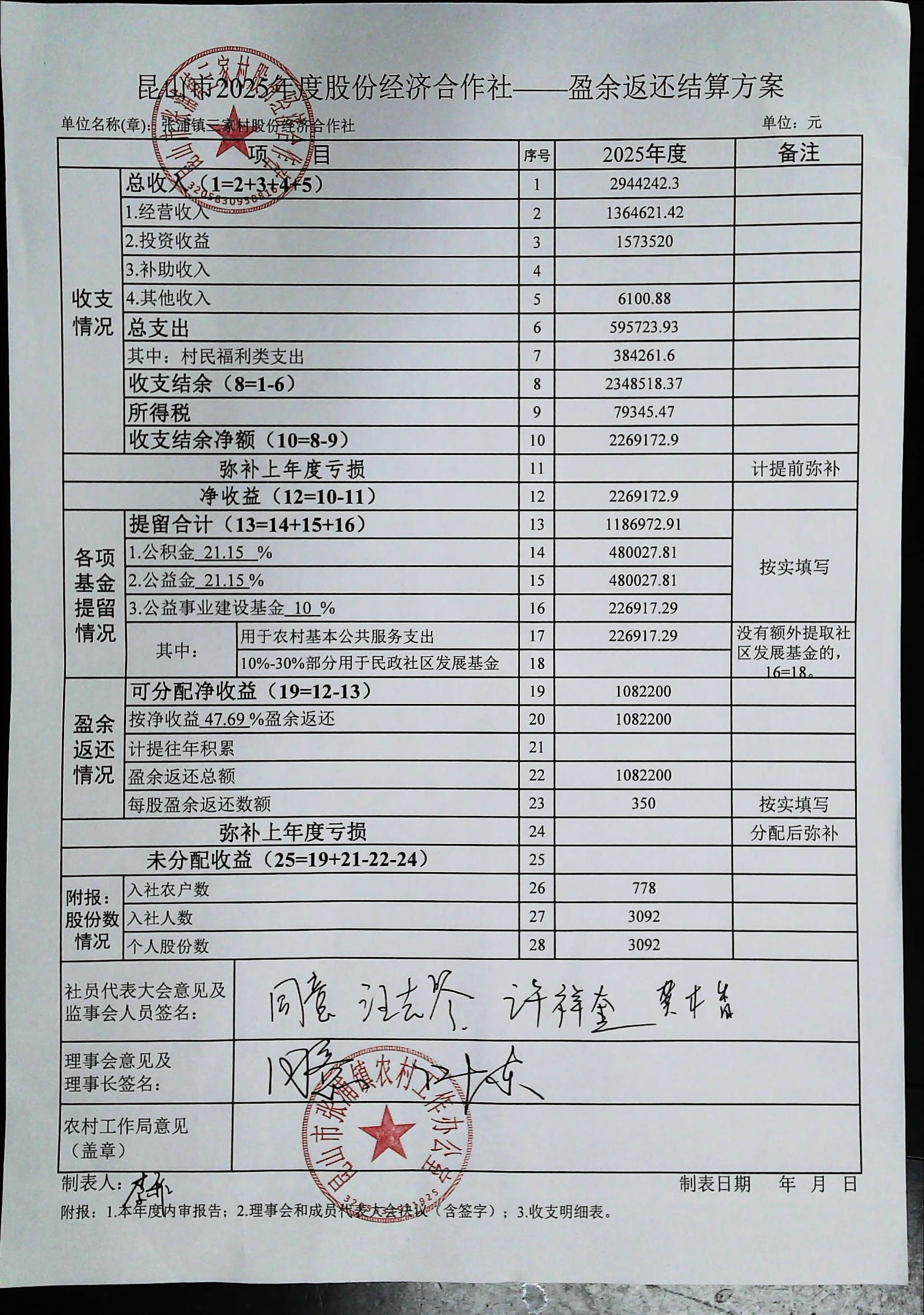 三家村股份经济合作社盈余返还方案