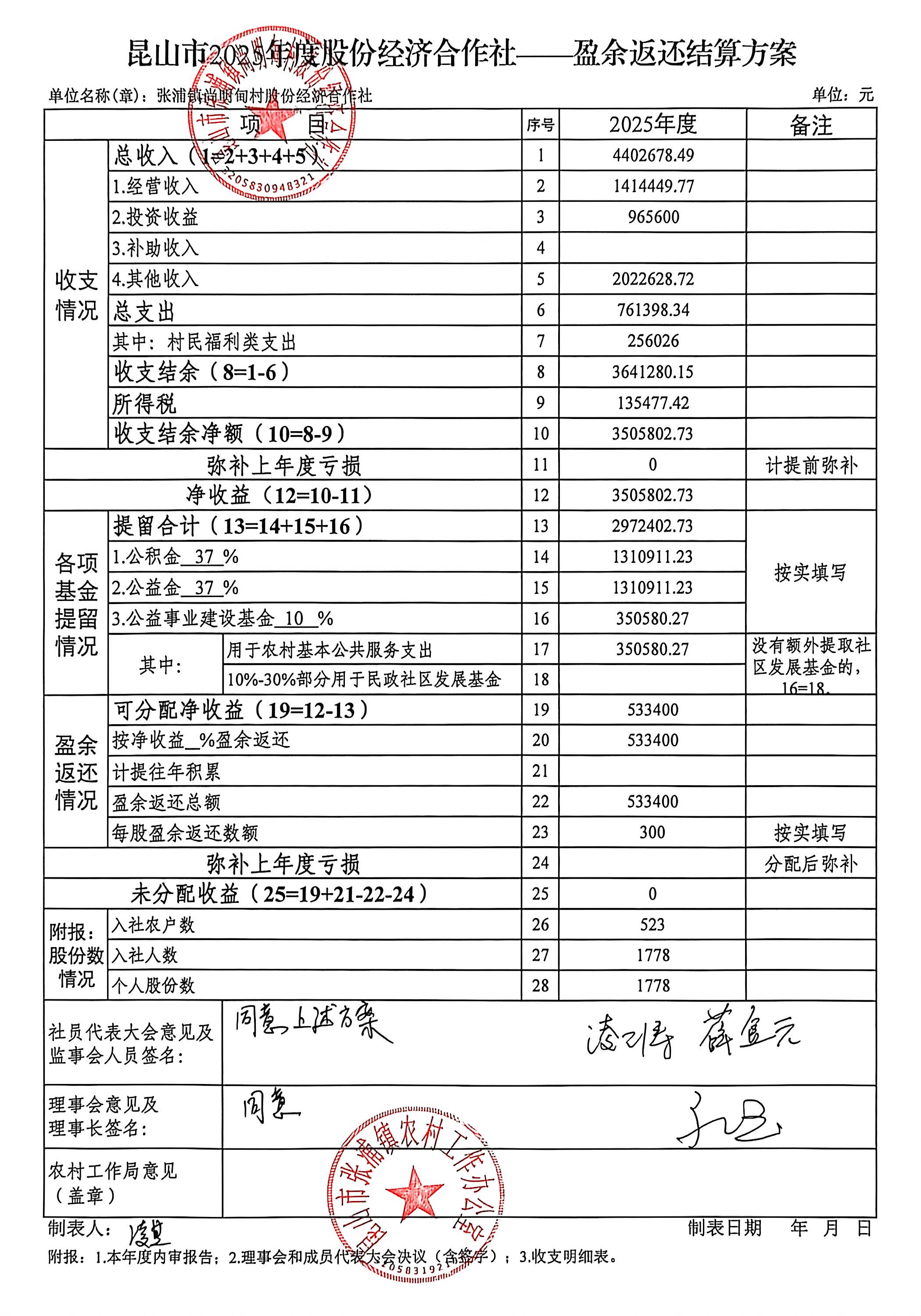 尚明甸村股份经济合作社2025年盈余返还结算方案公示