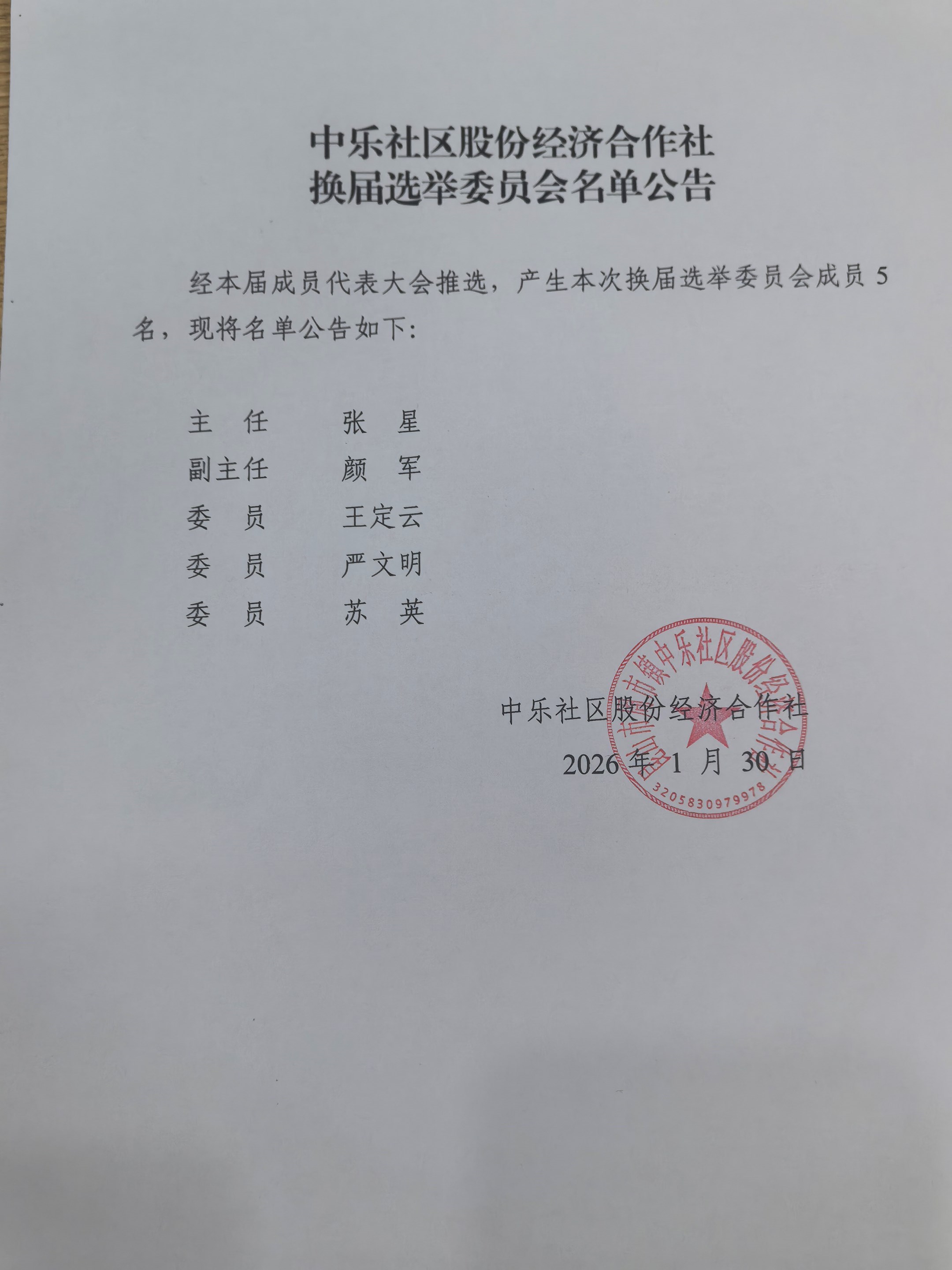 中乐社区股份经济合作社换届选举委员会名单公告