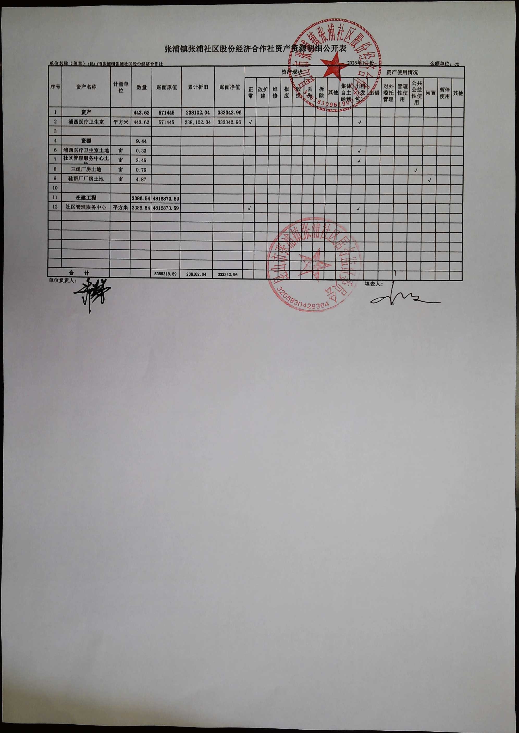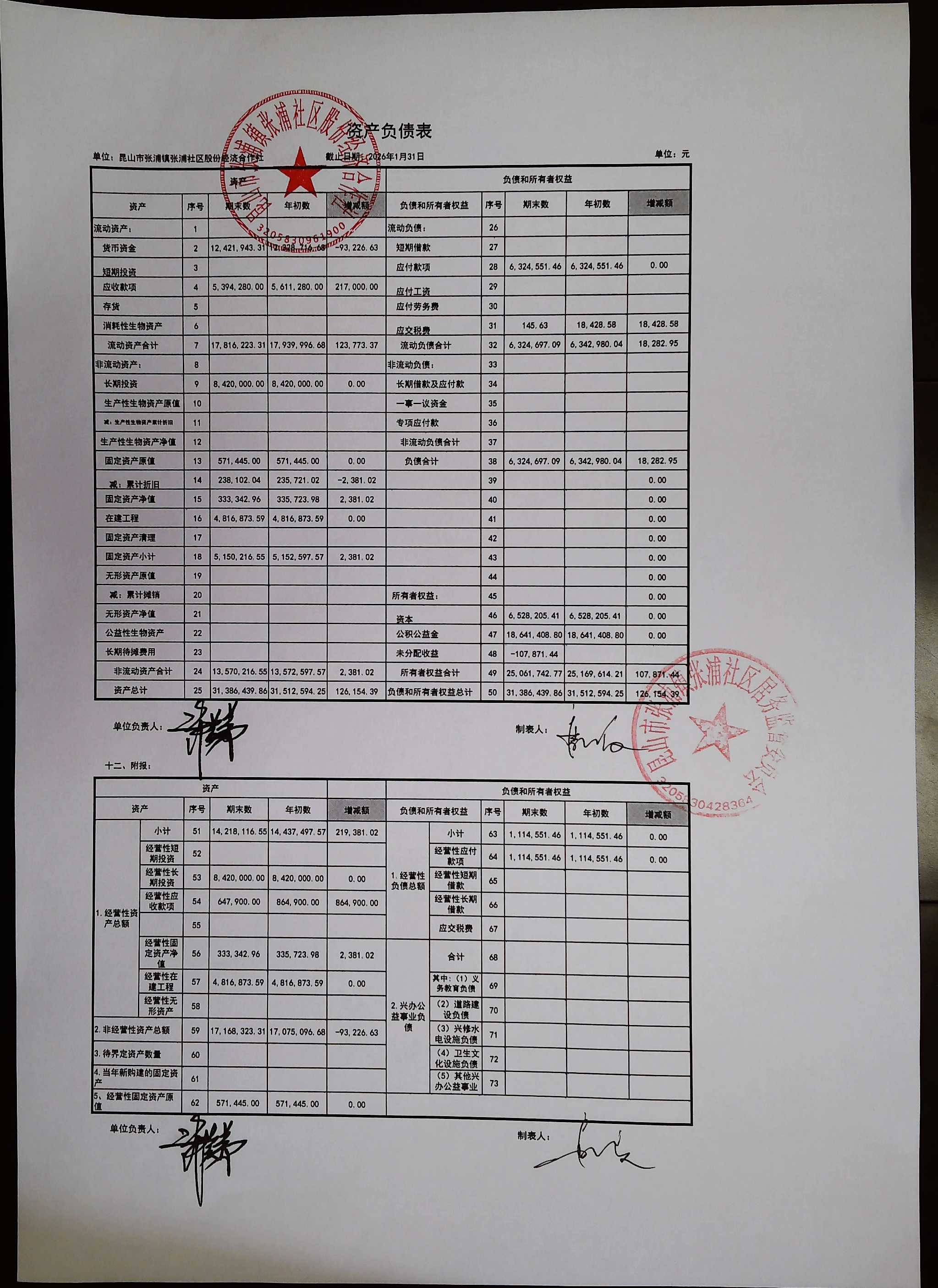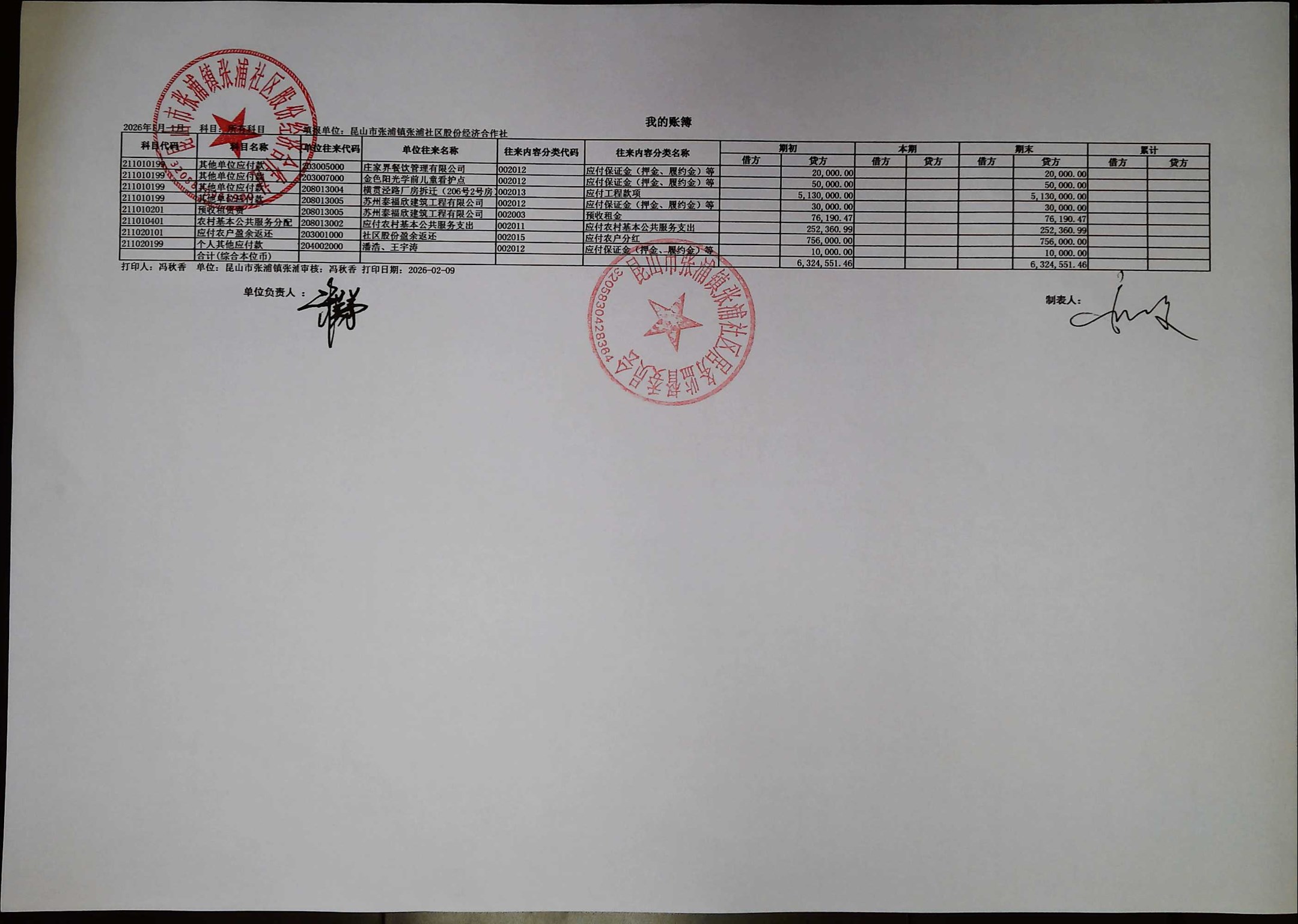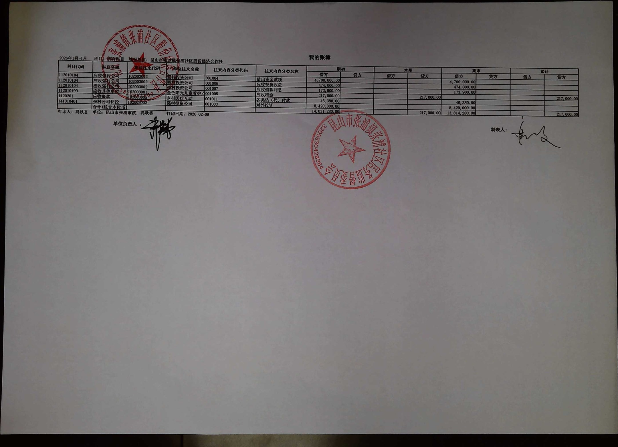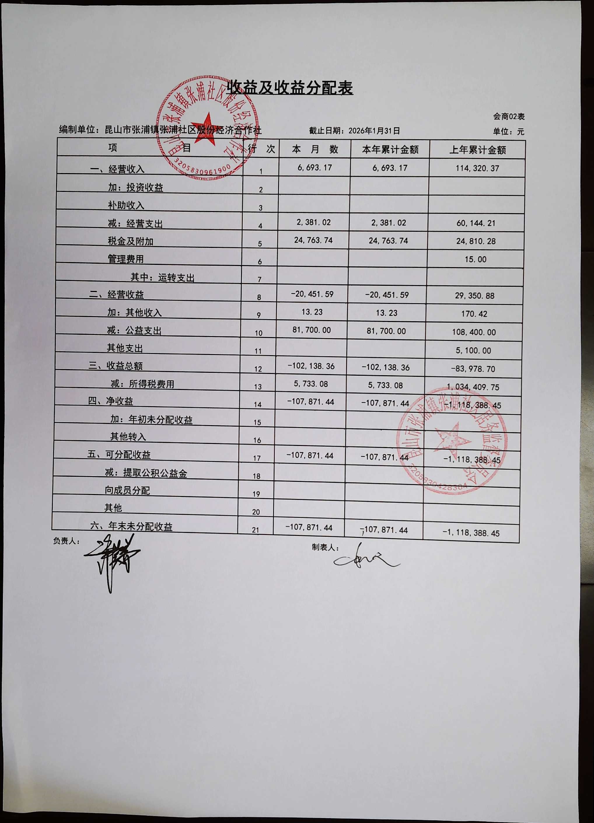 2026年1月合作社财务公开