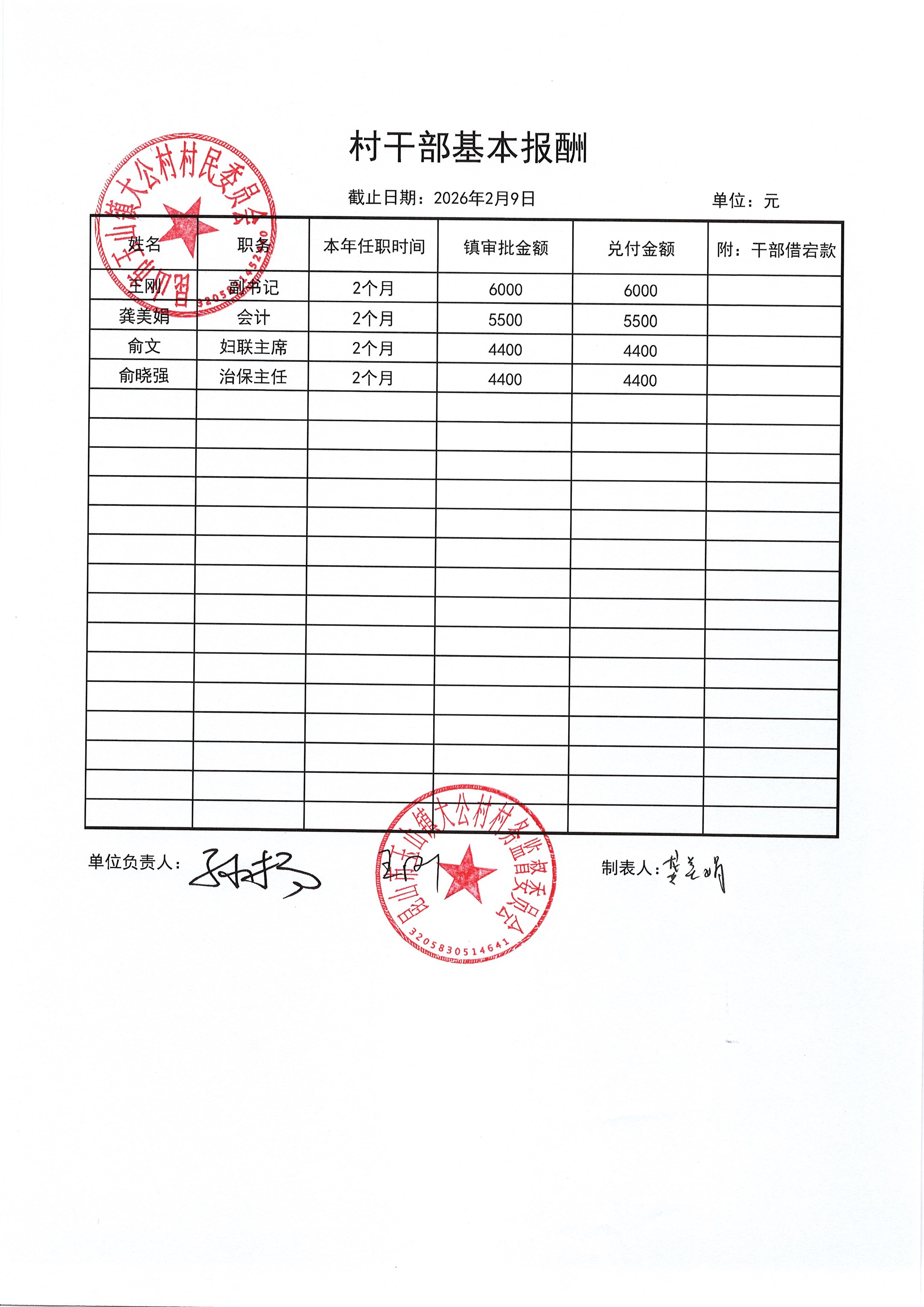 2026年2月村干部报酬