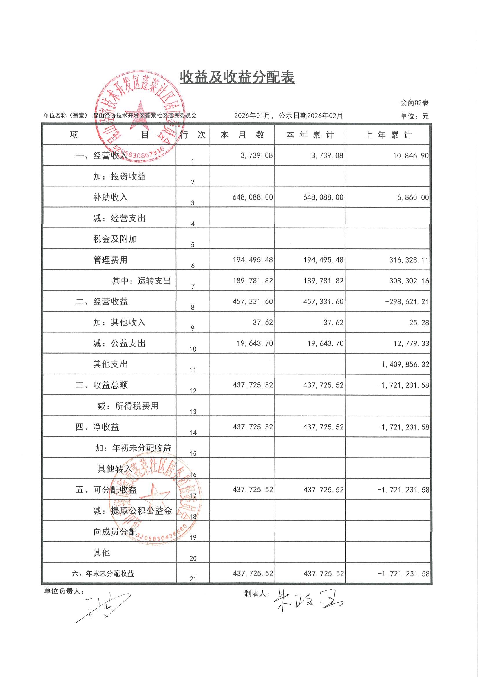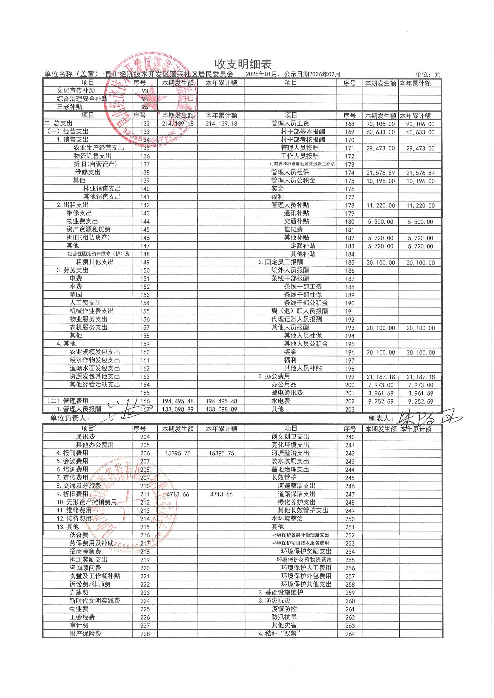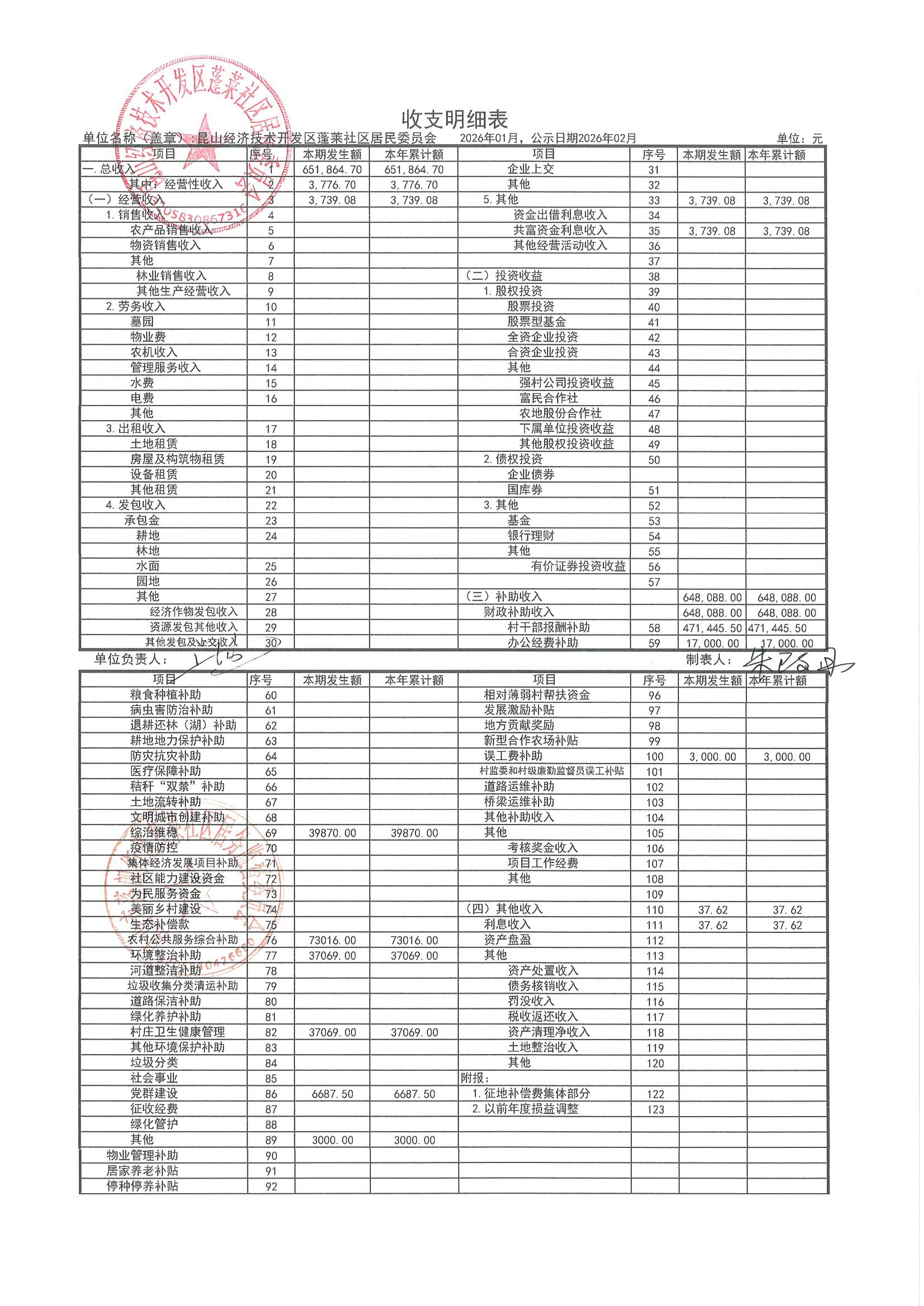 2026年1月财务公开(蓬莱社区居委会)