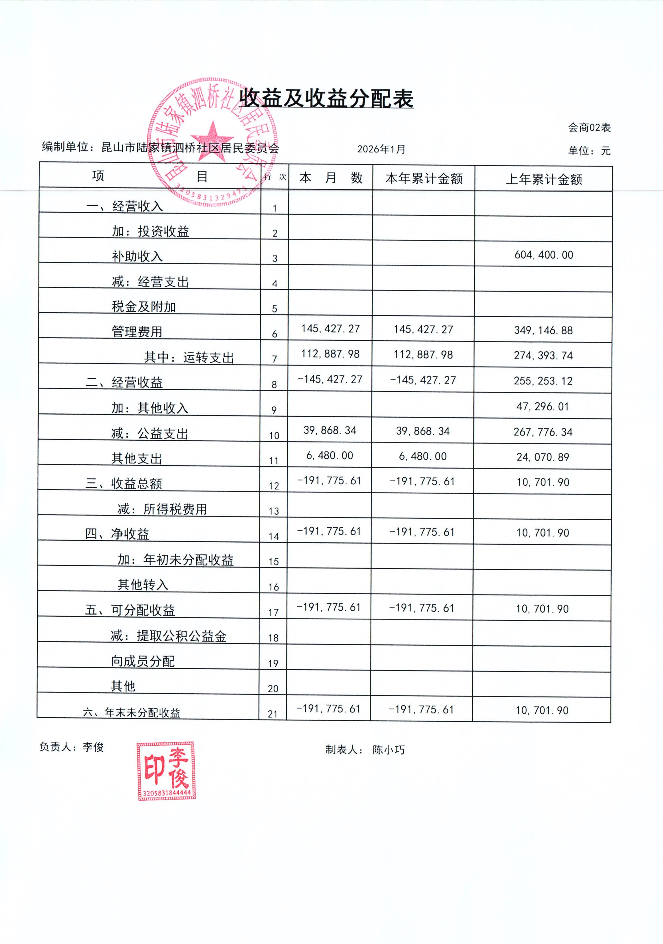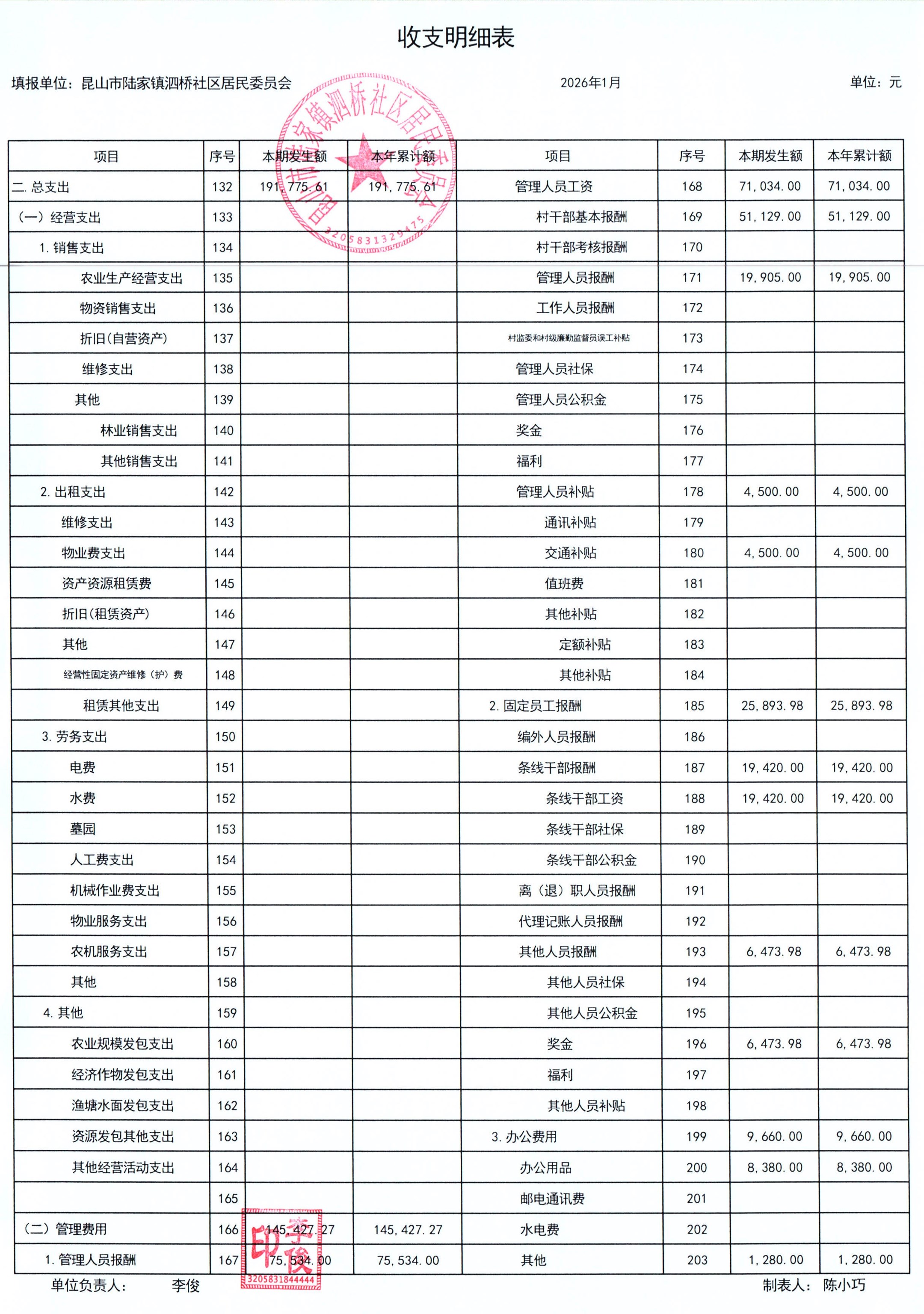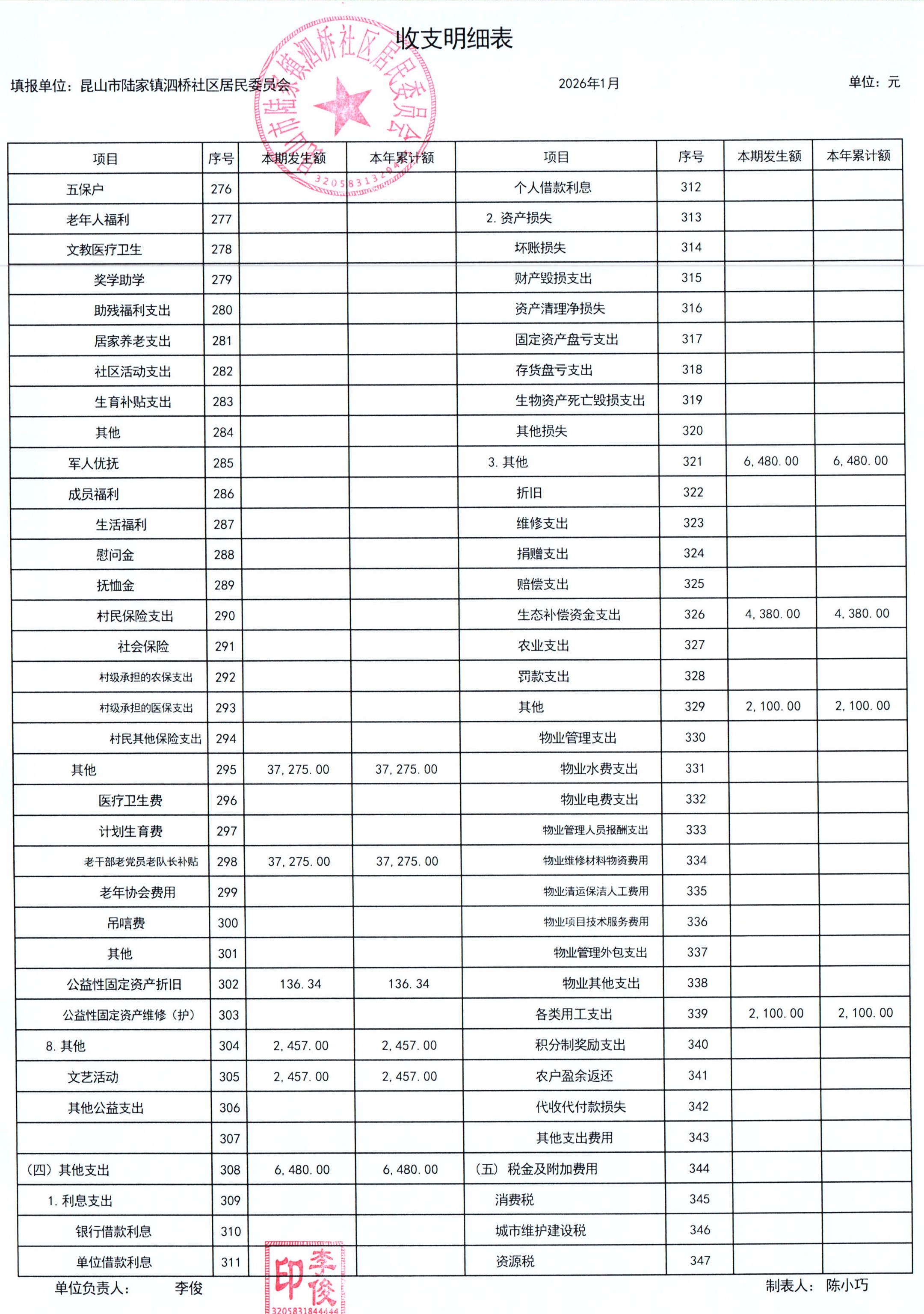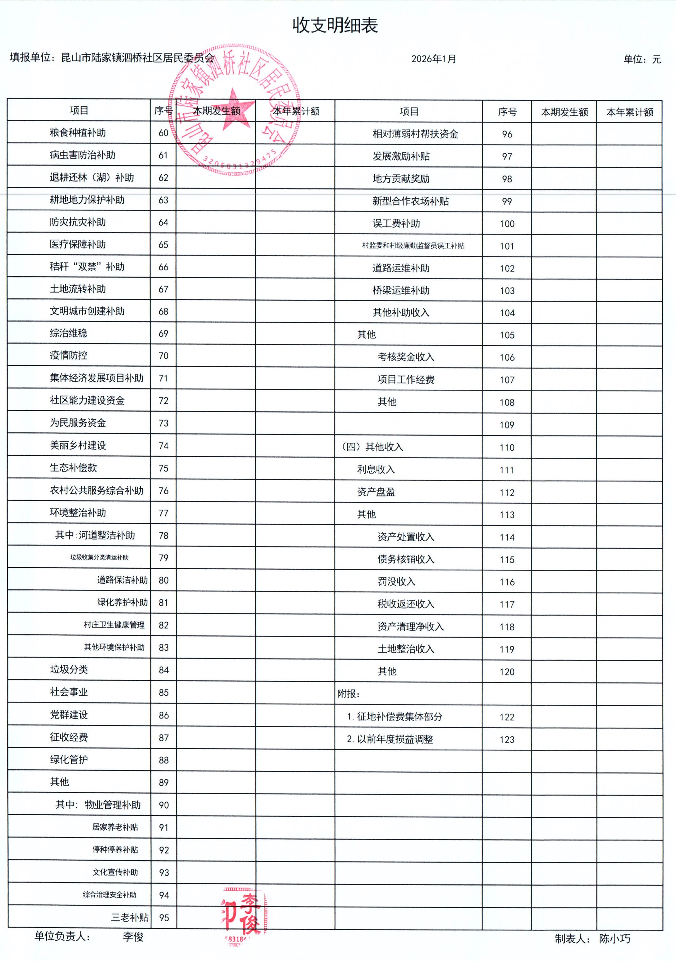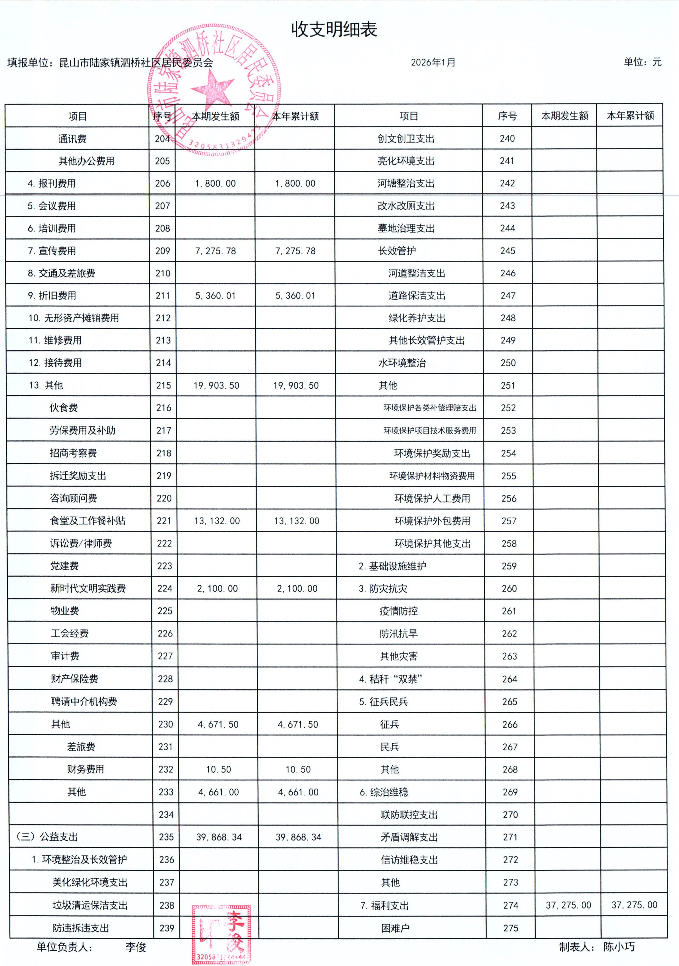 2026年泗桥社区居民委员会1月财务公开