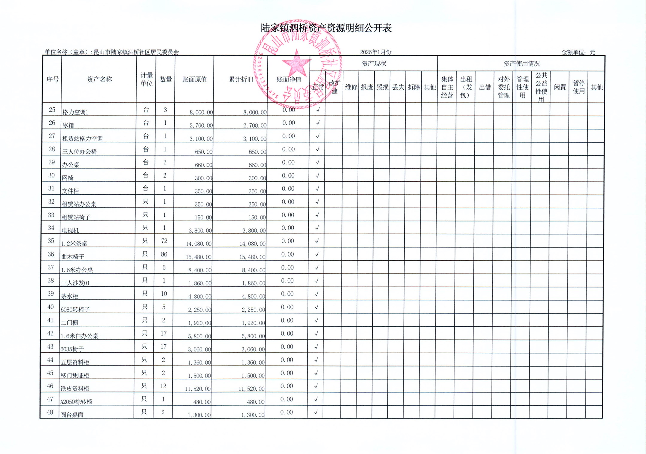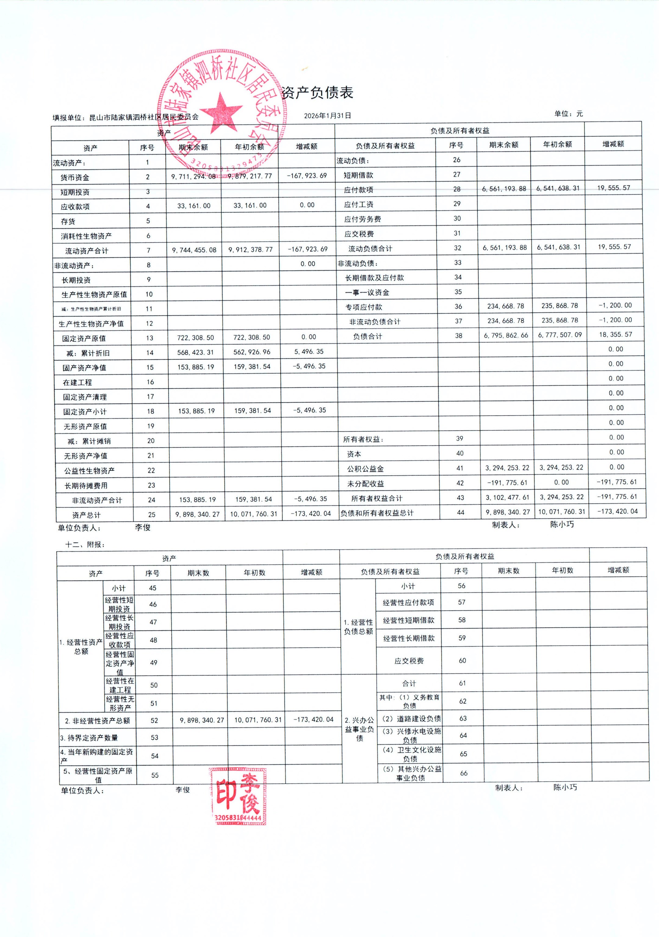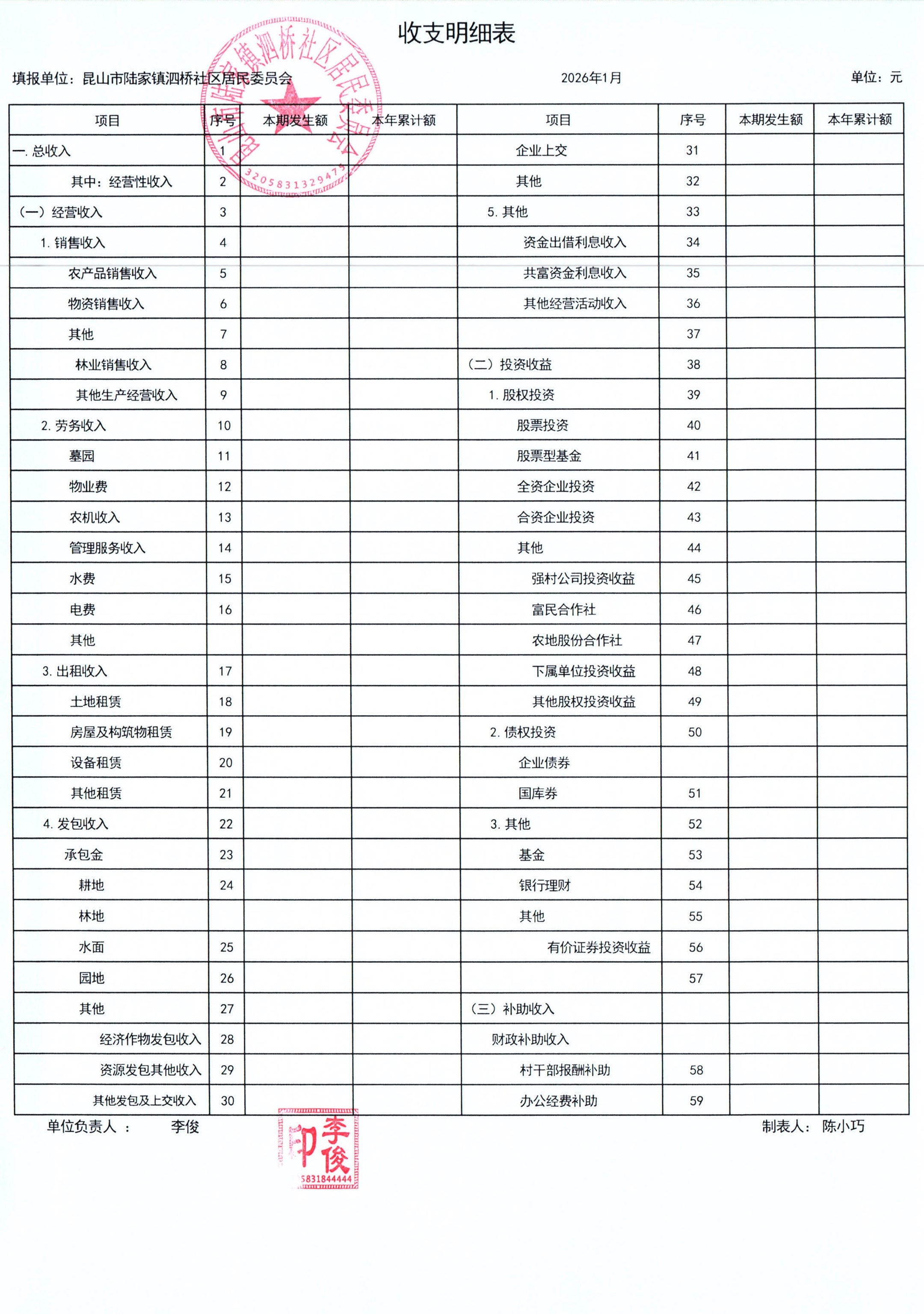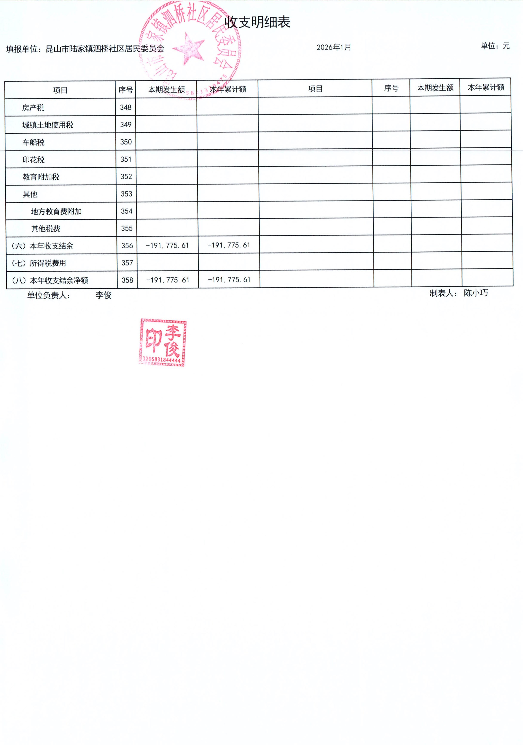 2026年泗桥社区居民委员会1月财务公开