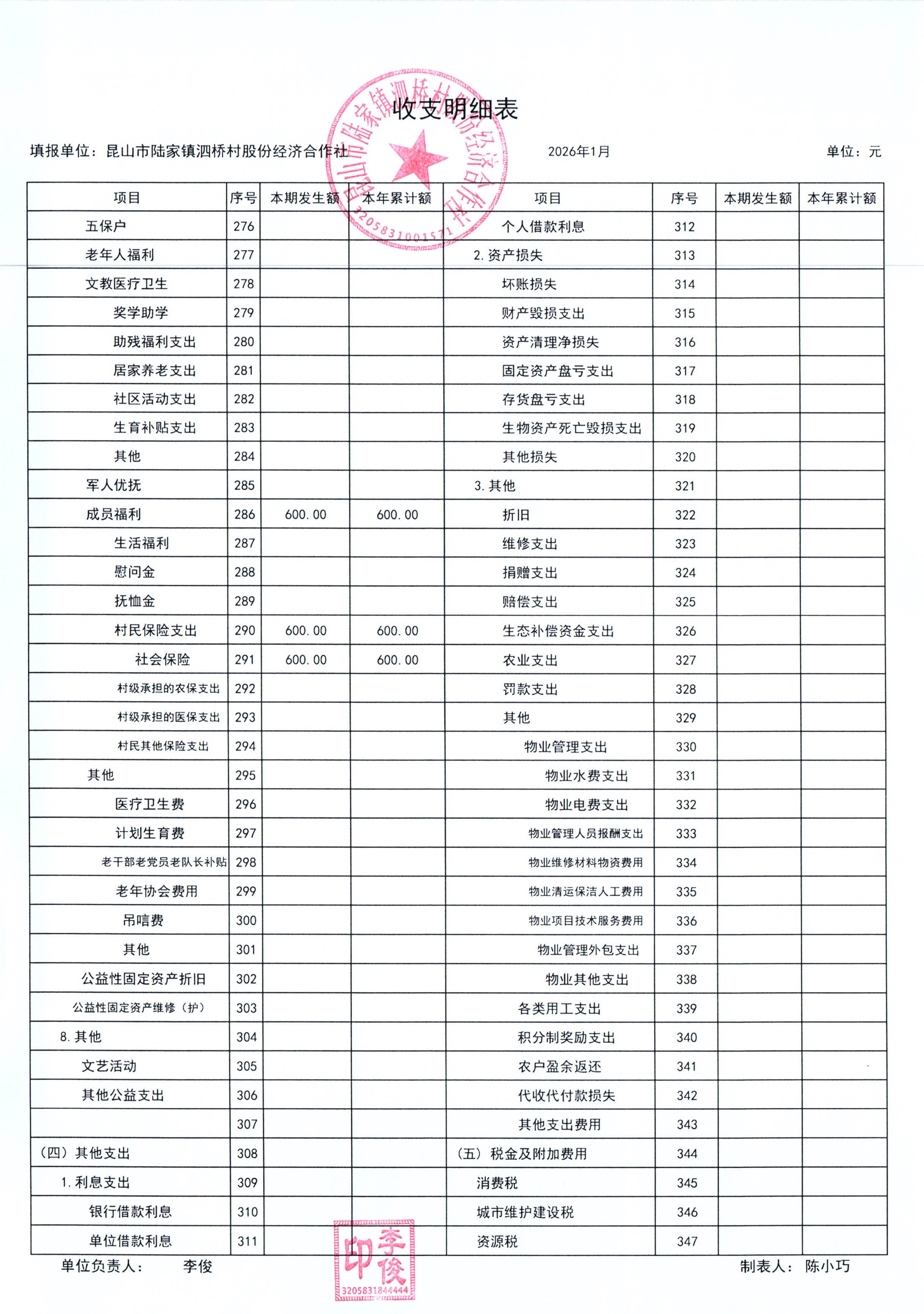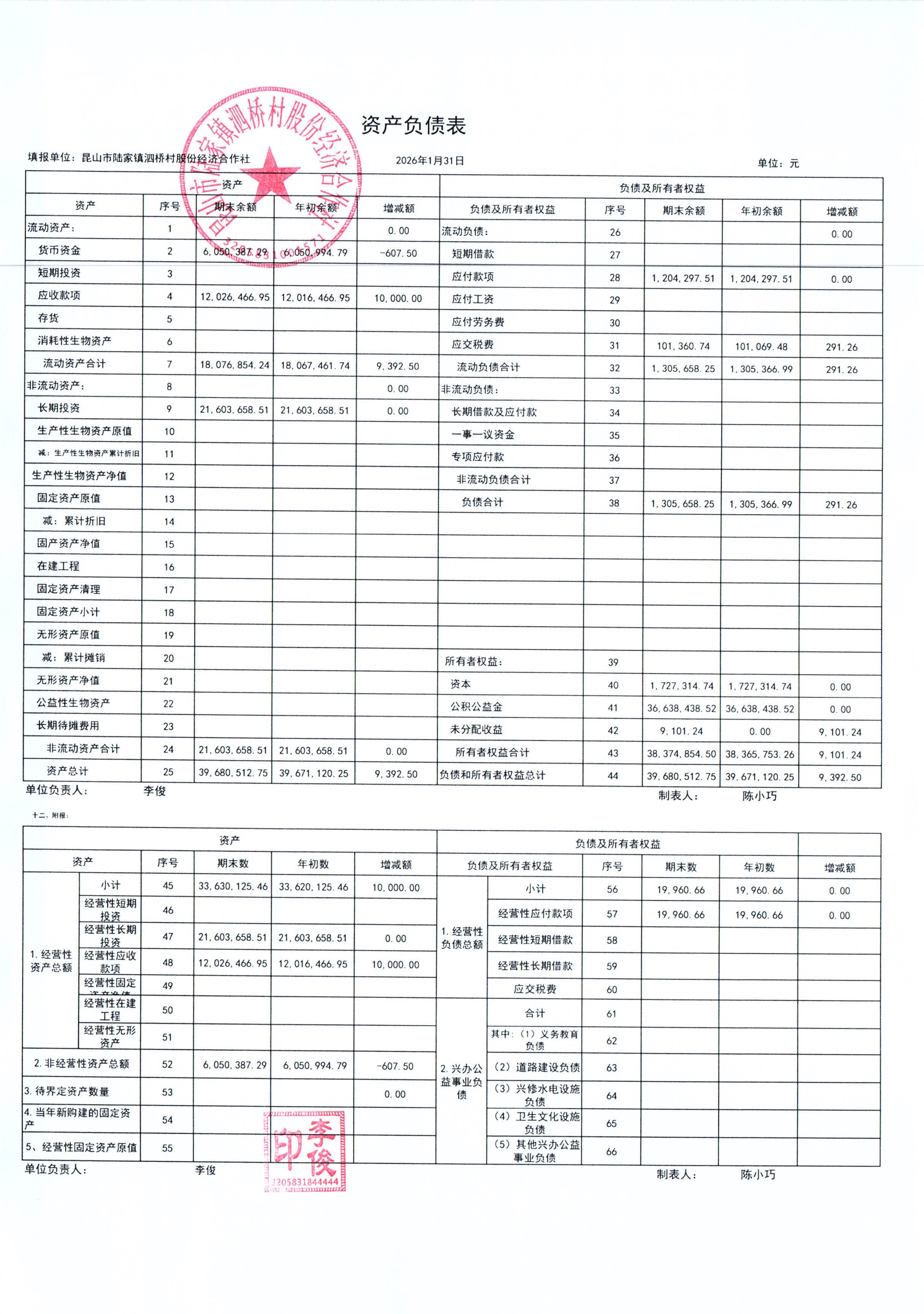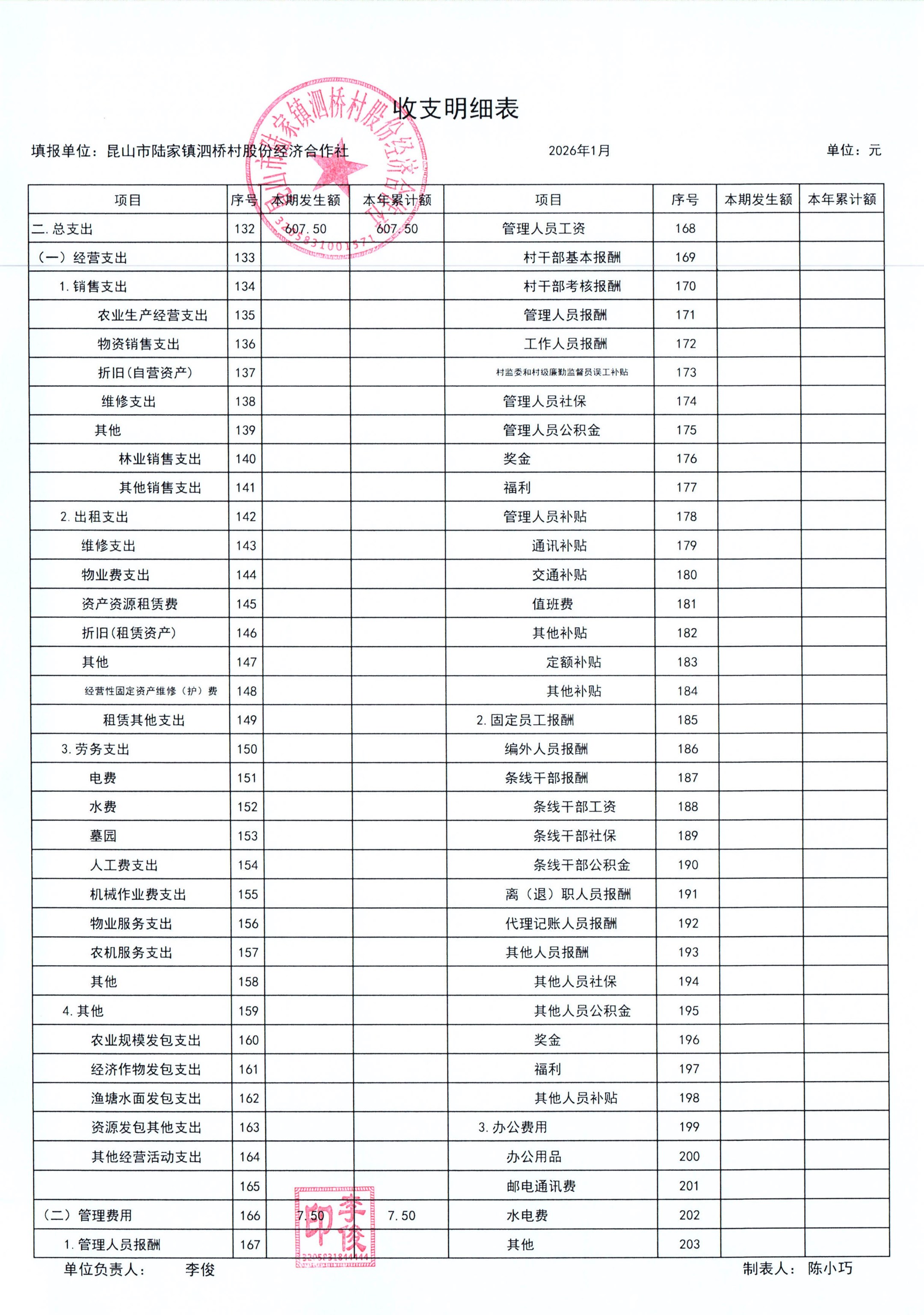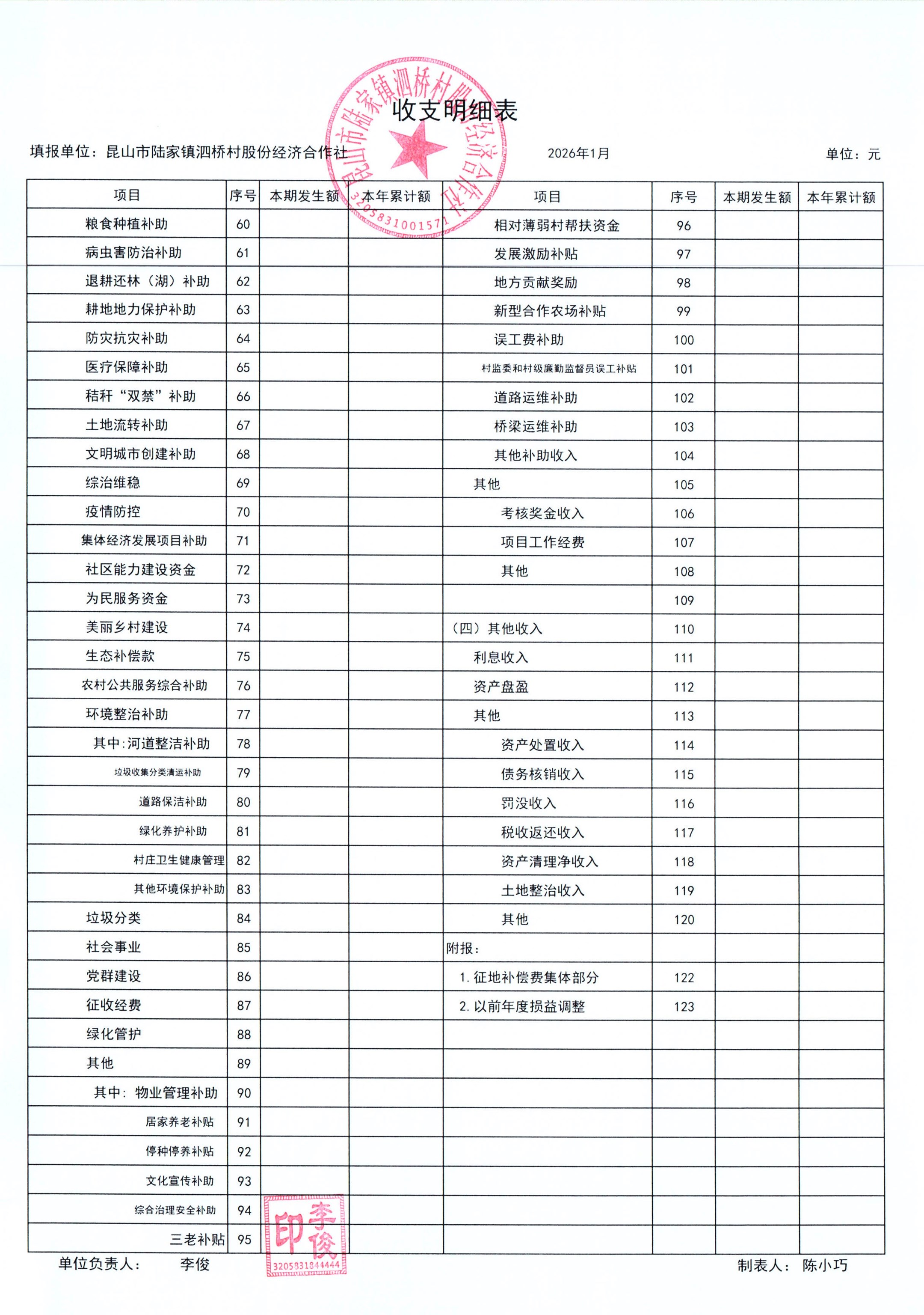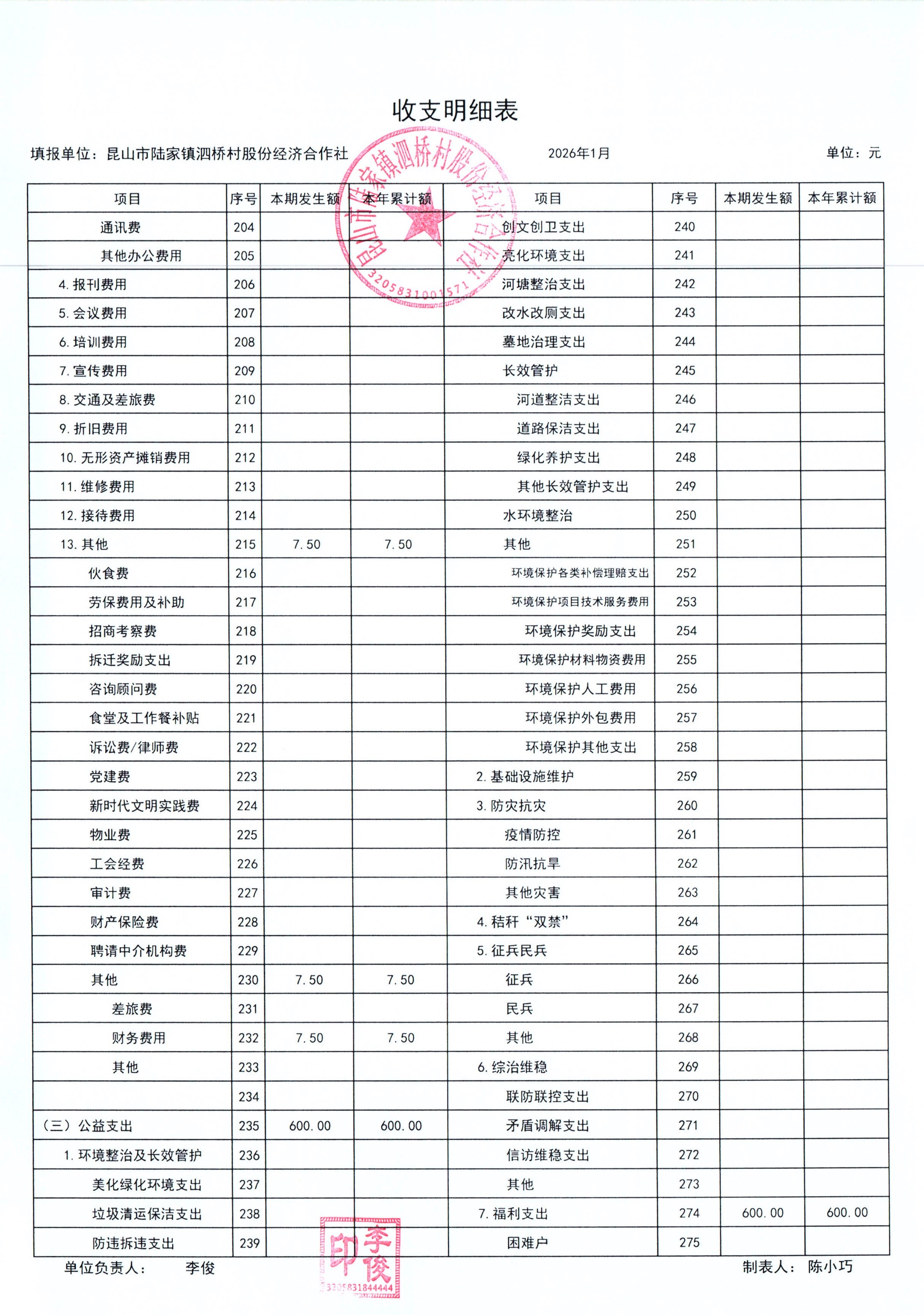2026年泗桥村股份经济合作社1月财务公开