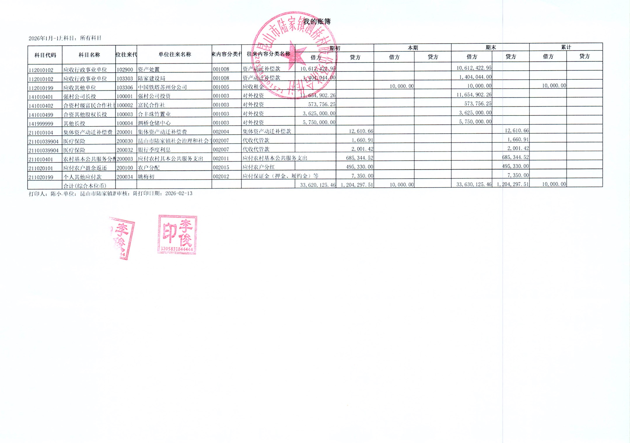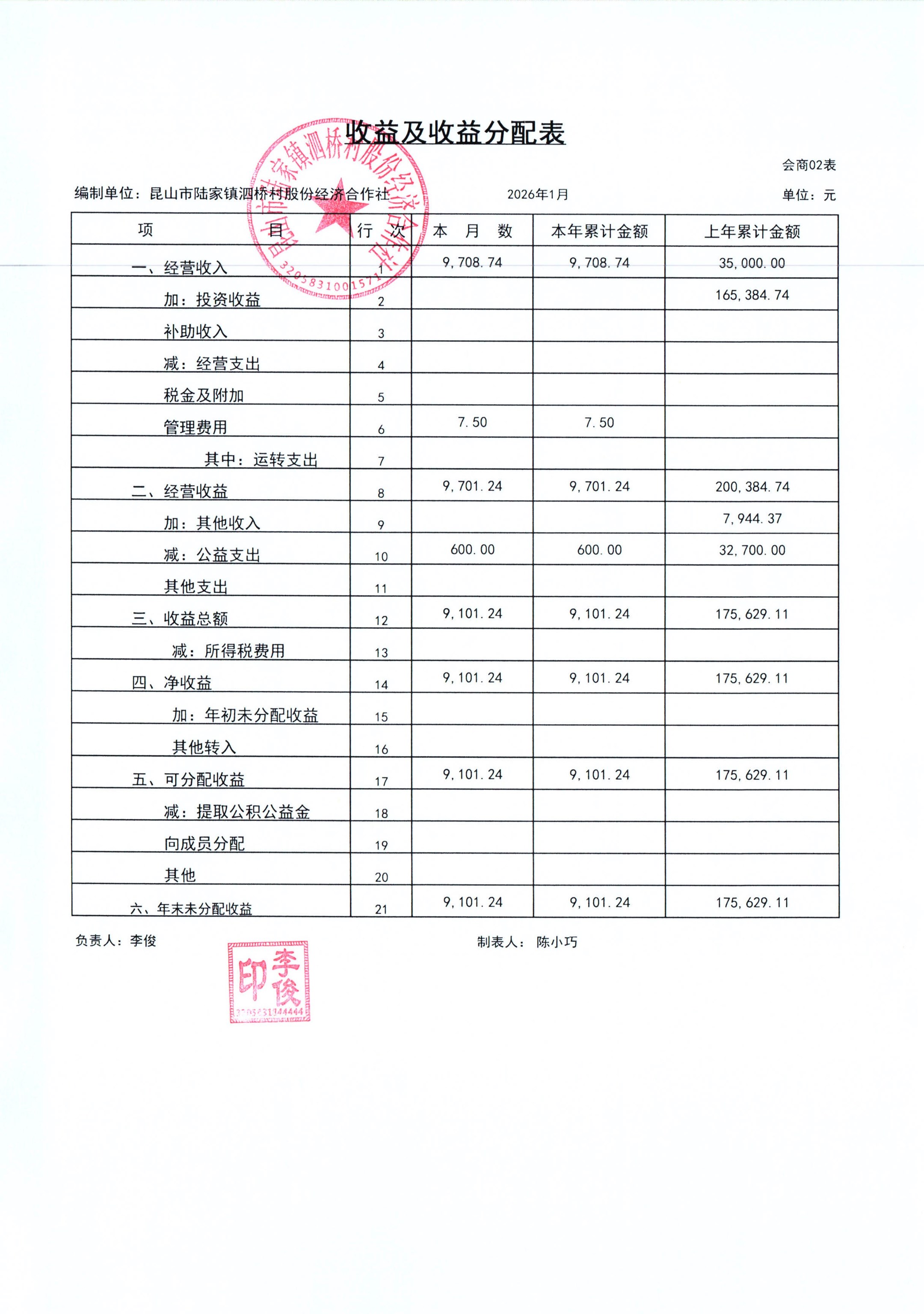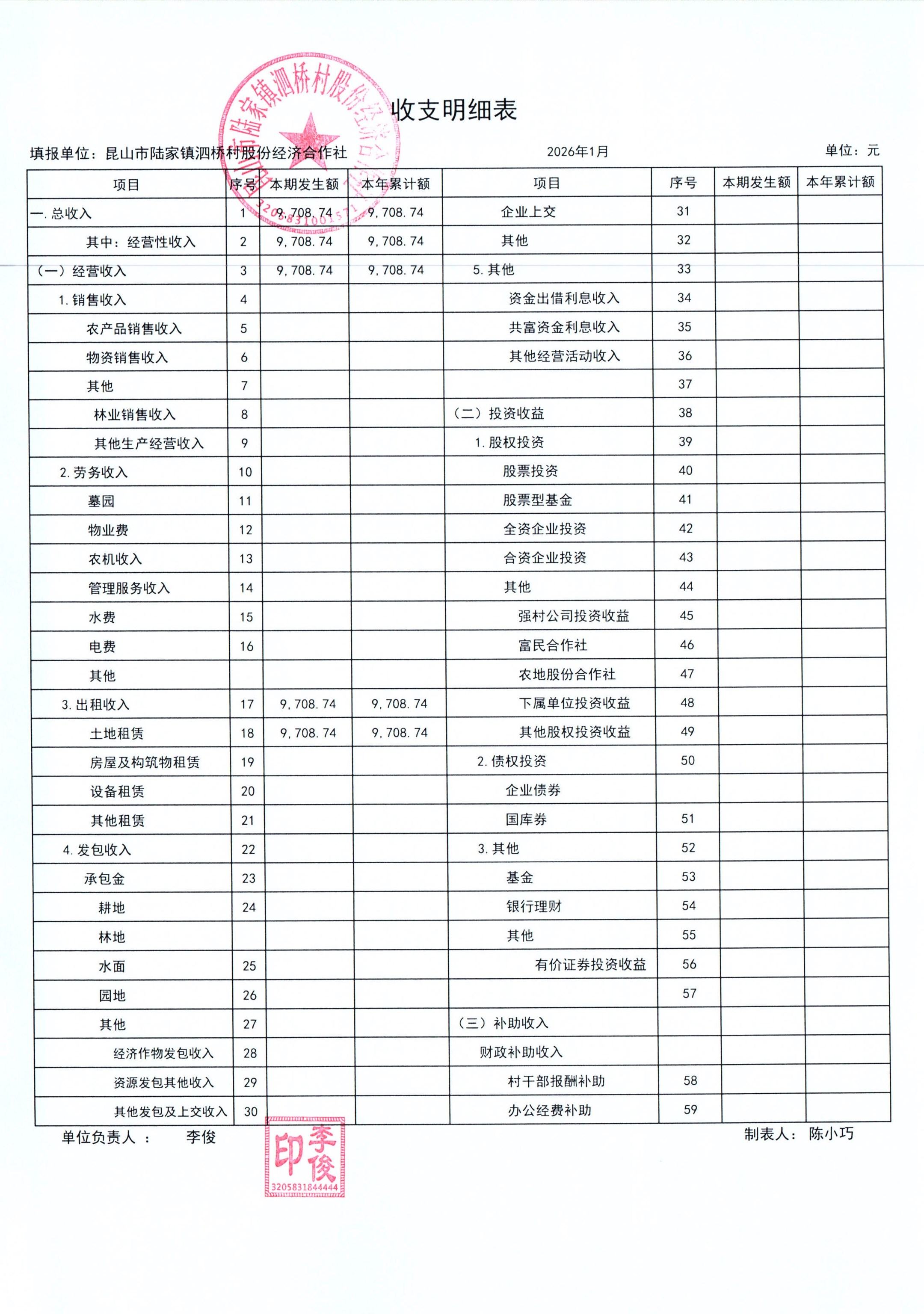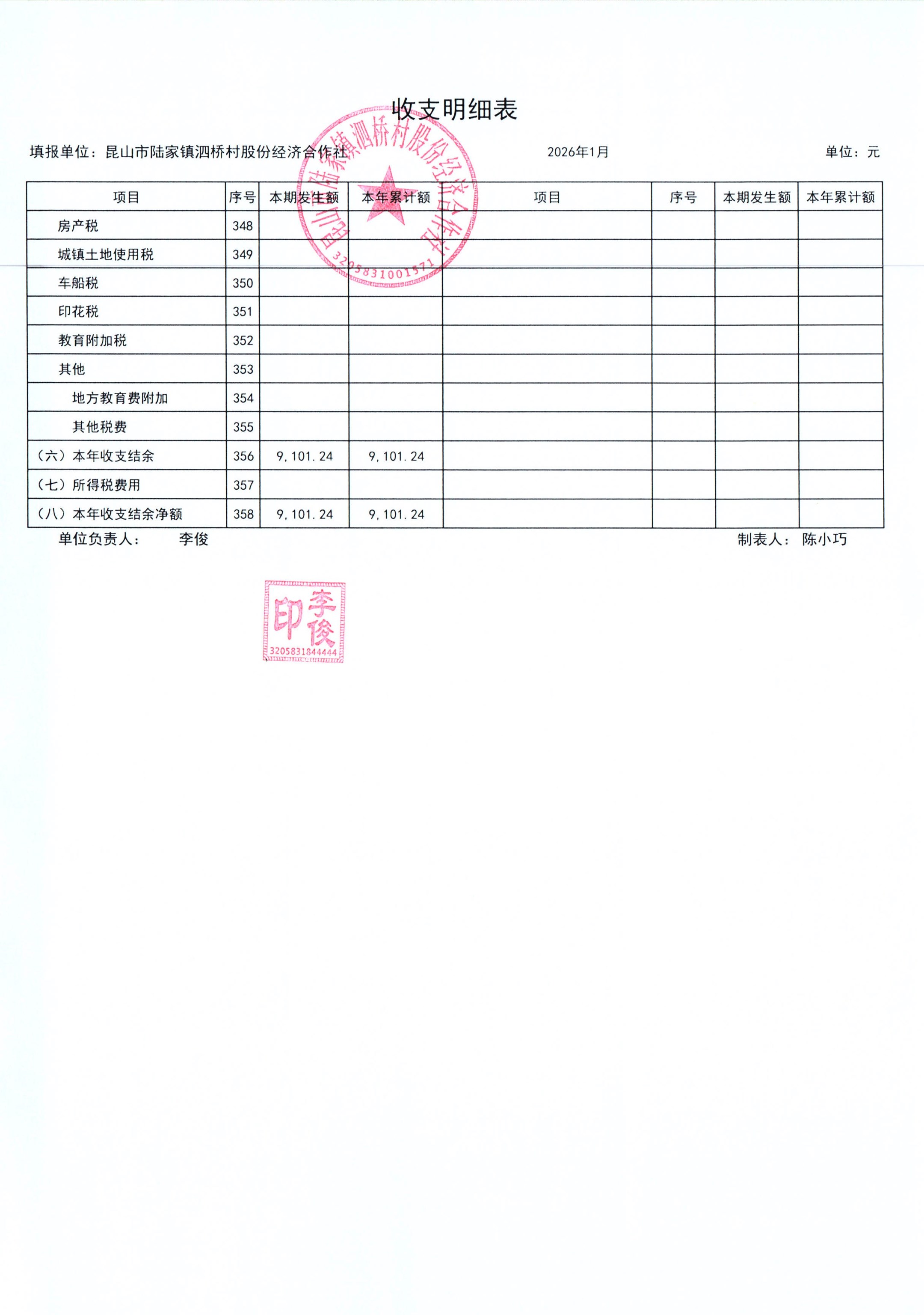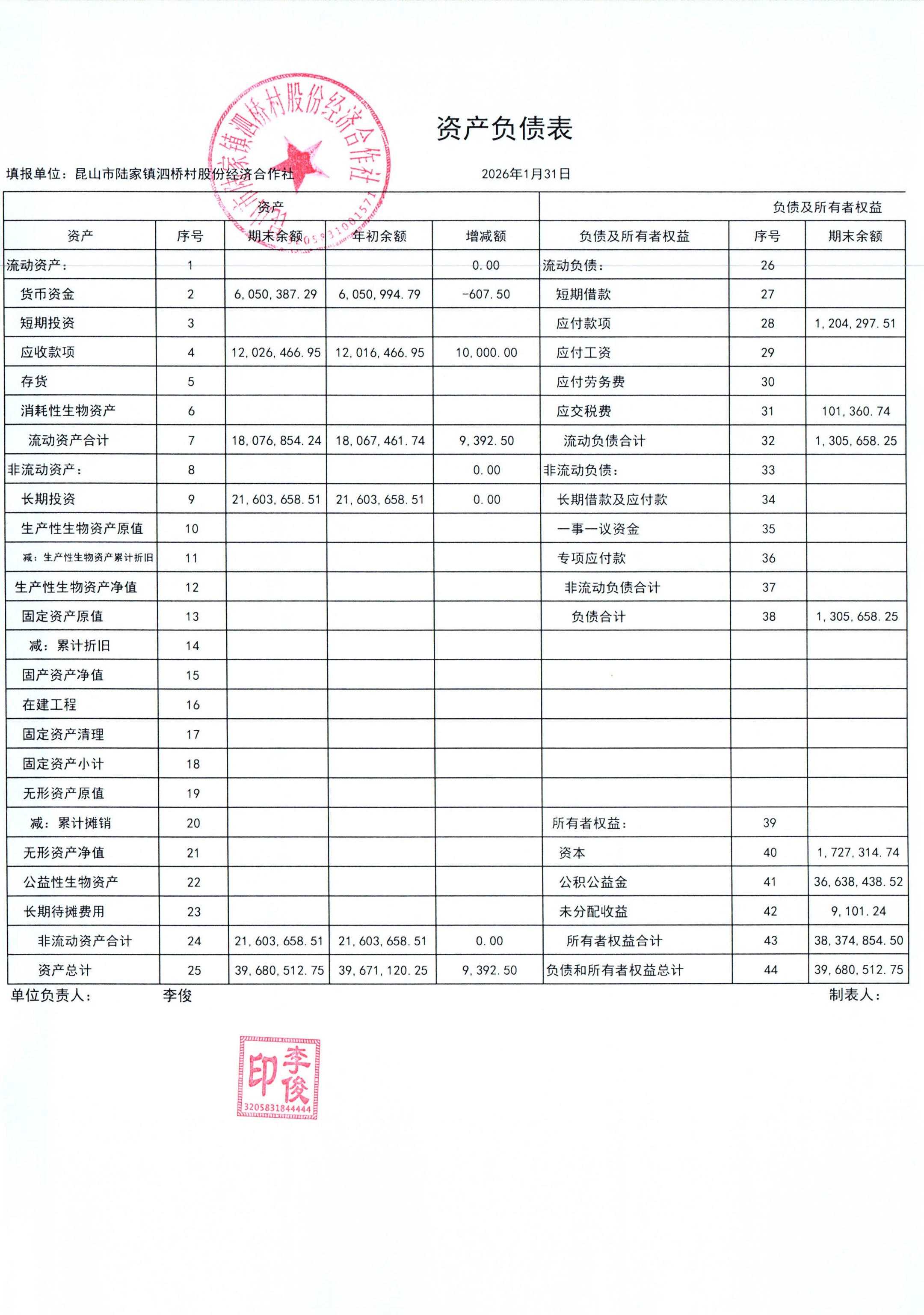 2026年泗桥村股份经济合作社1月财务公开