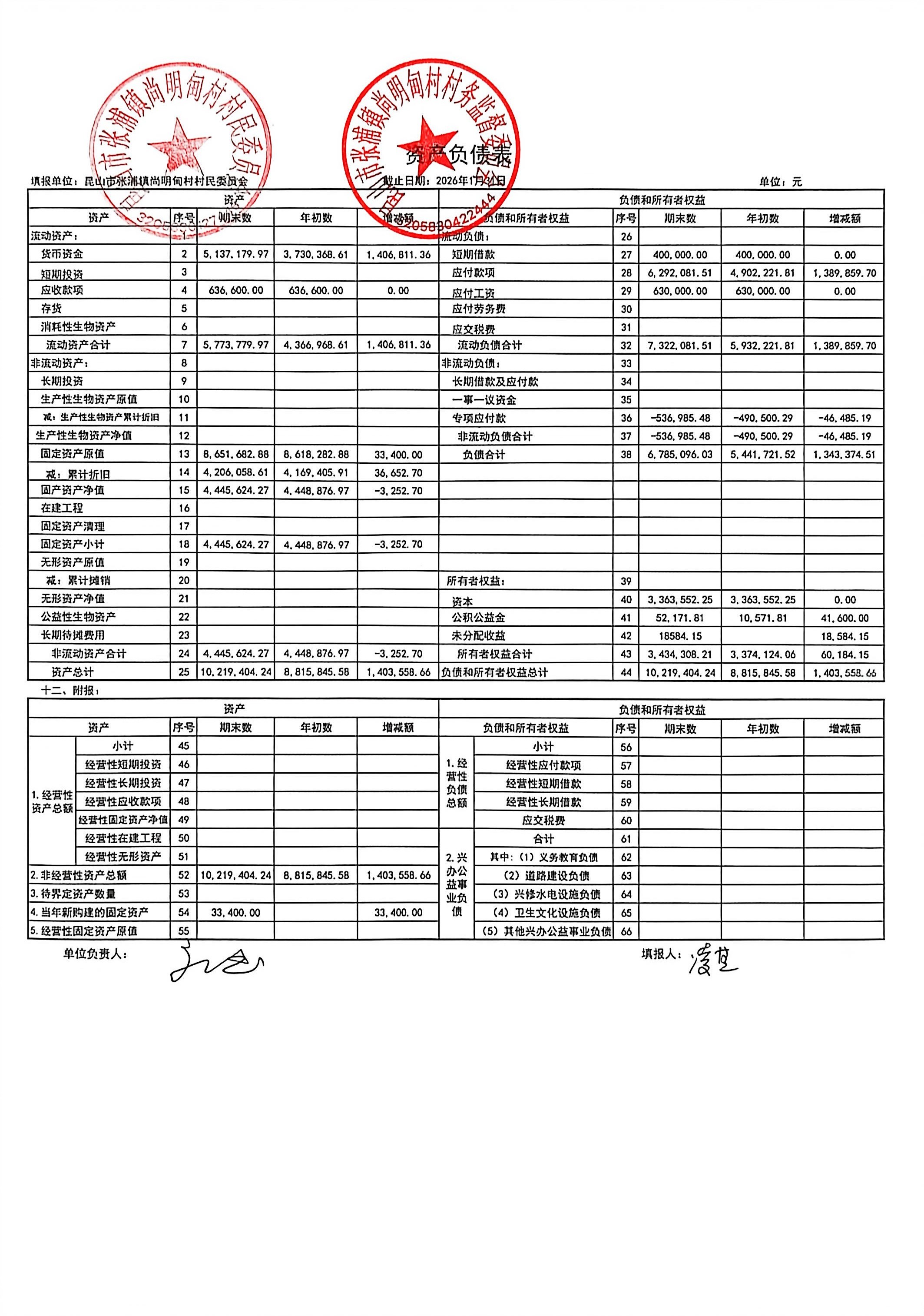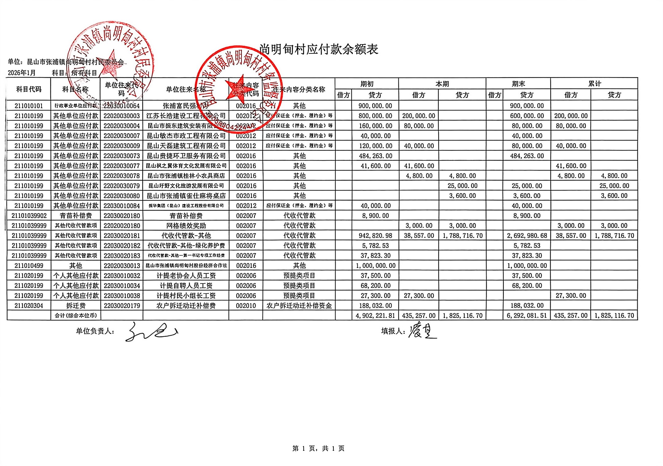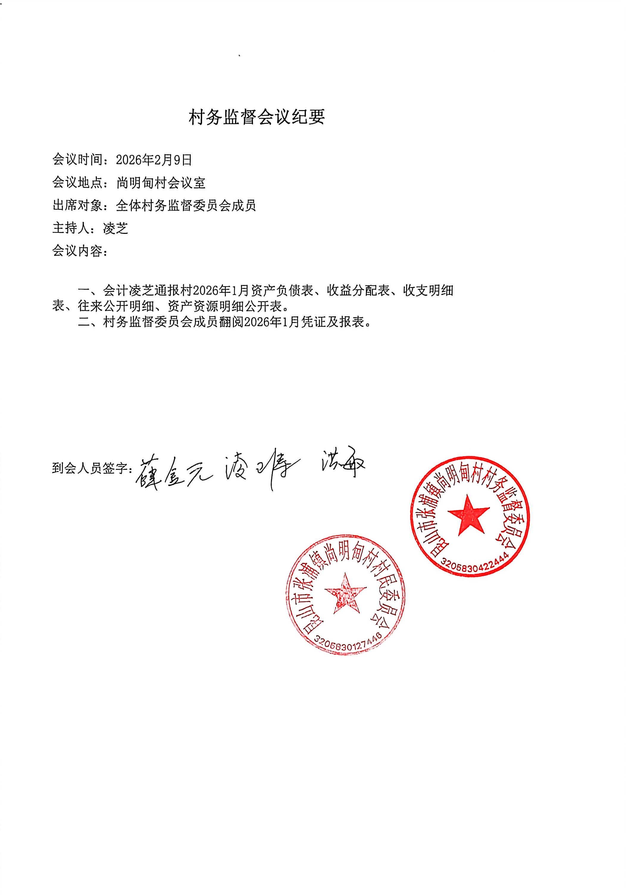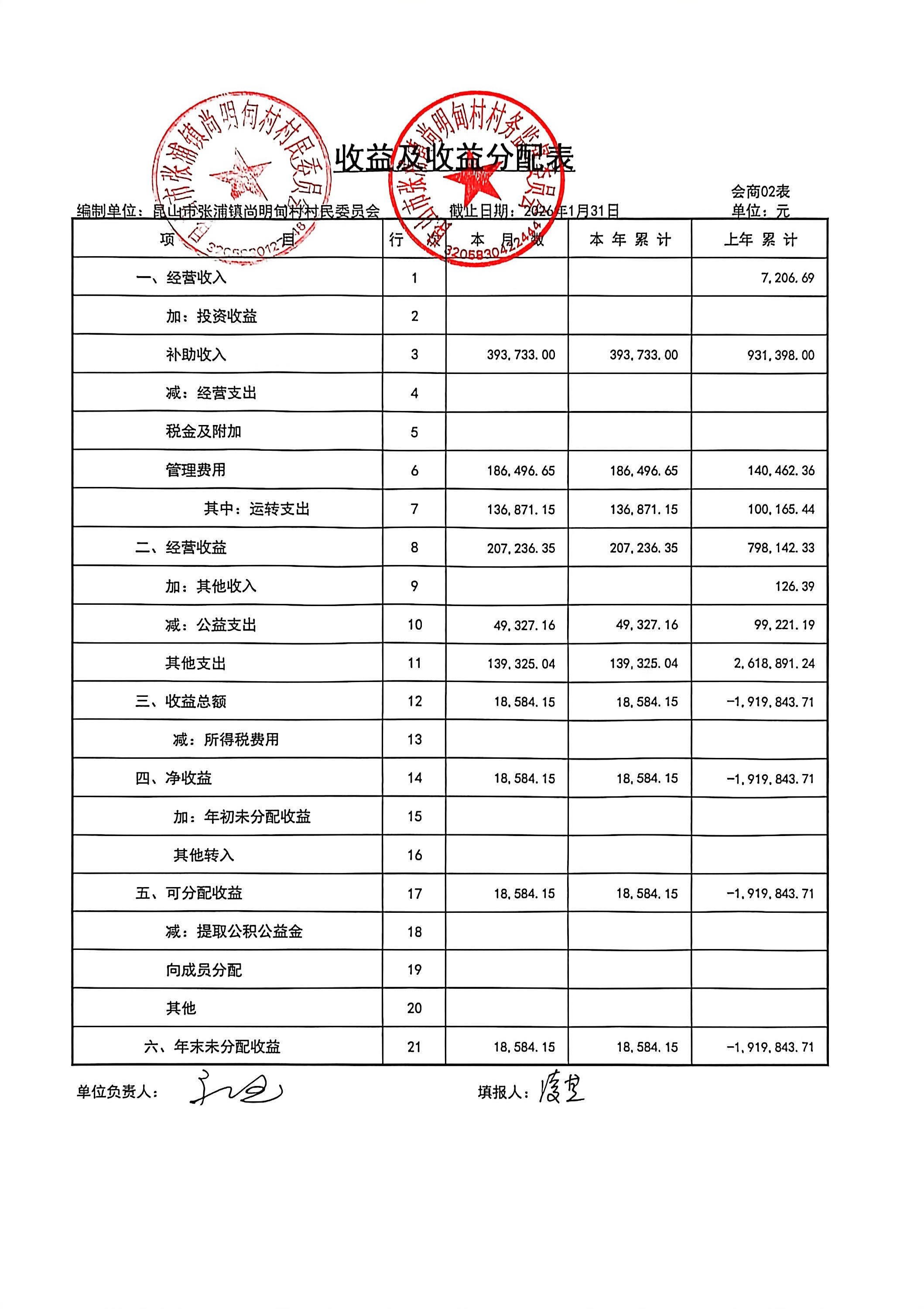 尚明甸村2026年1月财务公开