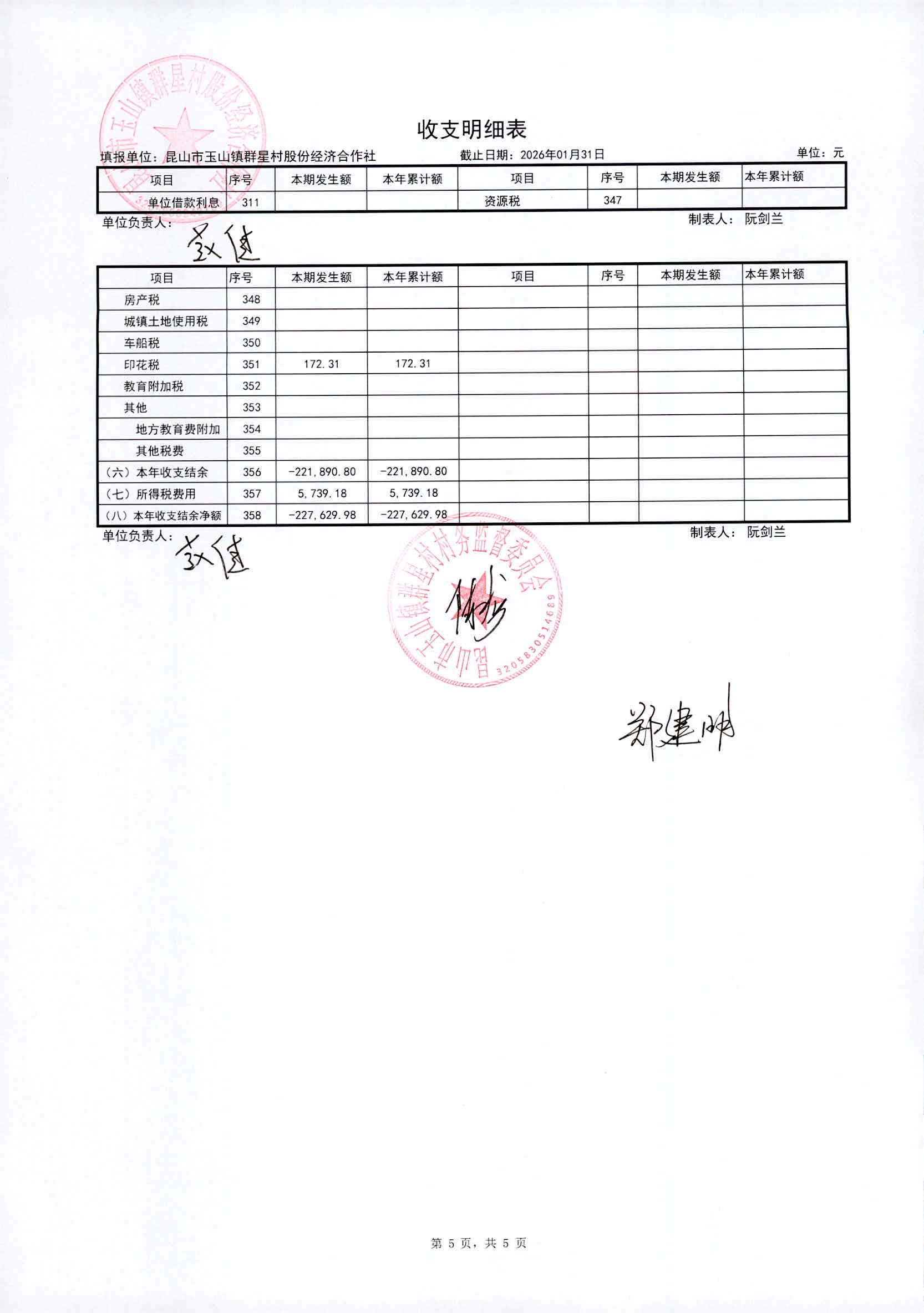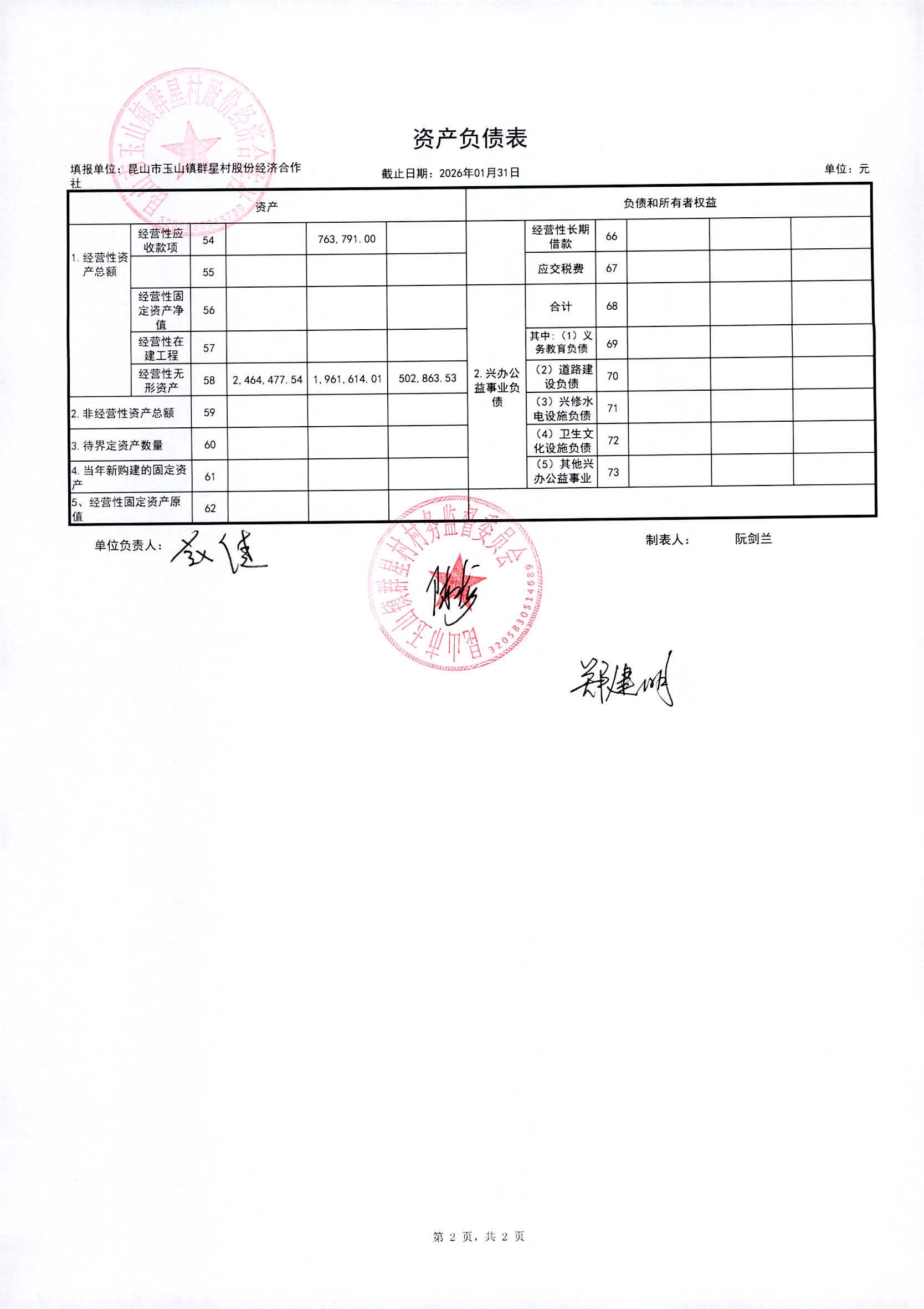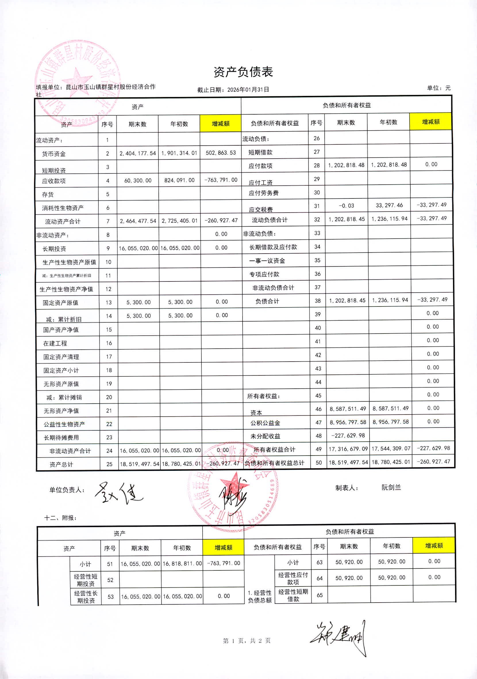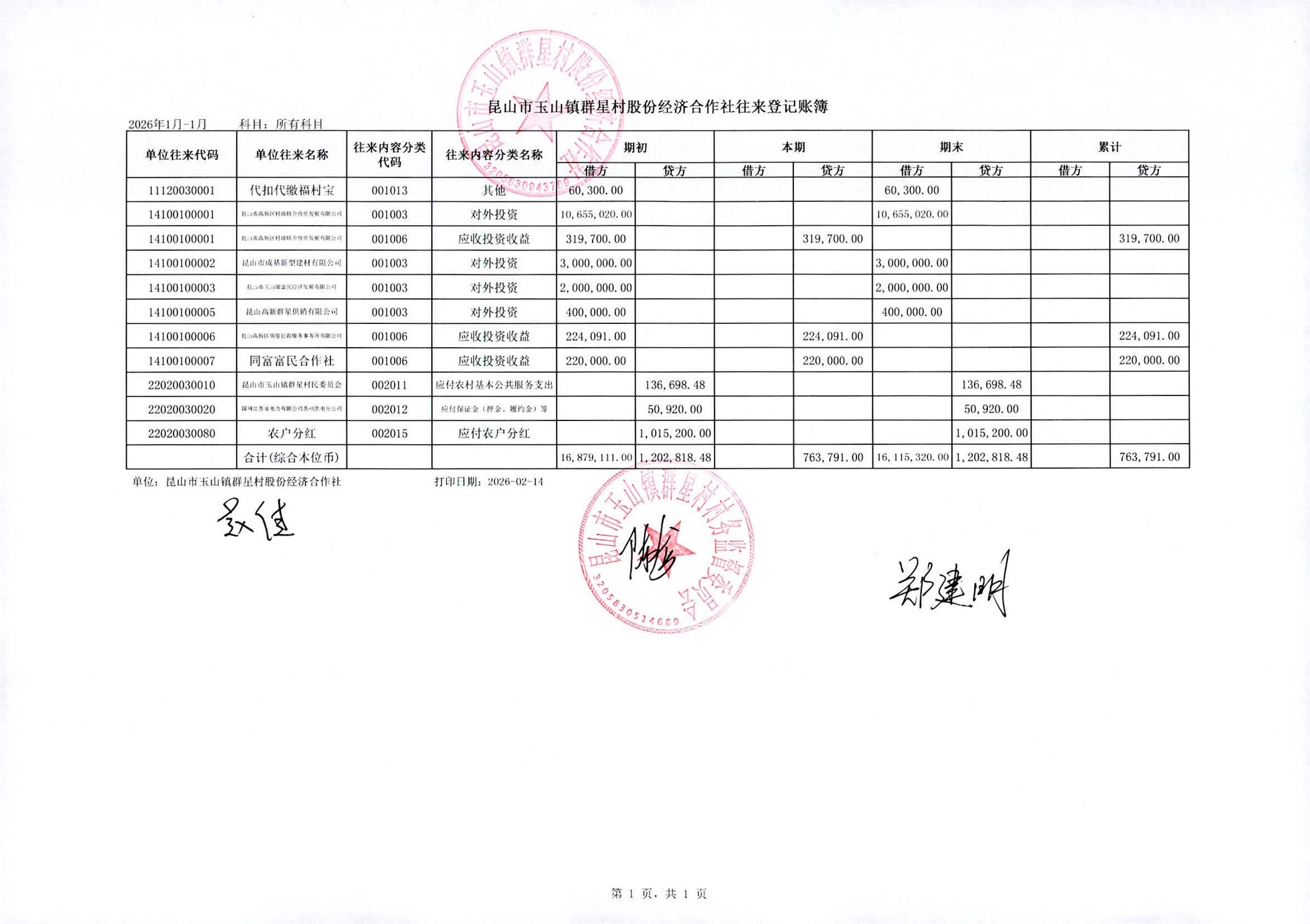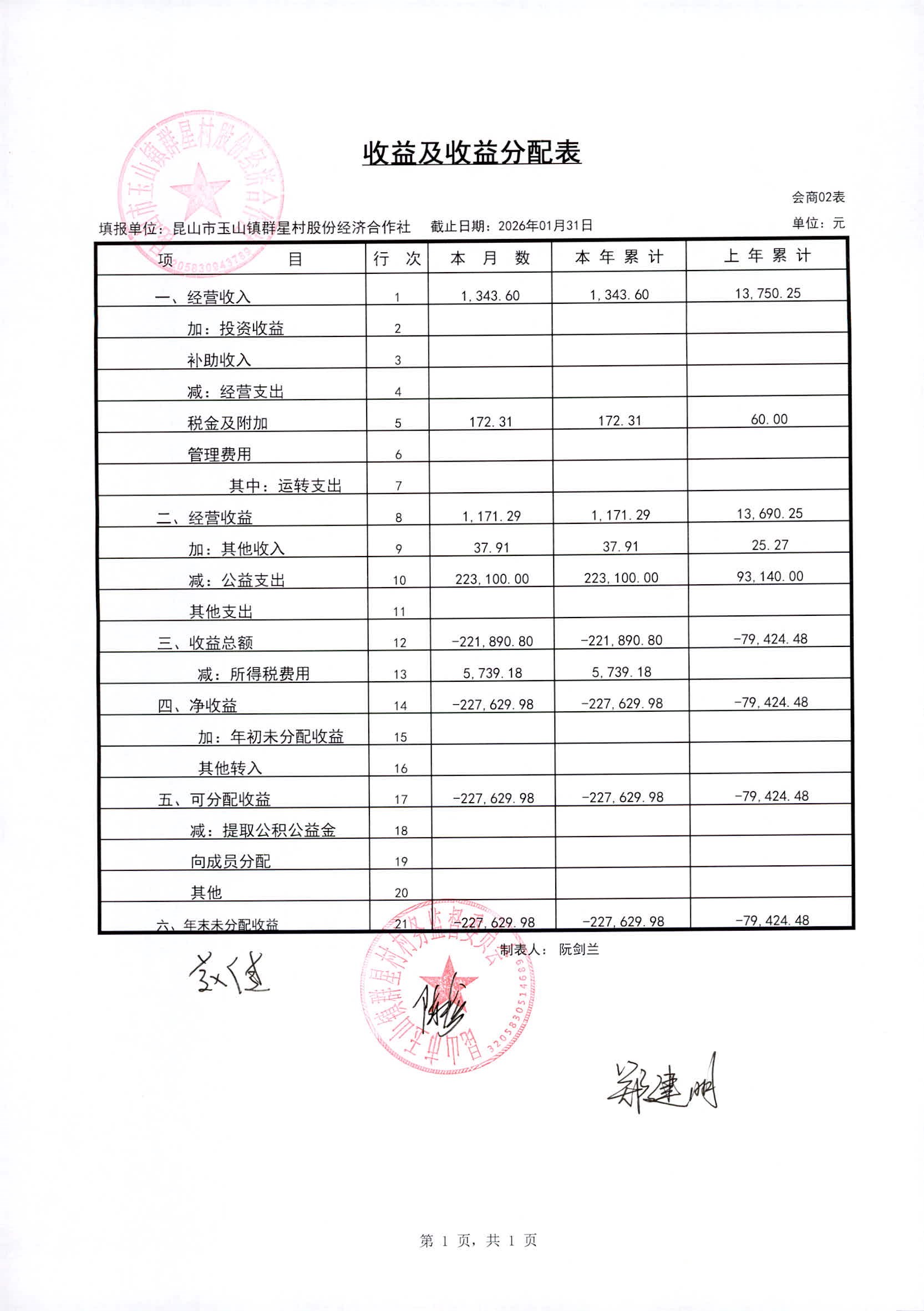 昆山高新区群星村2026年02月份公开股份经济合作社2026年01月财务信息