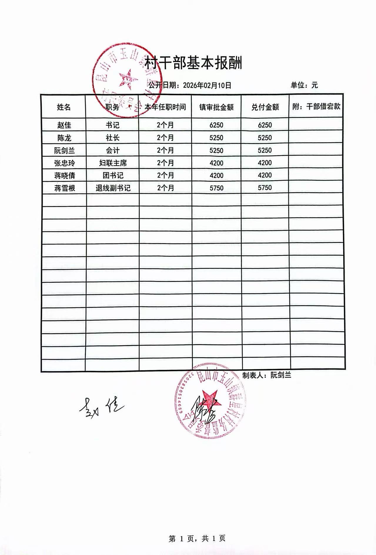 昆山高新区群星村2026年02月份公开村干部基本报酬信息