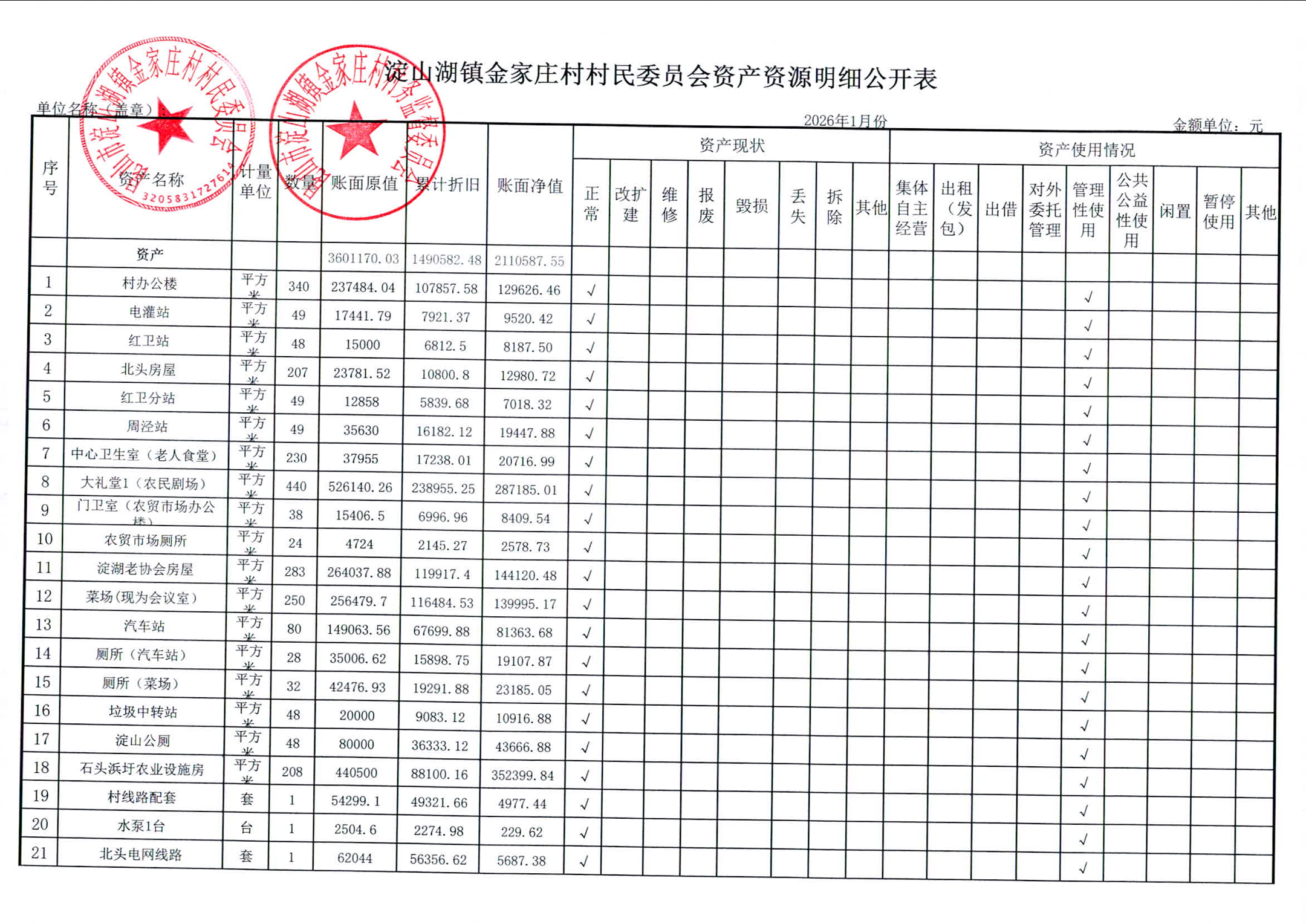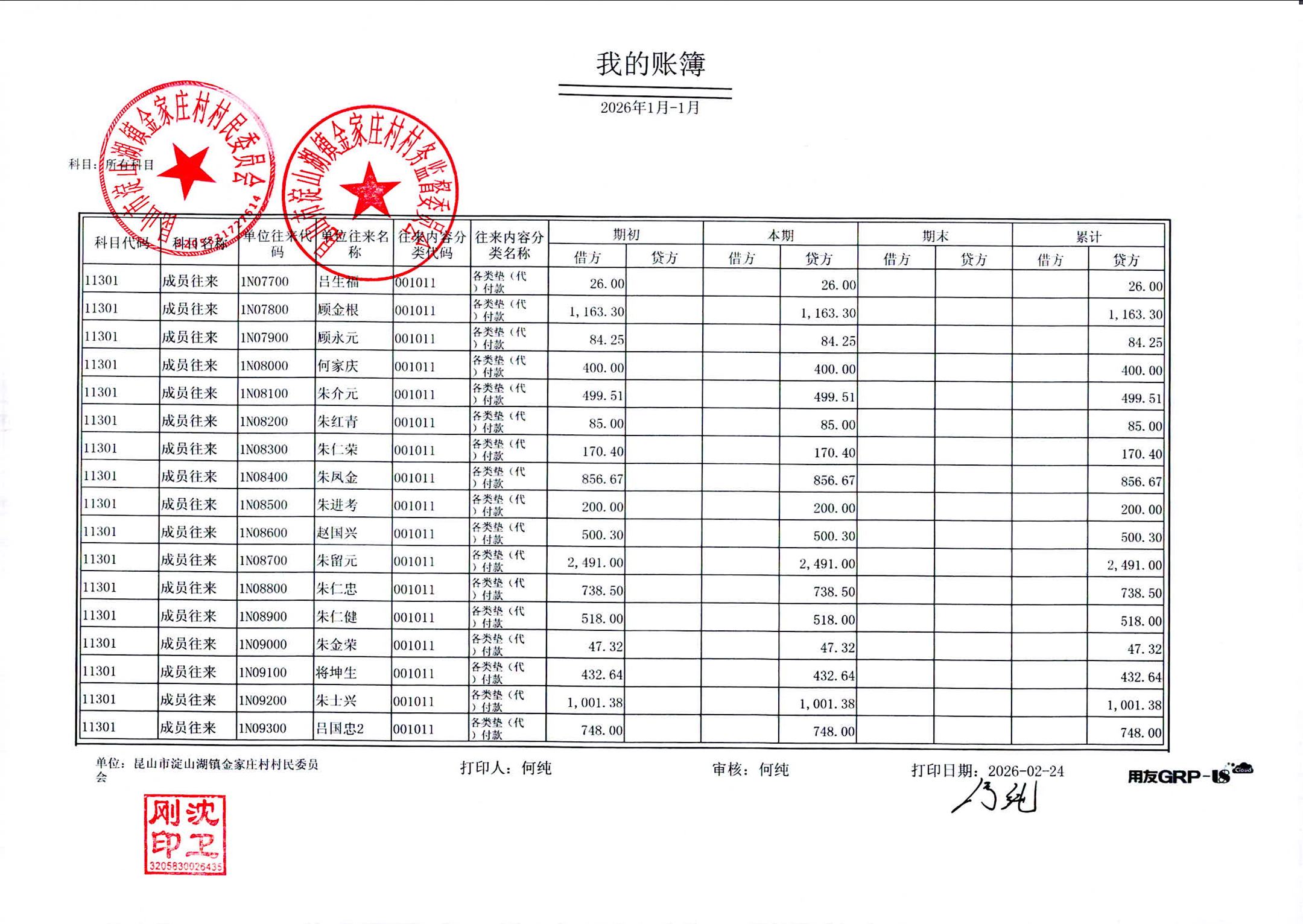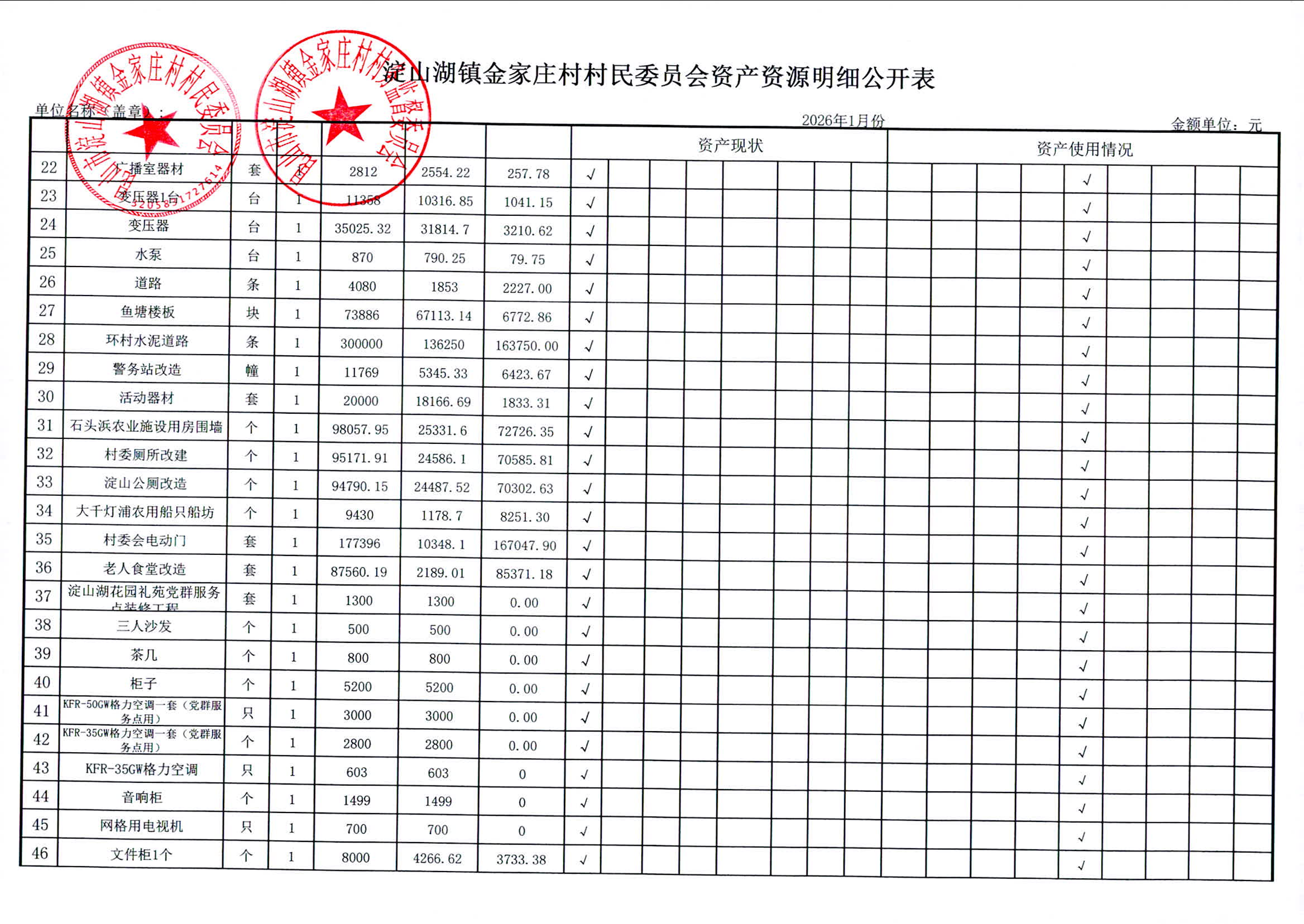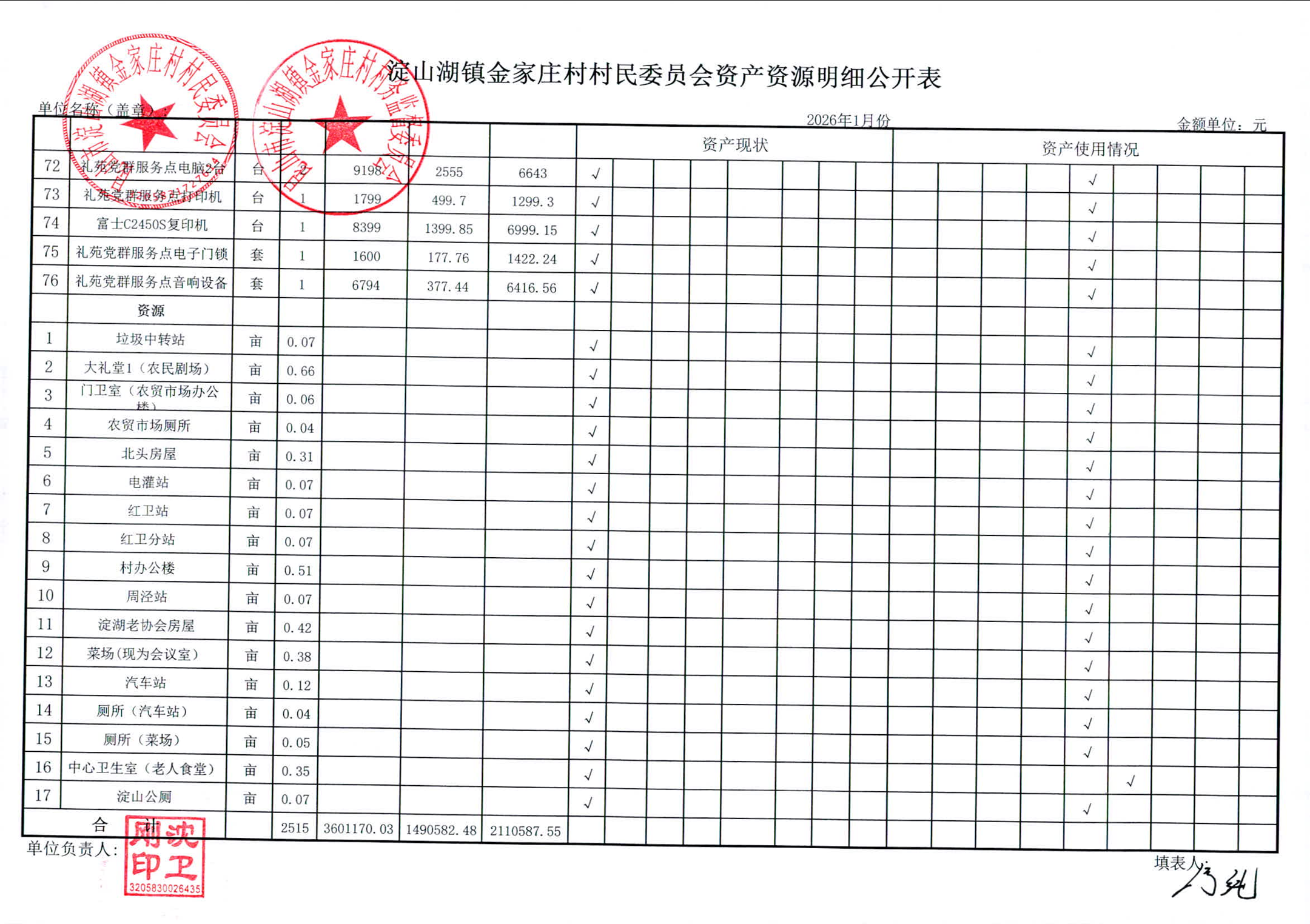 2026年1月金家庄村村民委员会财务公开