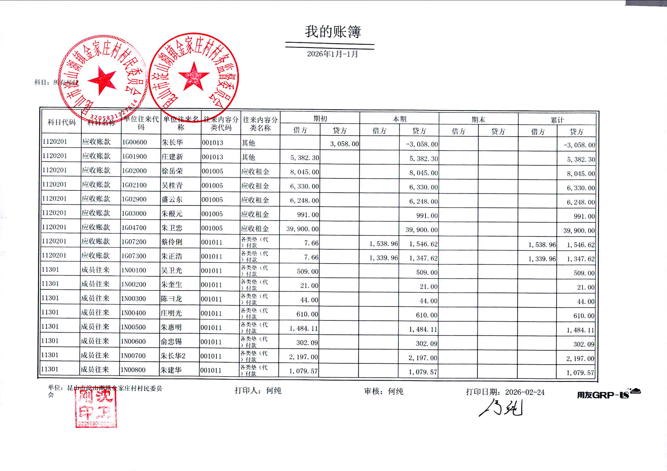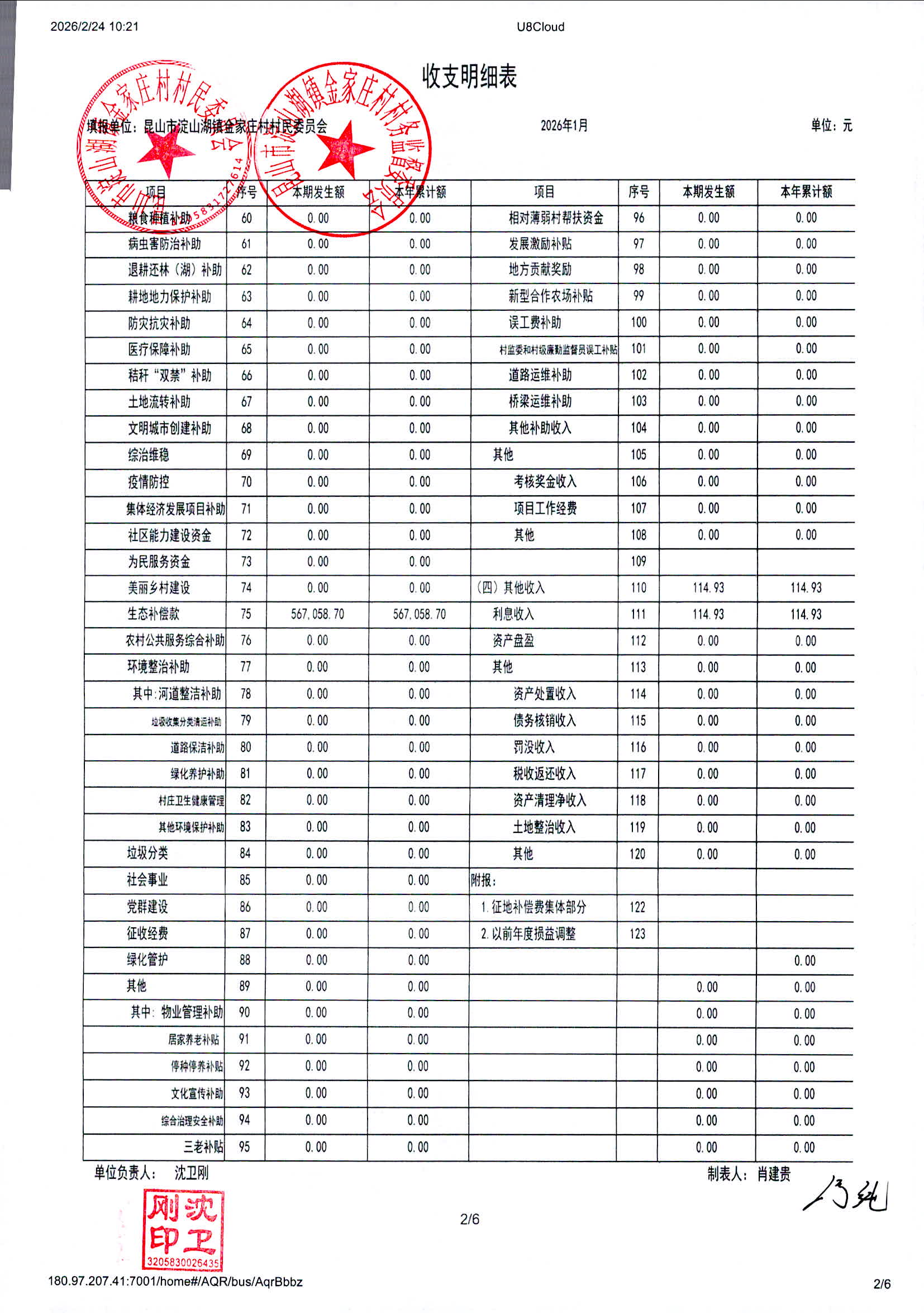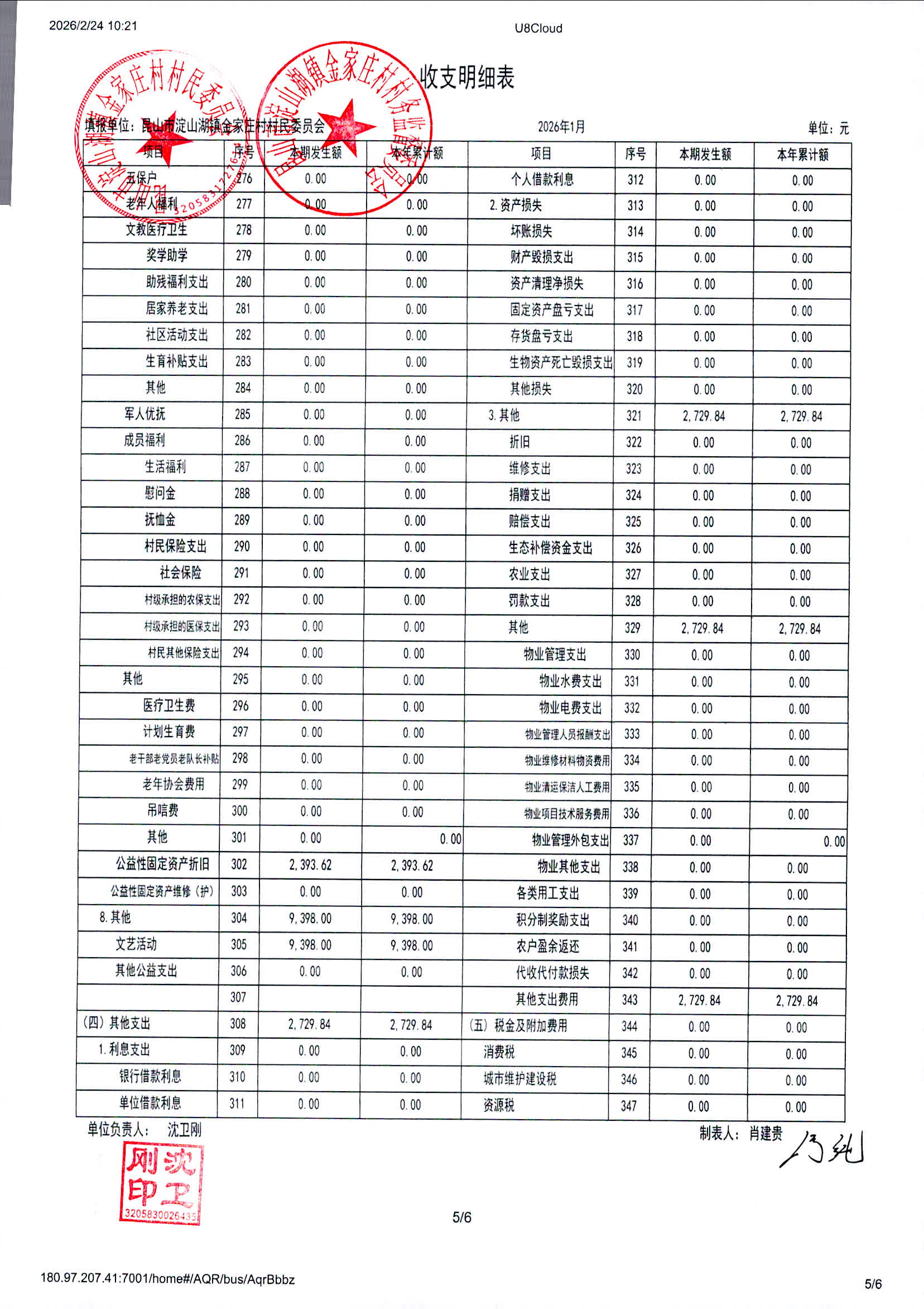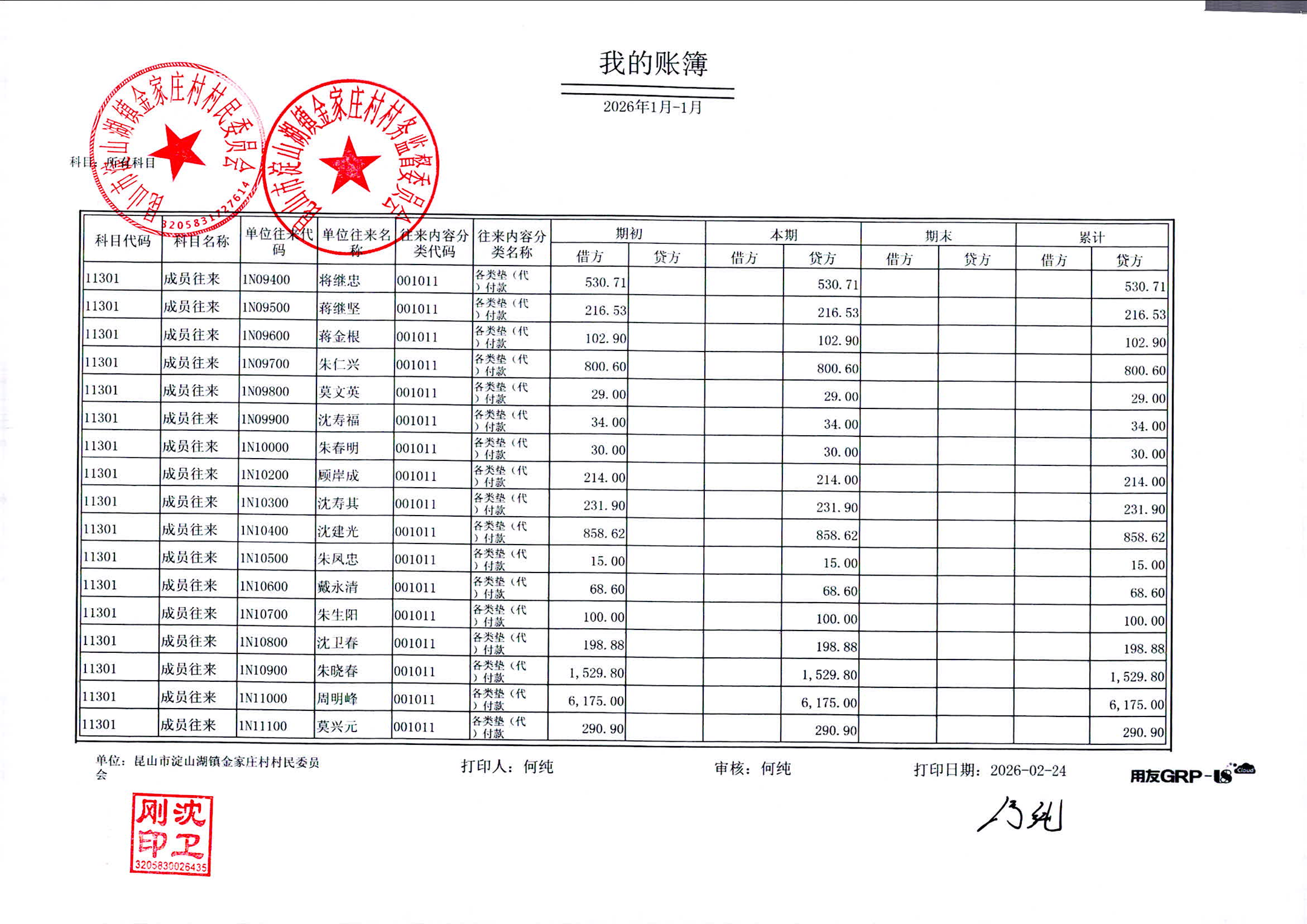 2026年1月金家庄村村民委员会财务公开