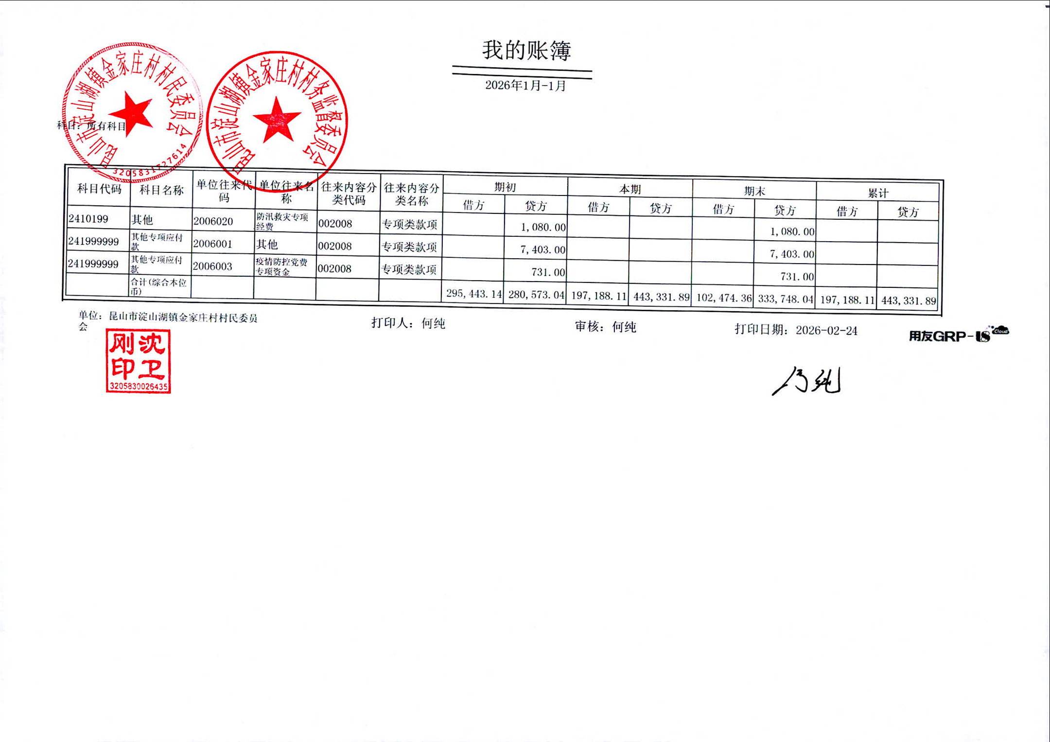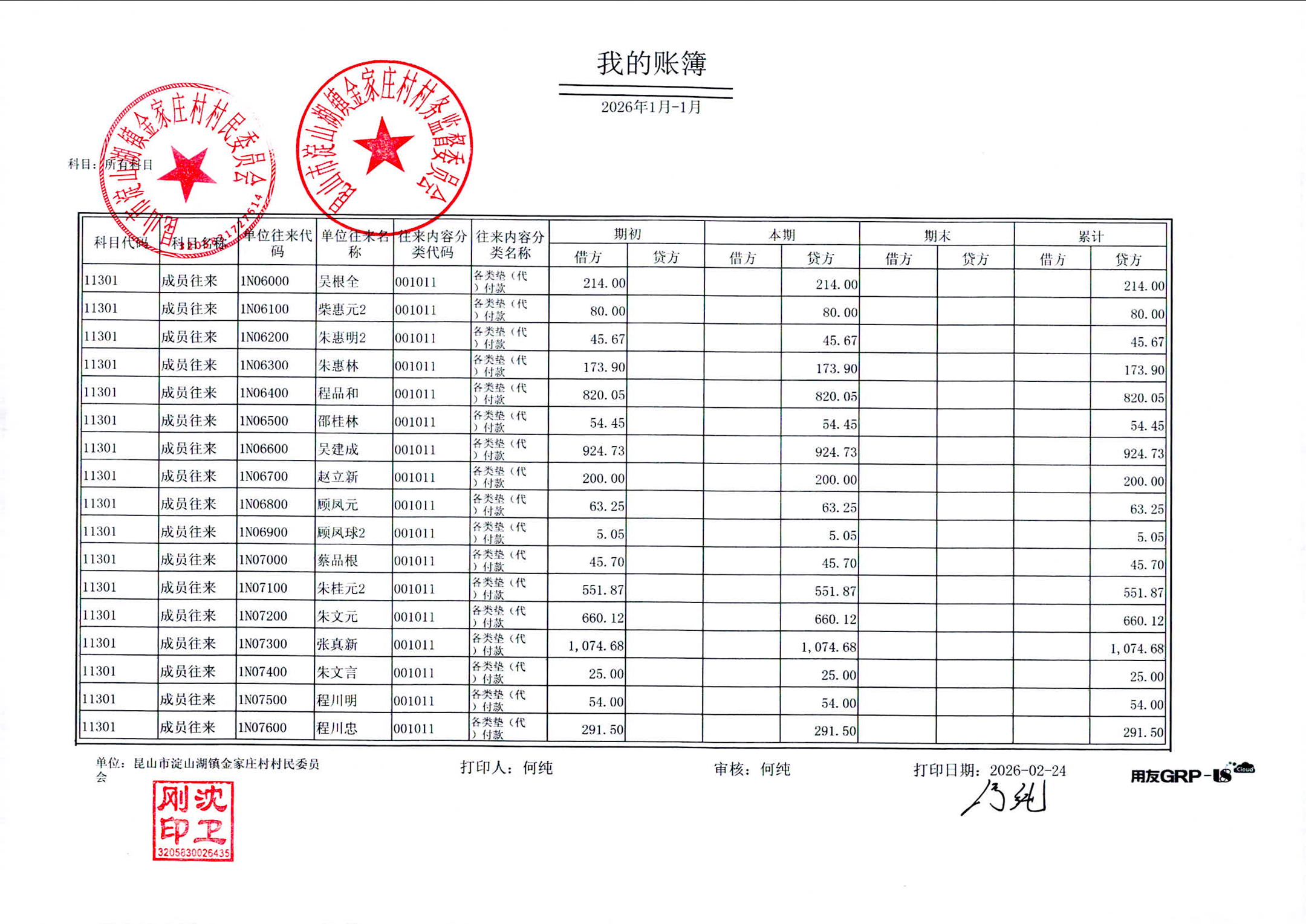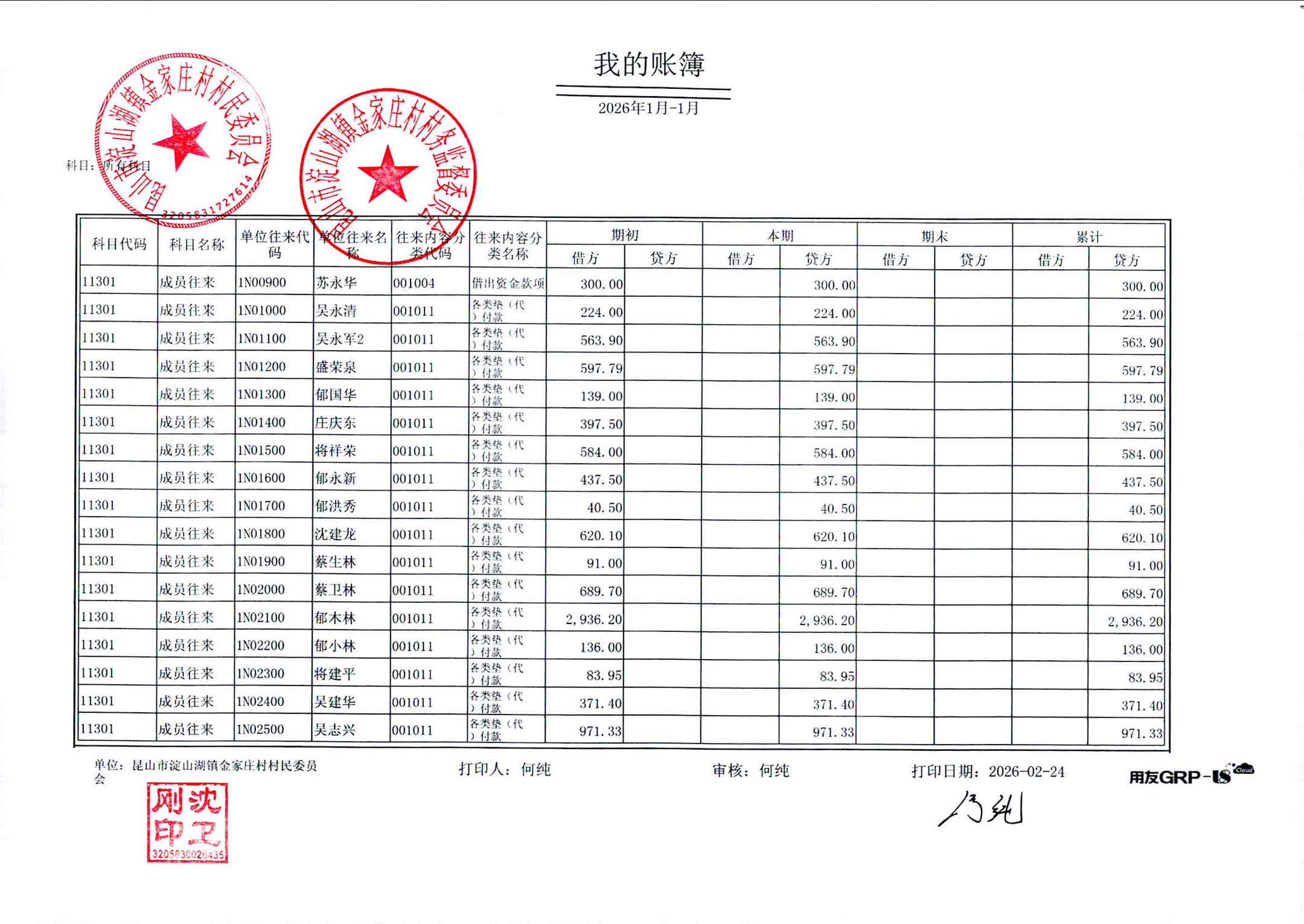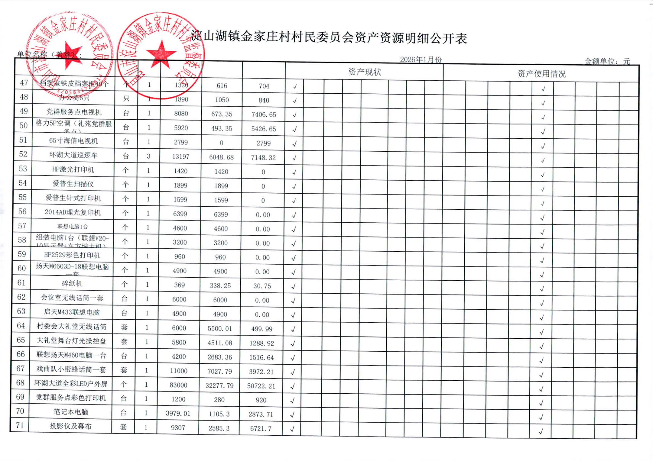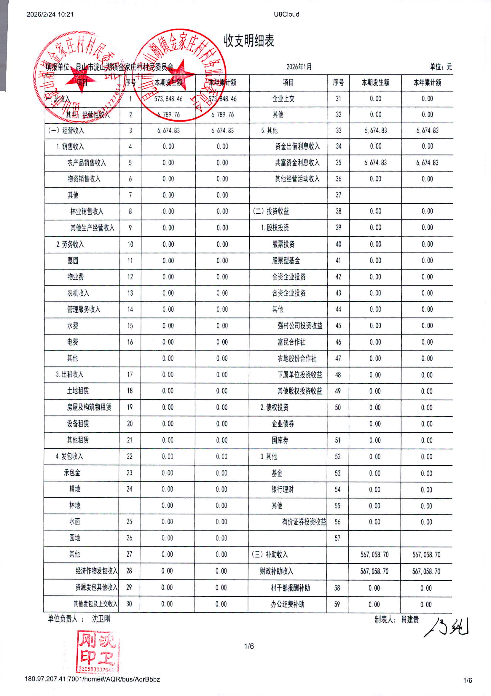 2026年1月金家庄村村民委员会财务公开