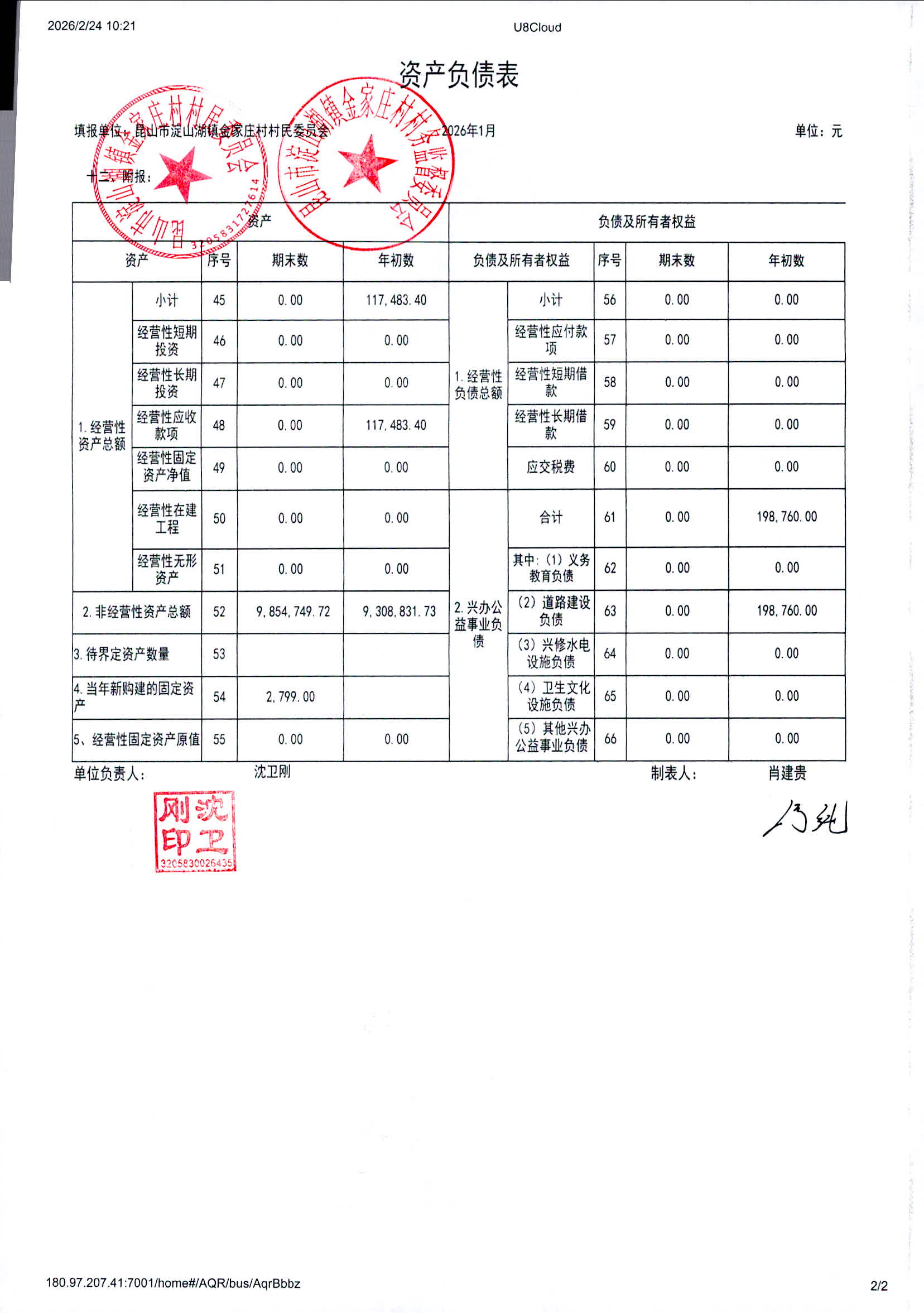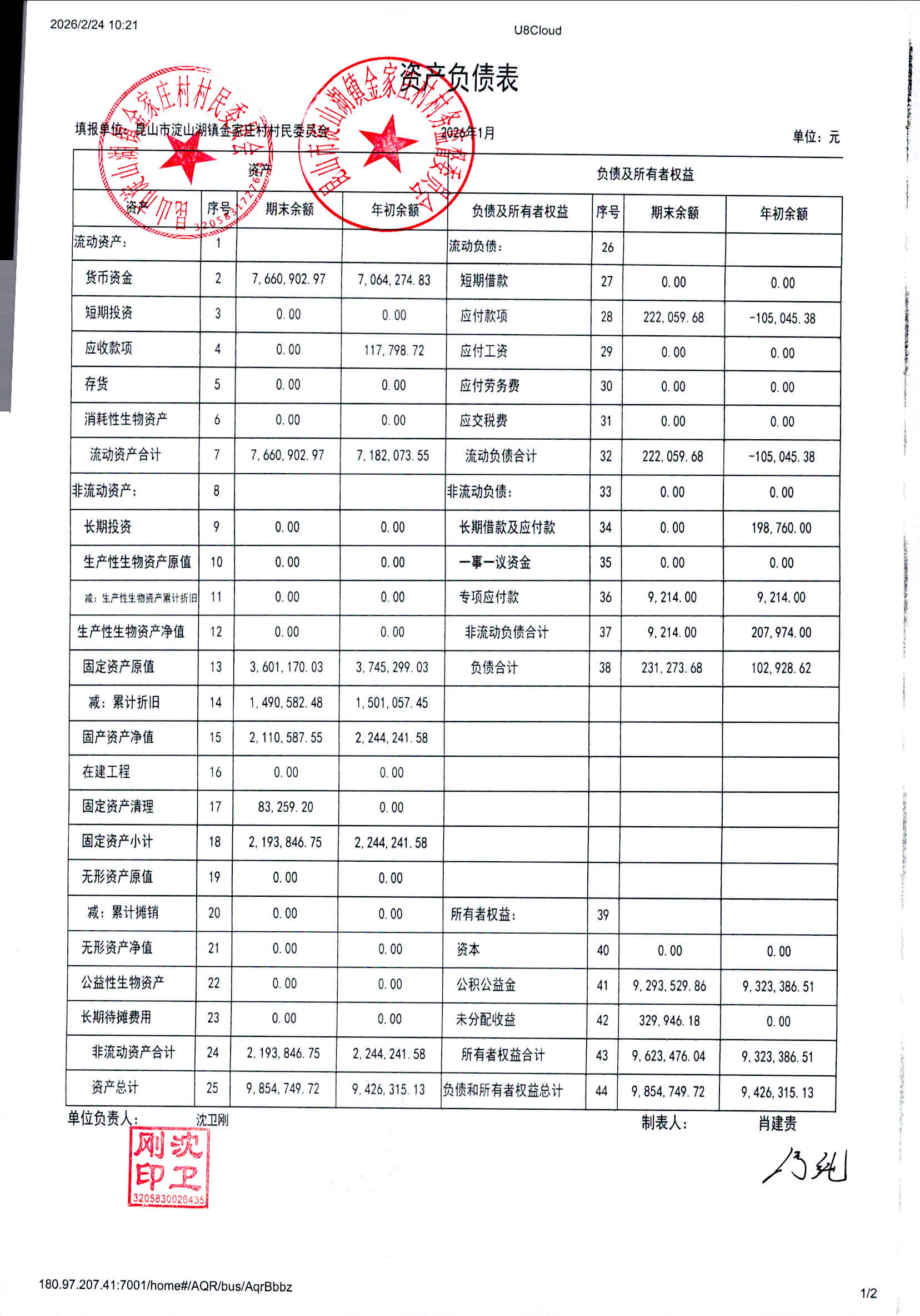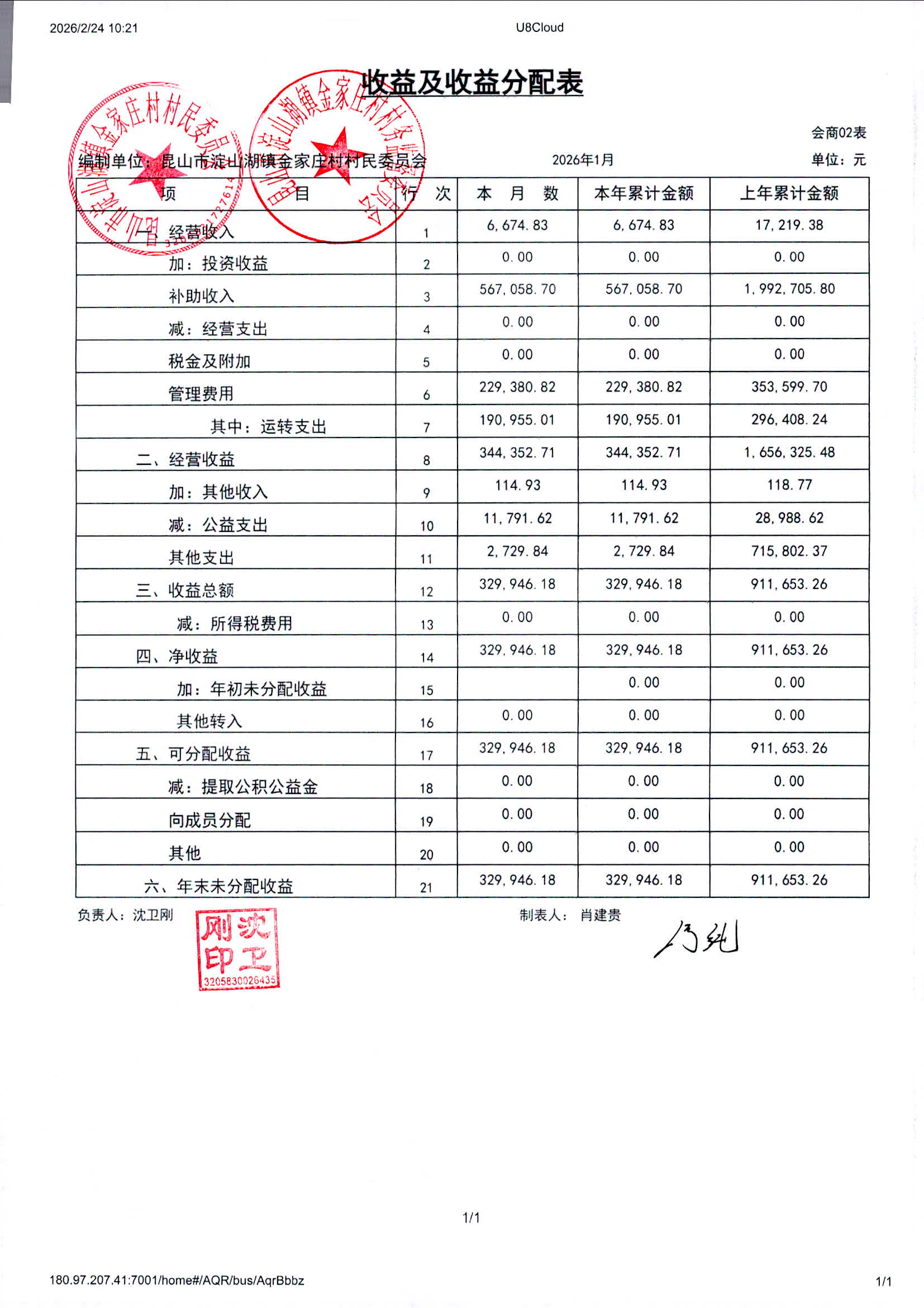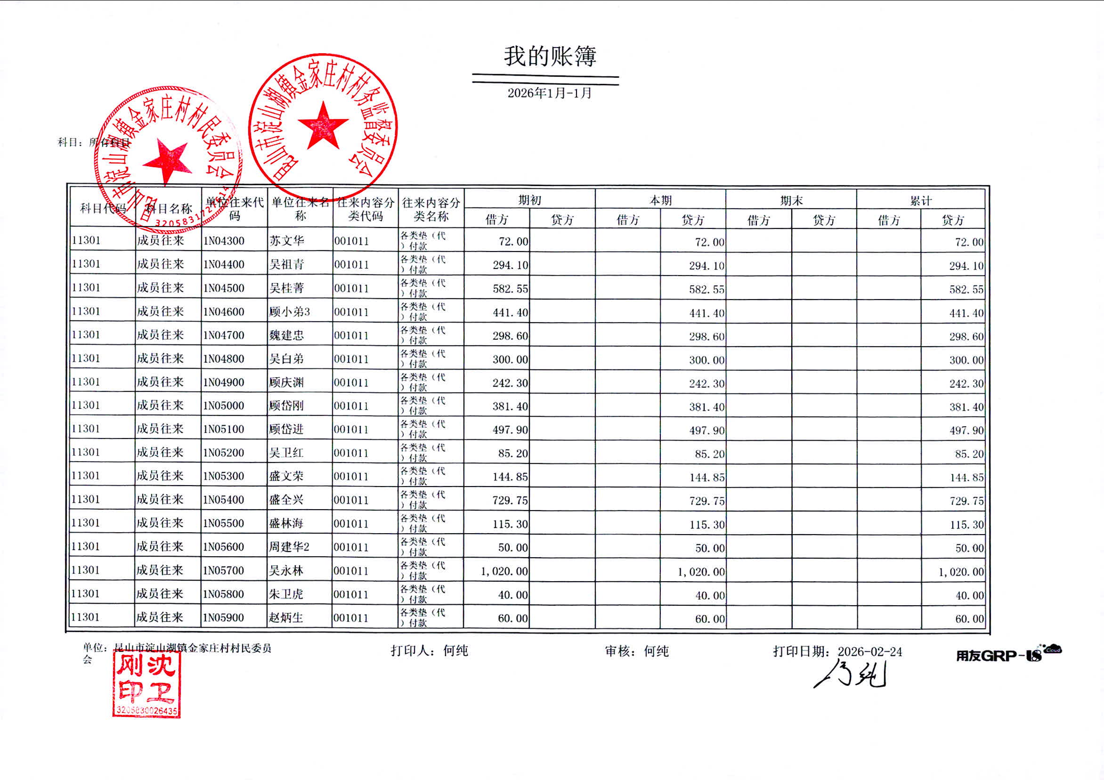 2026年1月金家庄村村民委员会财务公开