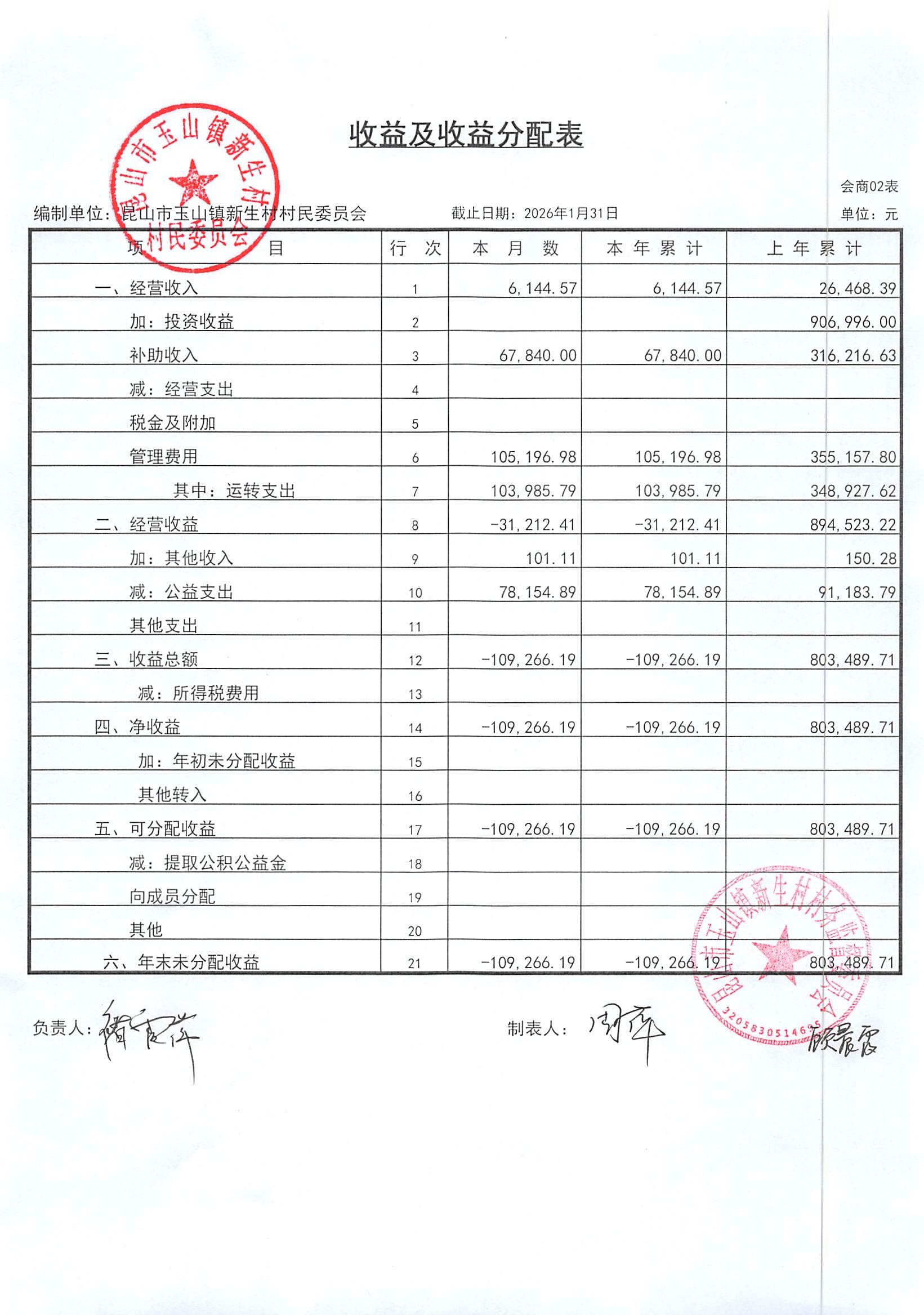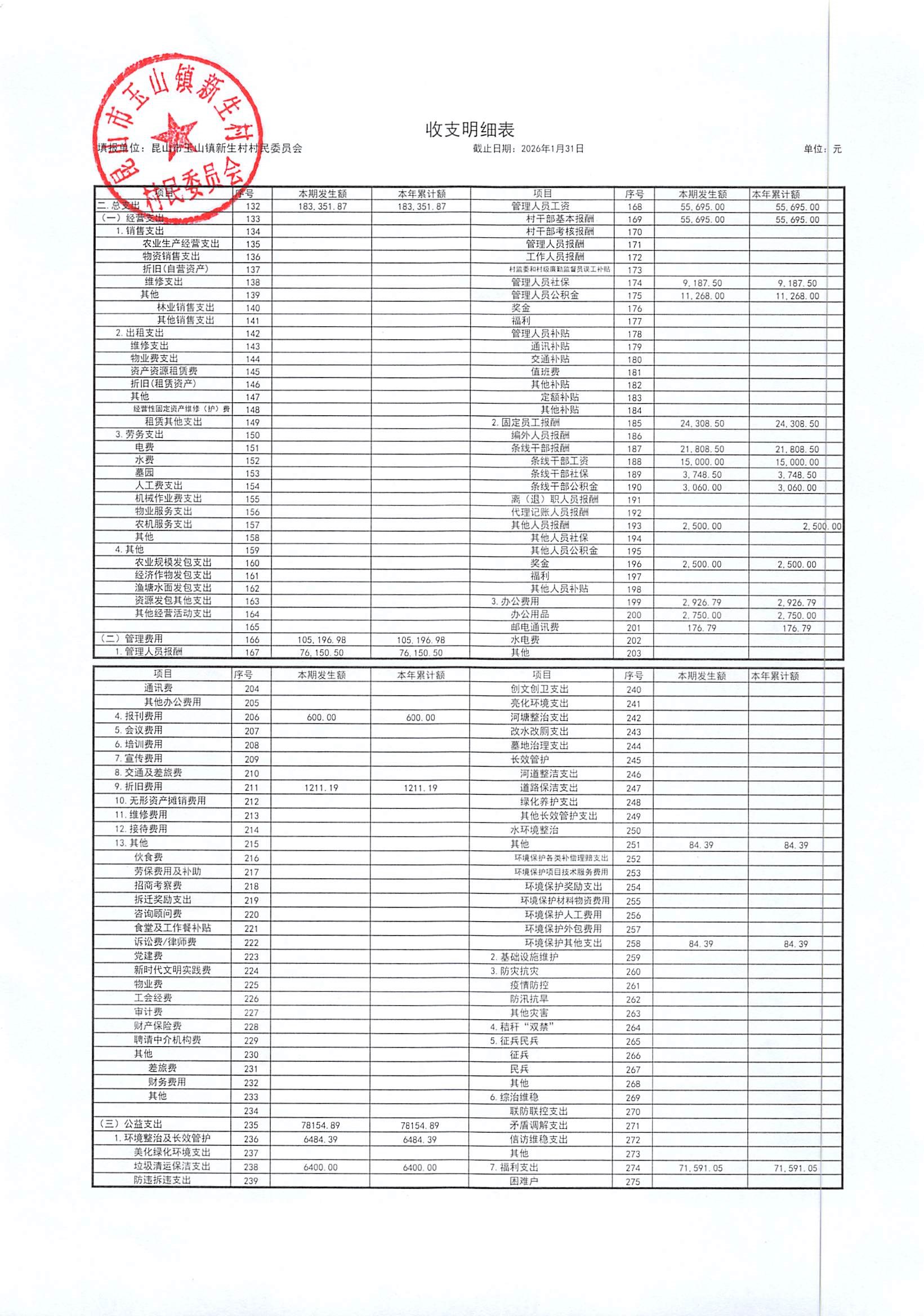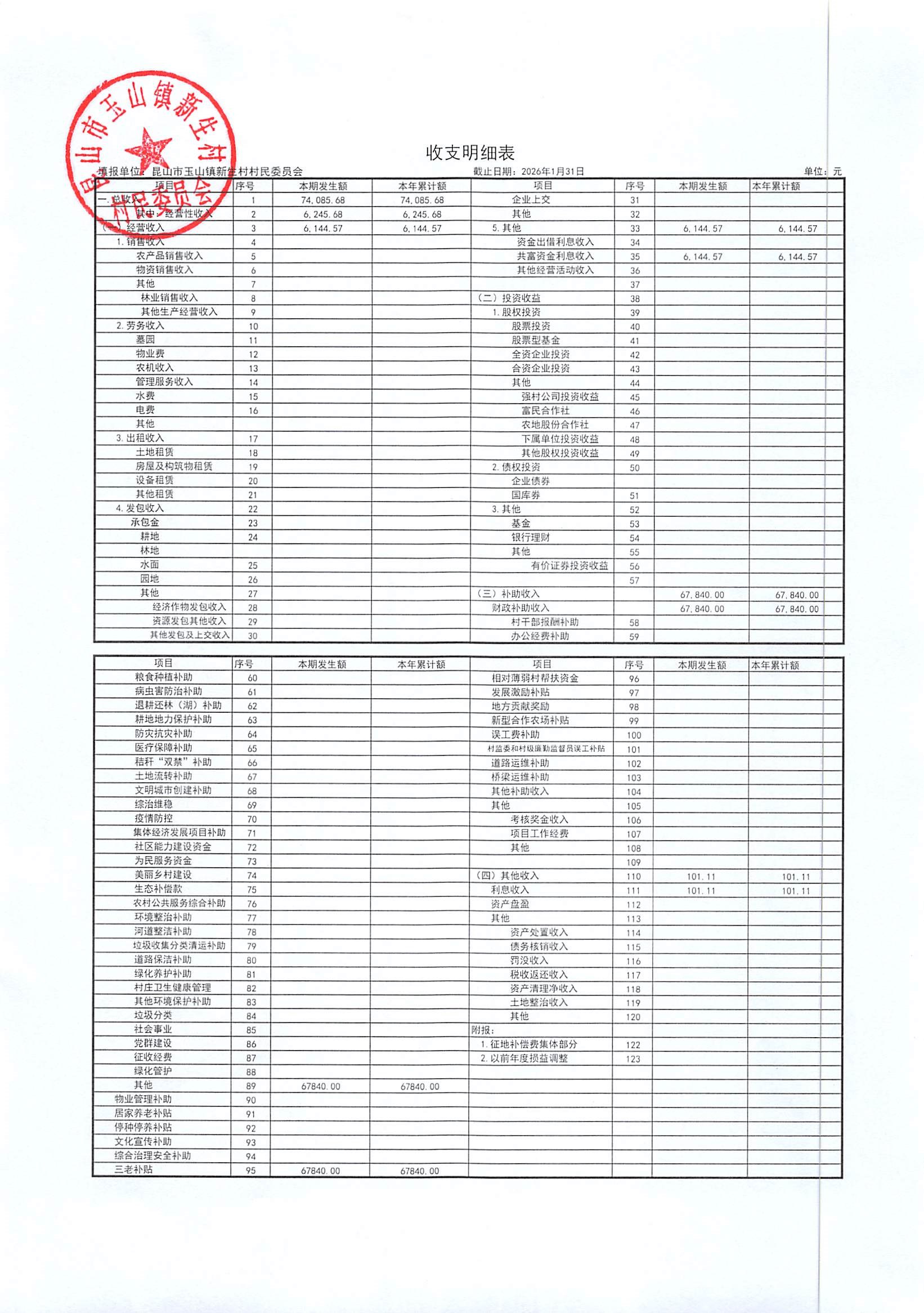 2026年2月新生村村民委员会财务公开
