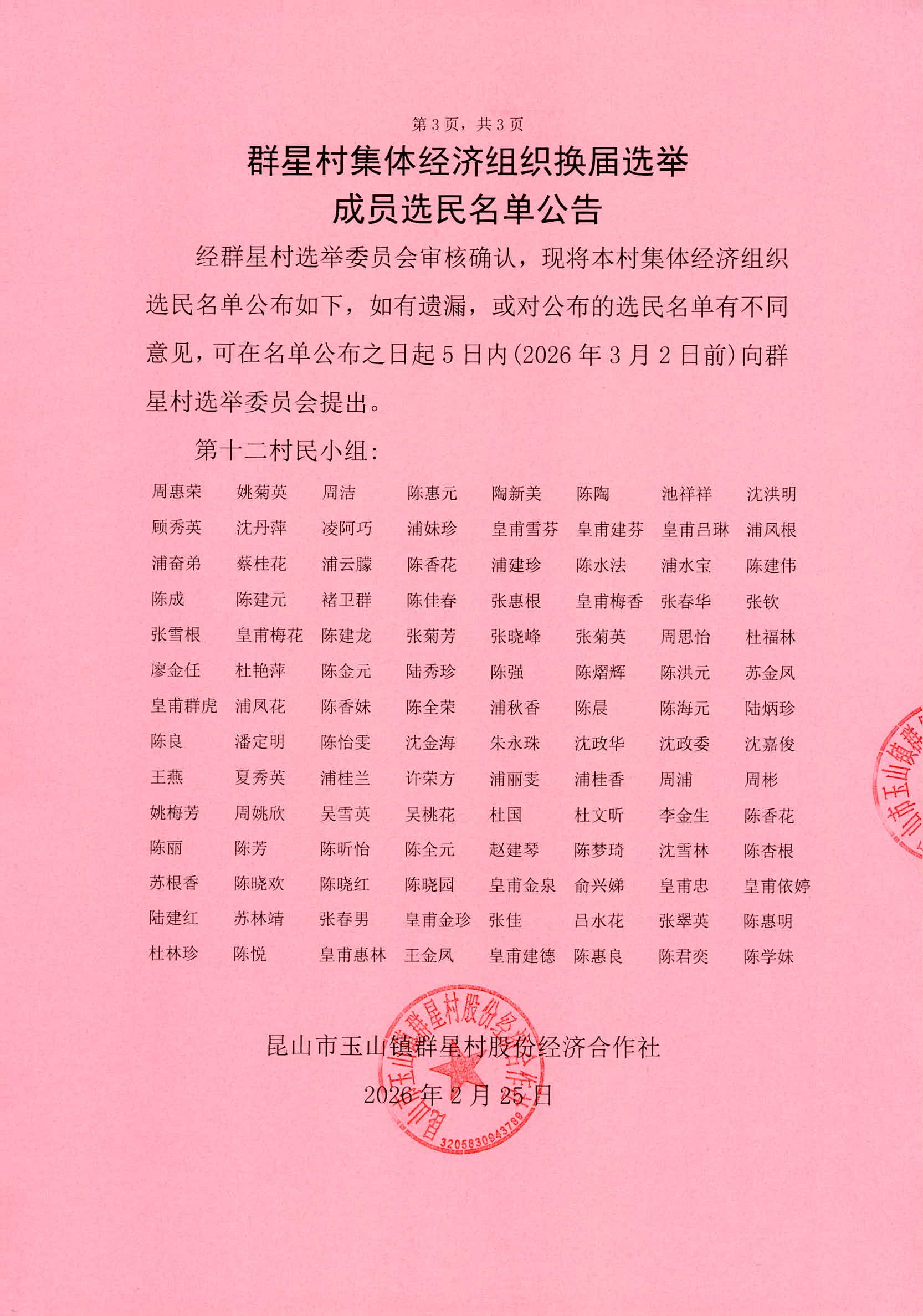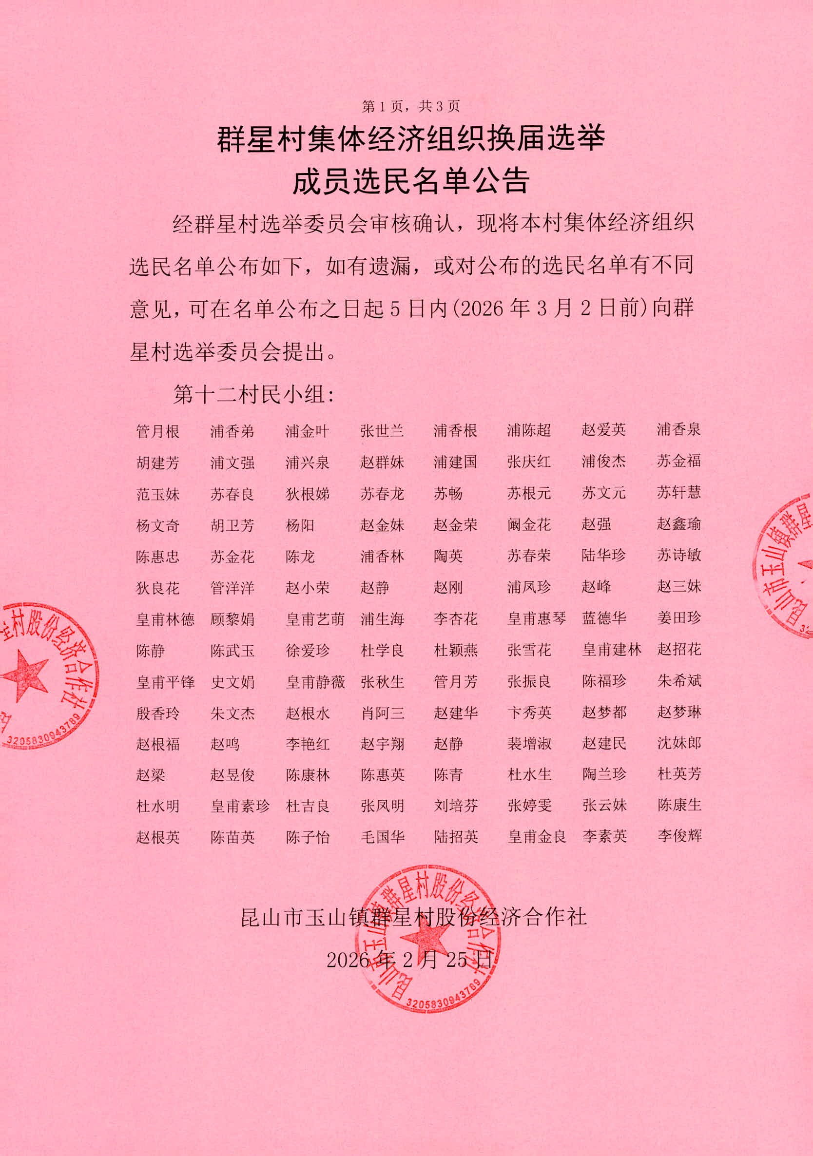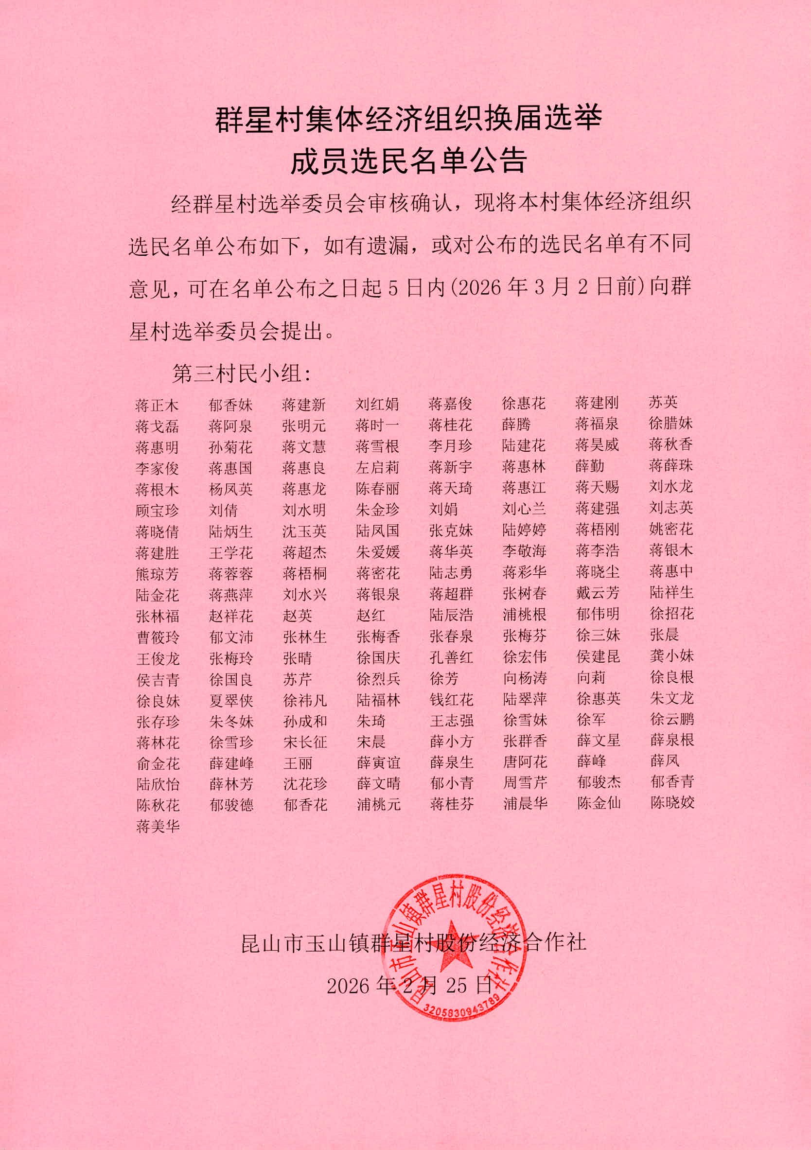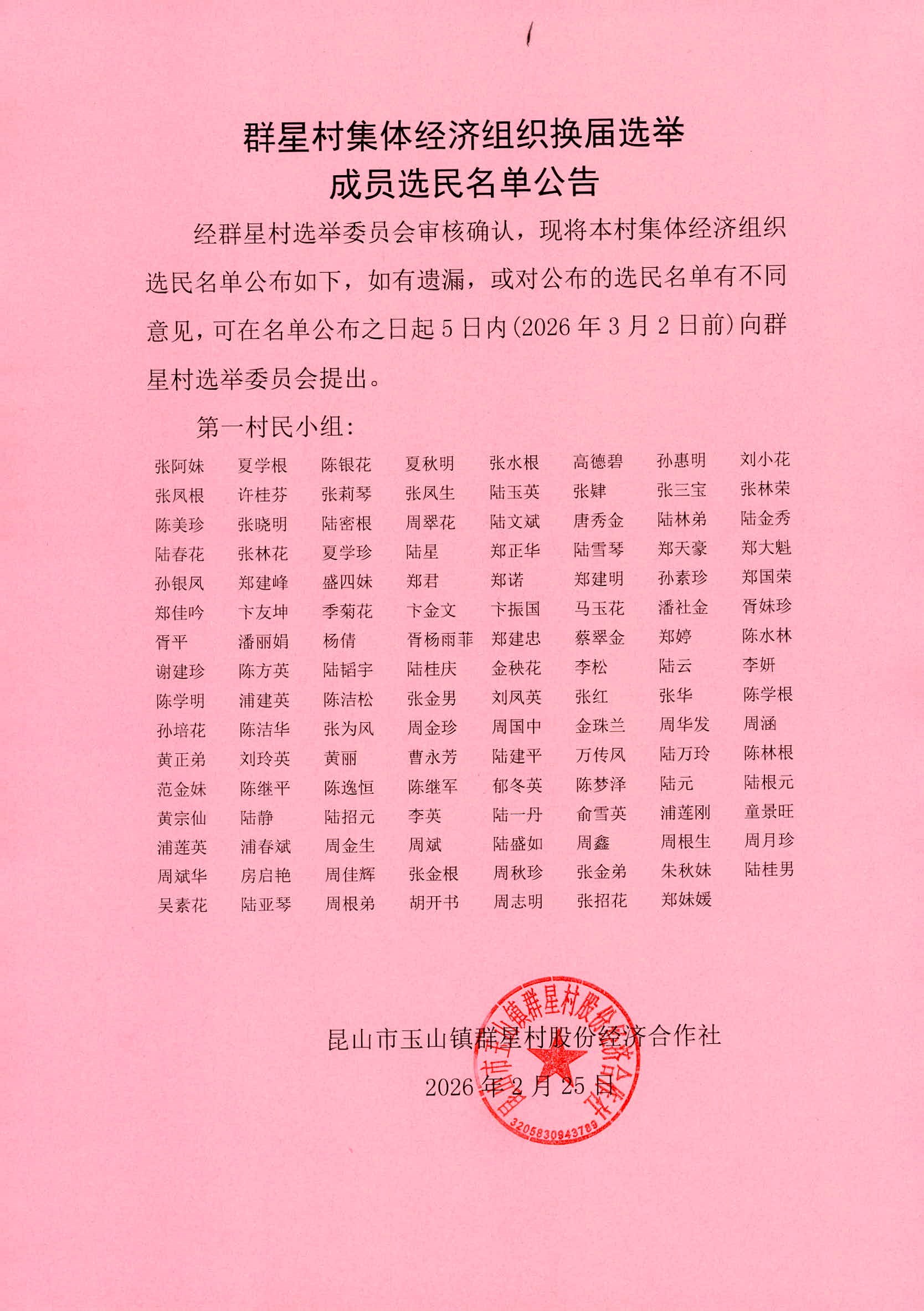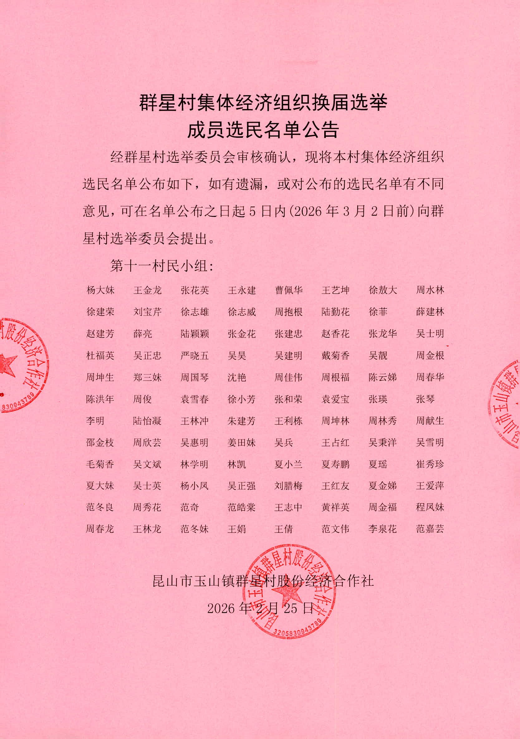 昆山市玉山镇群星村集体经济组织换届选举选民名单公告