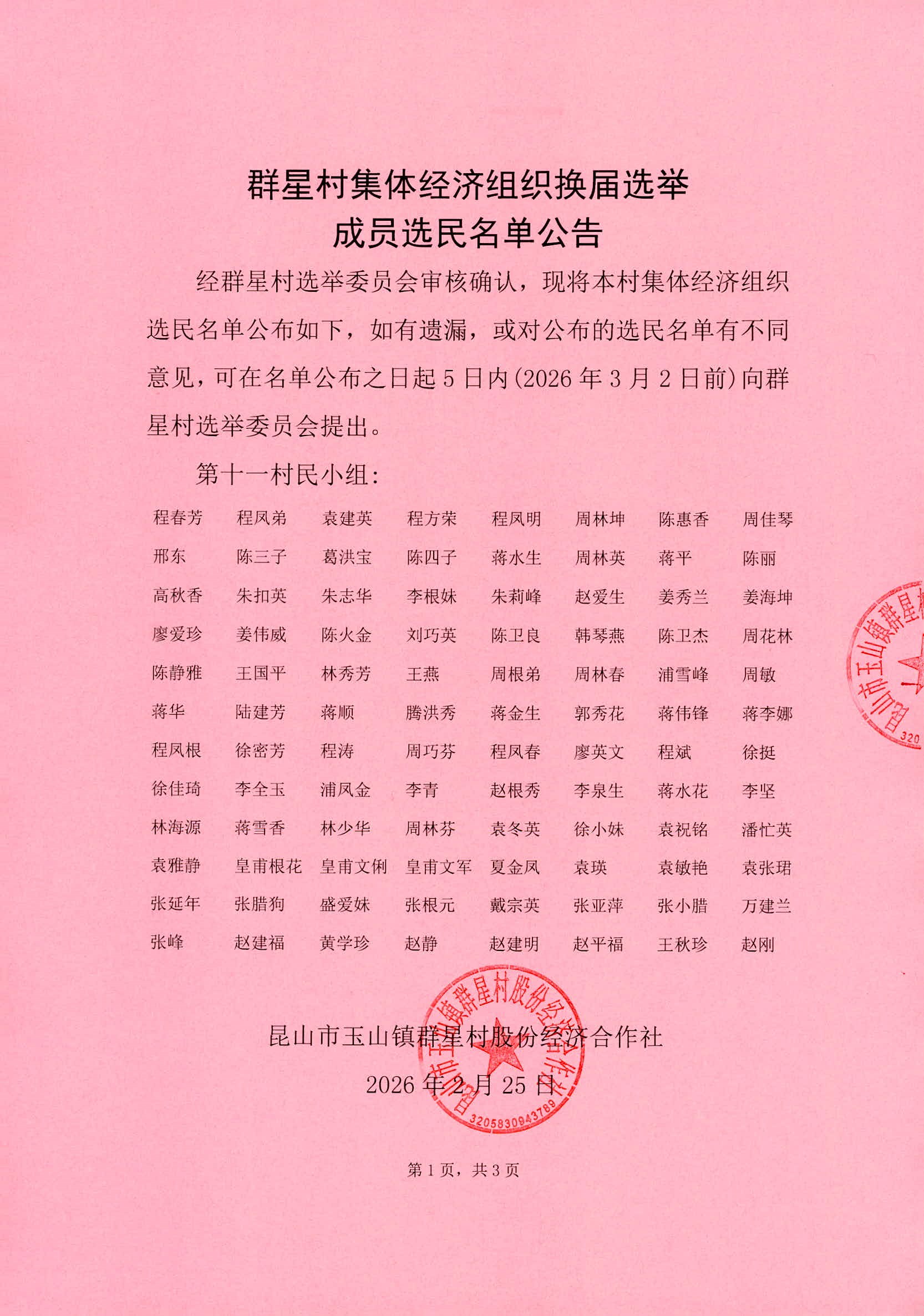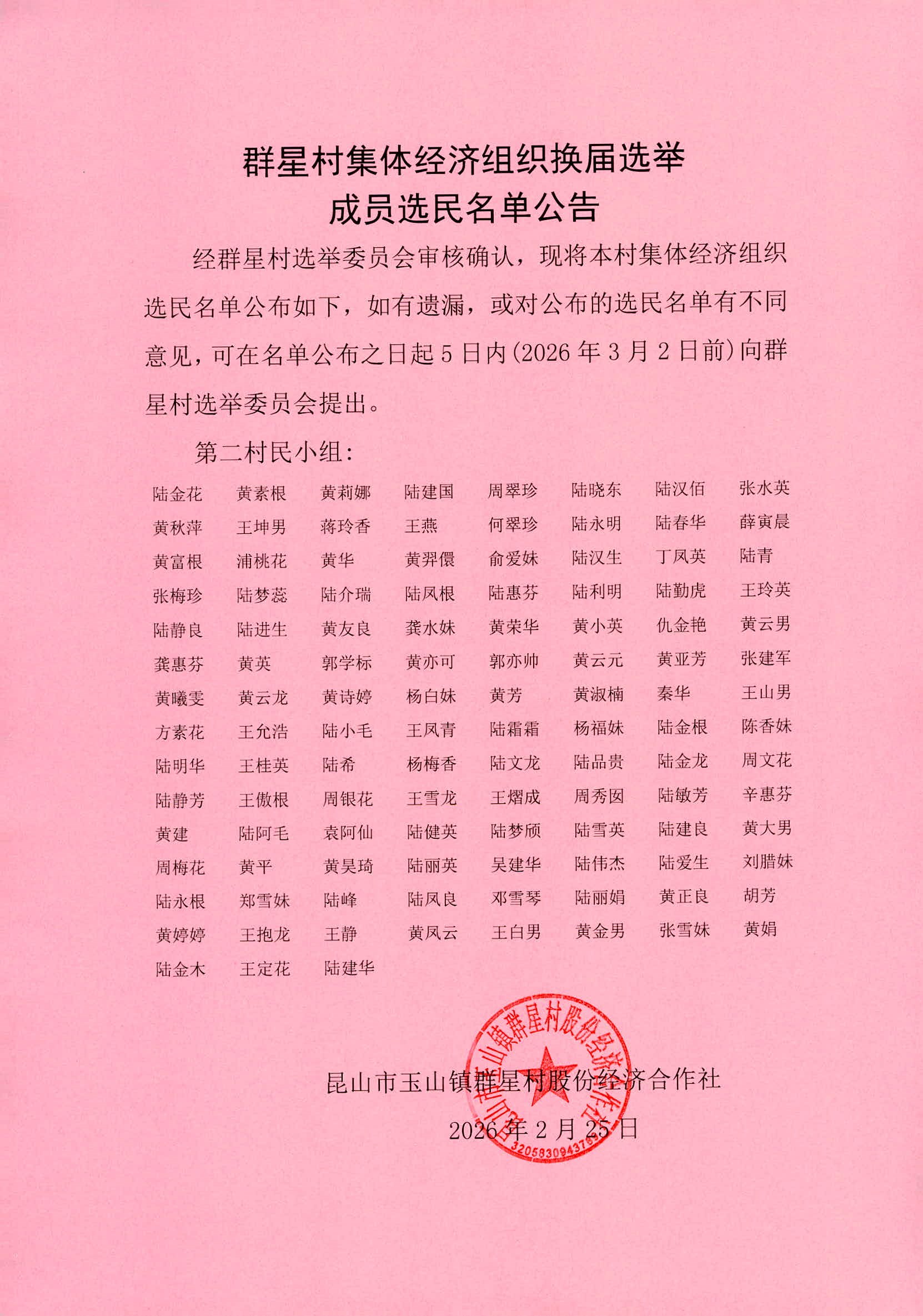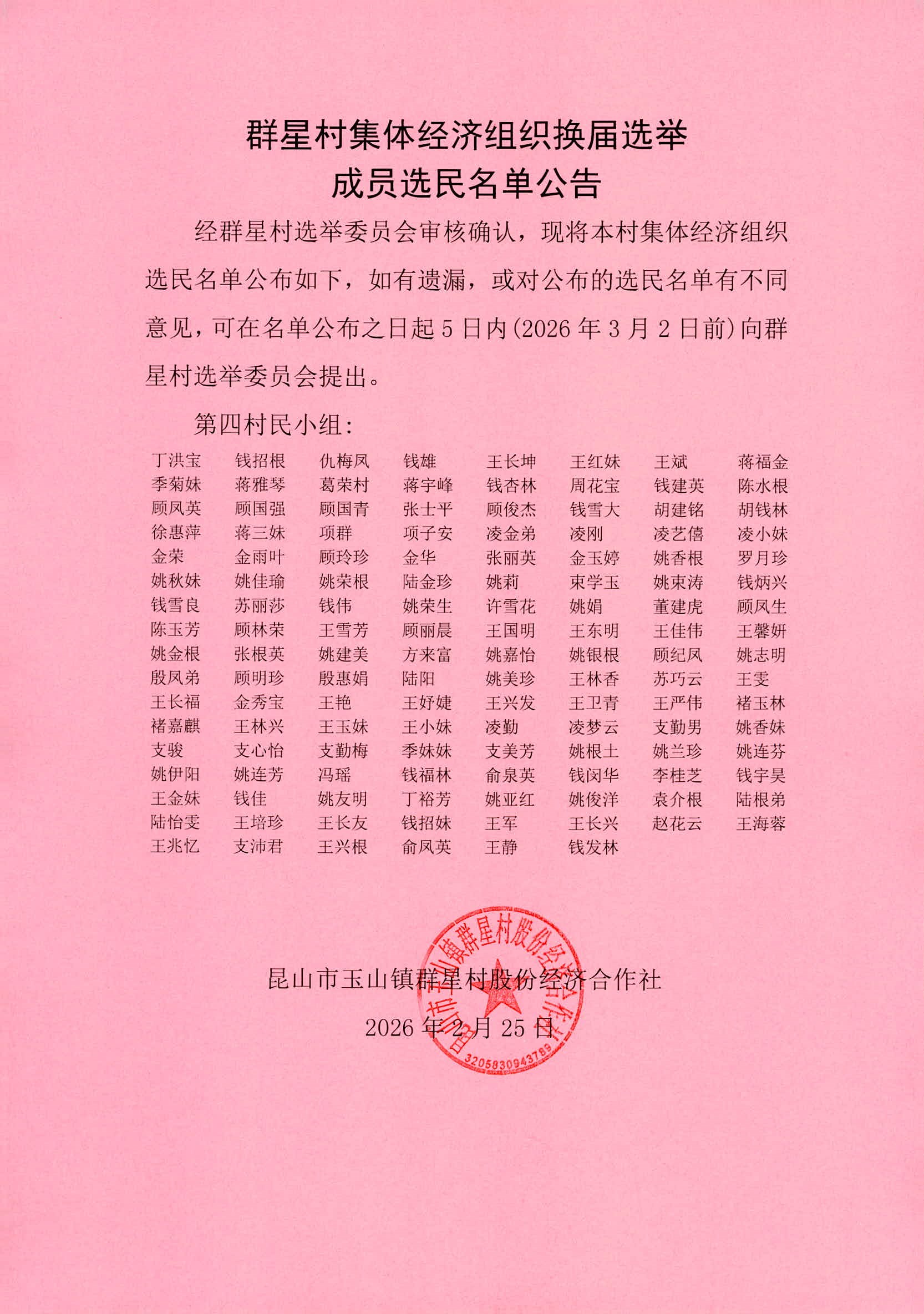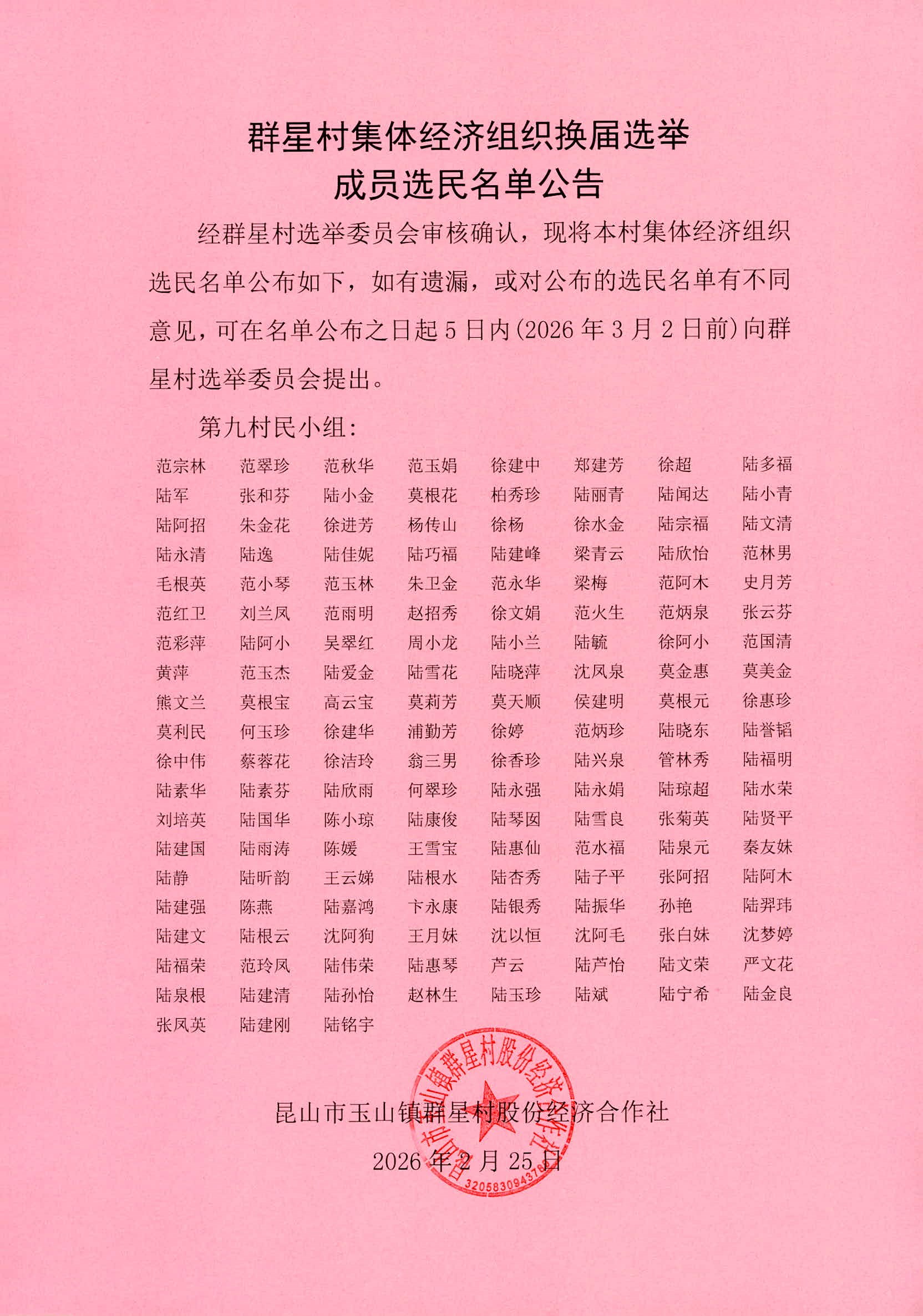 昆山市玉山镇群星村集体经济组织换届选举选民名单公告