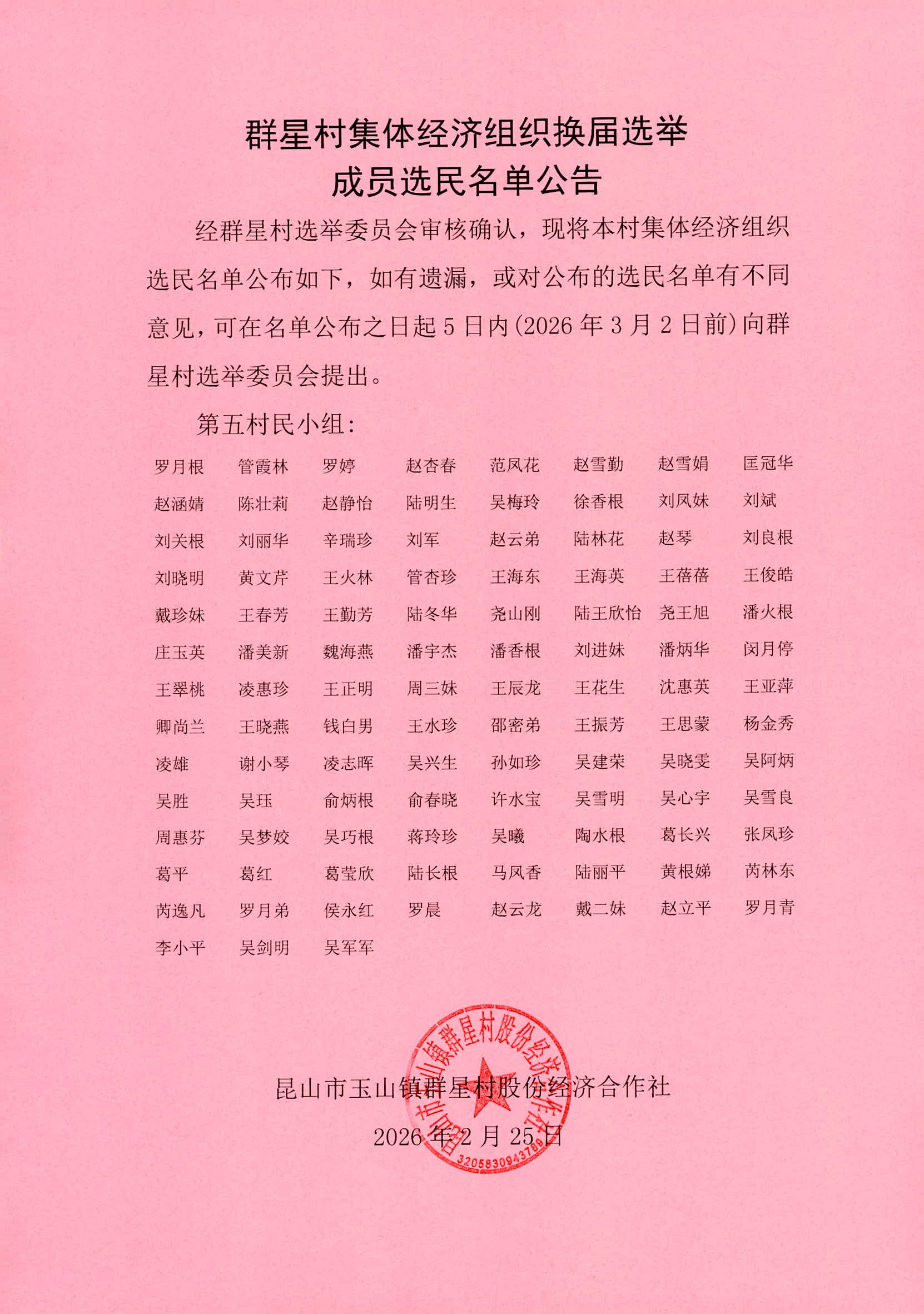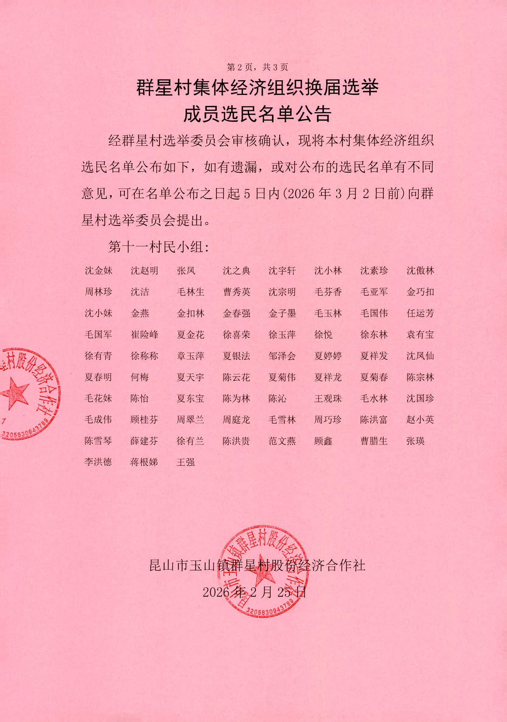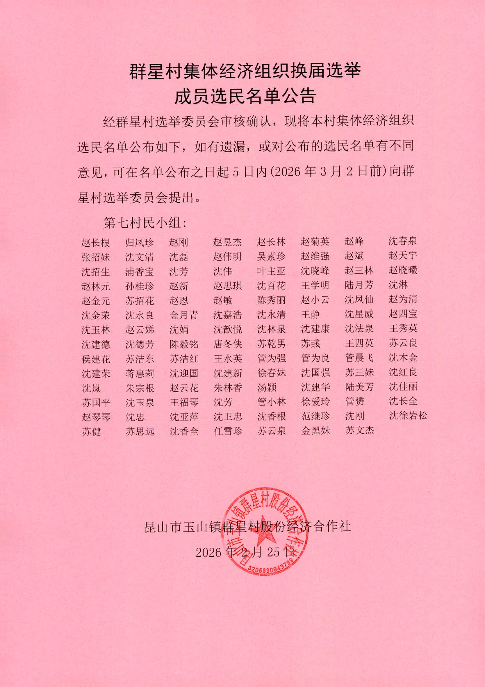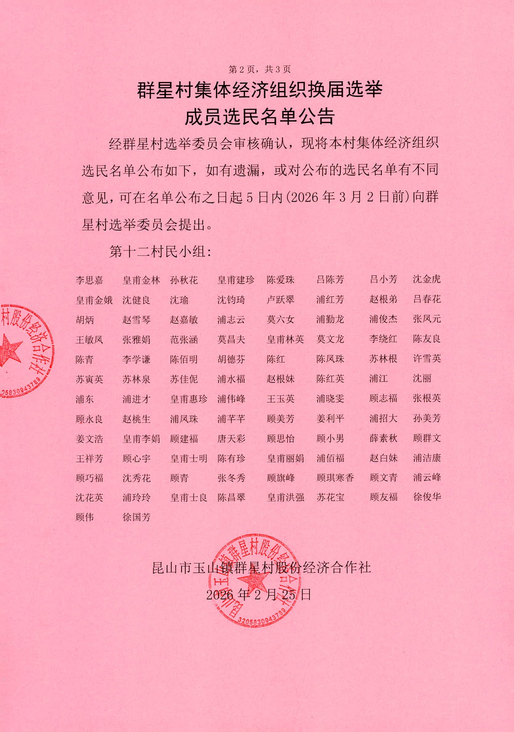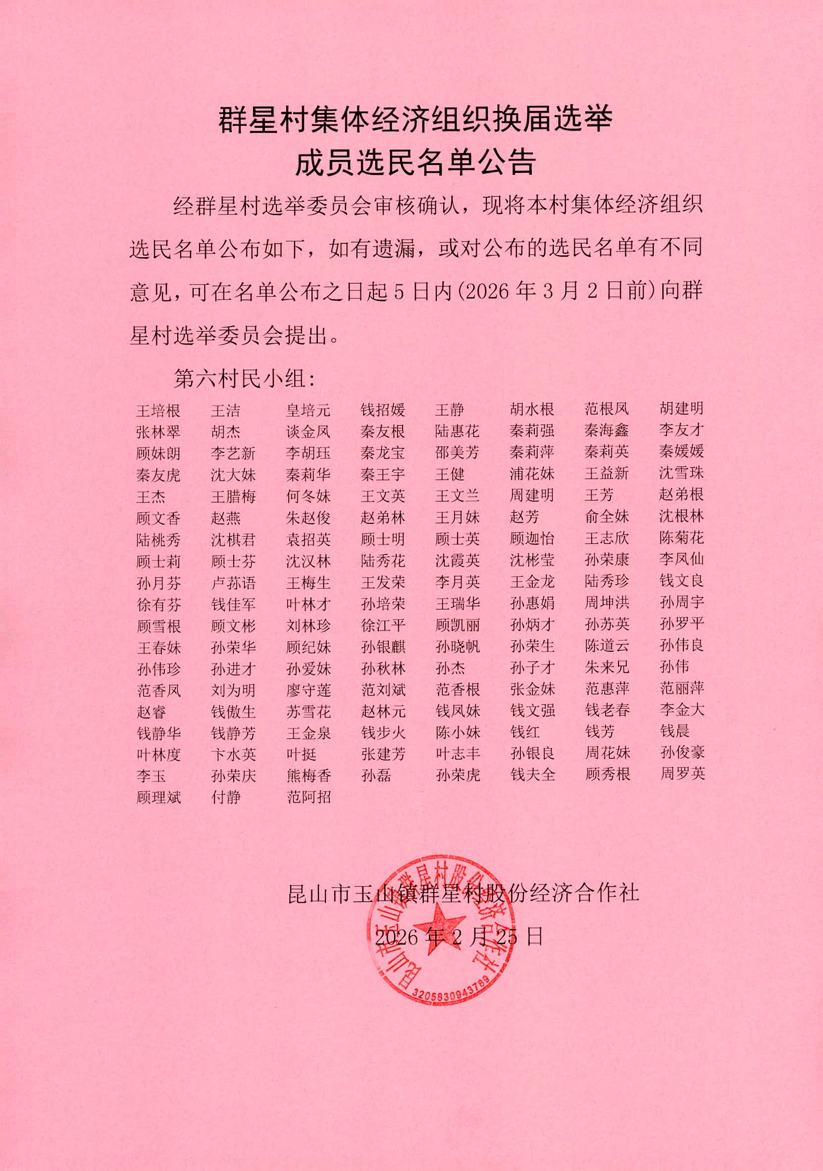 昆山市玉山镇群星村集体经济组织换届选举选民名单公告