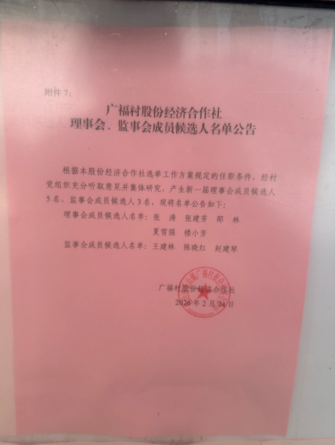 广福村股份经济合作社理事会、监事会成员候选人名单公告