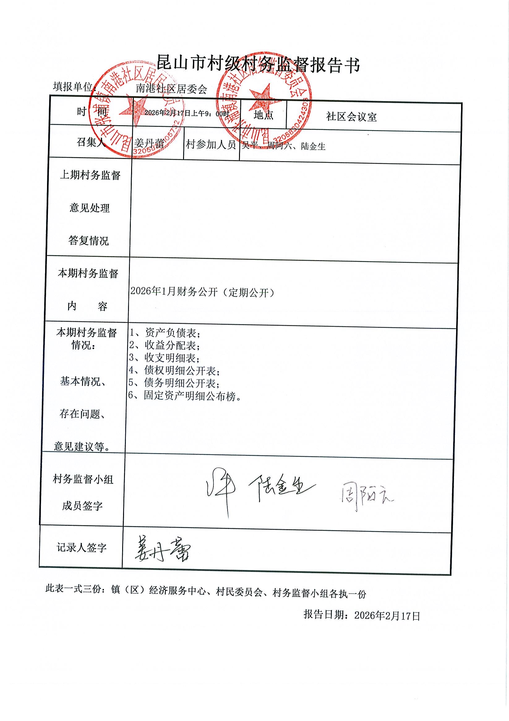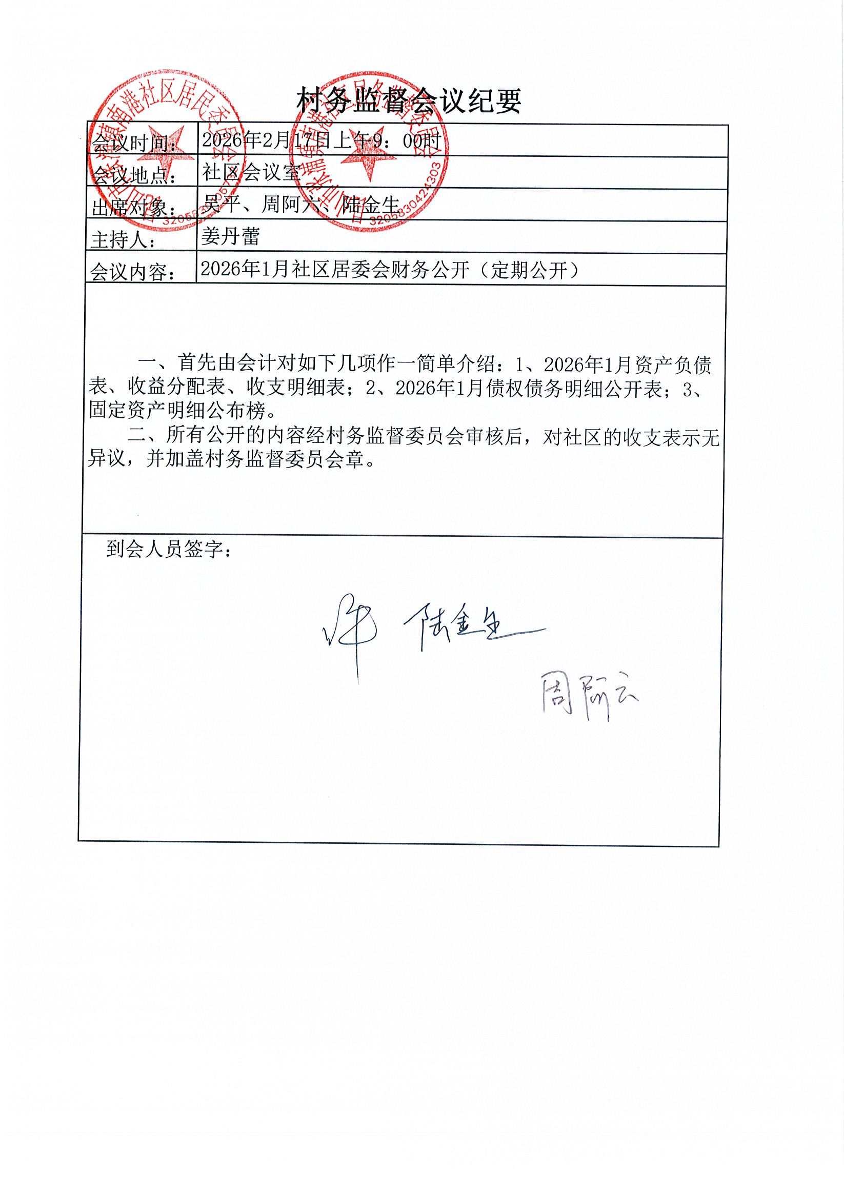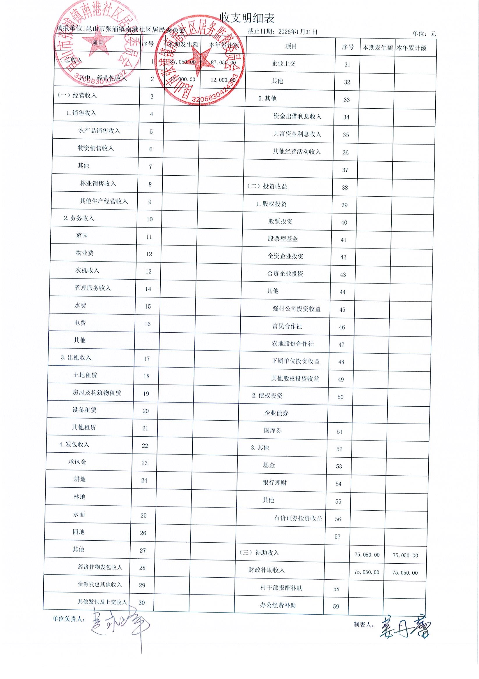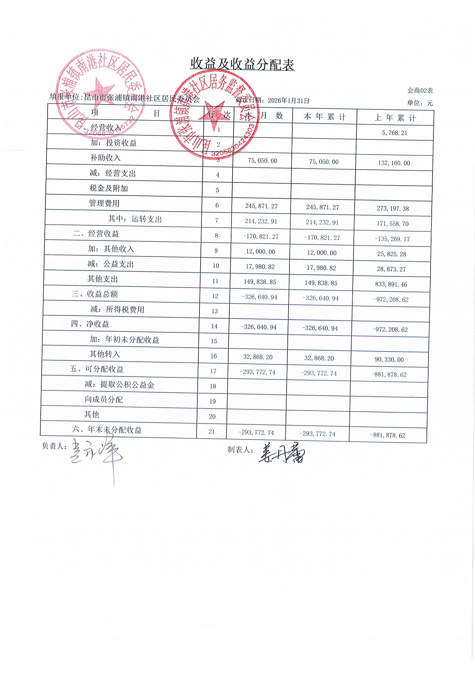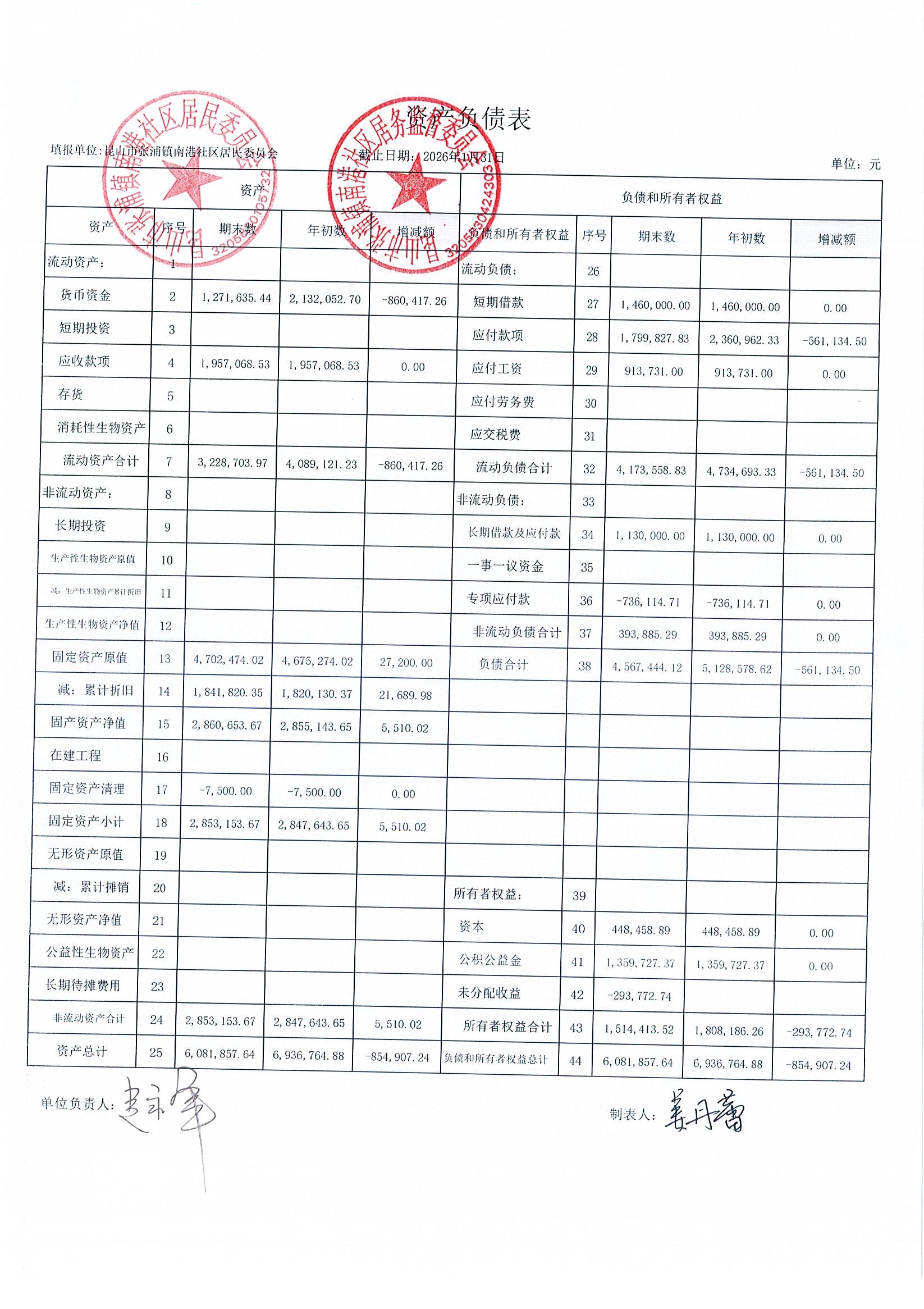 南港社区居委会2026年1月财务公开(定期公开)