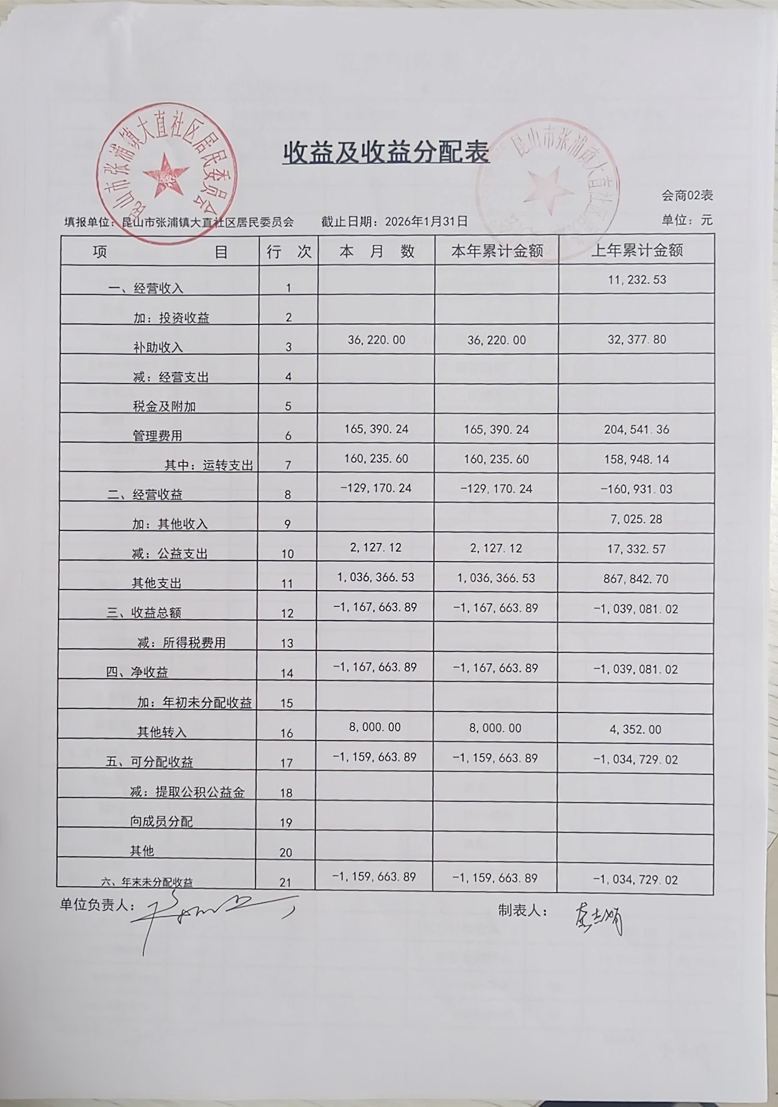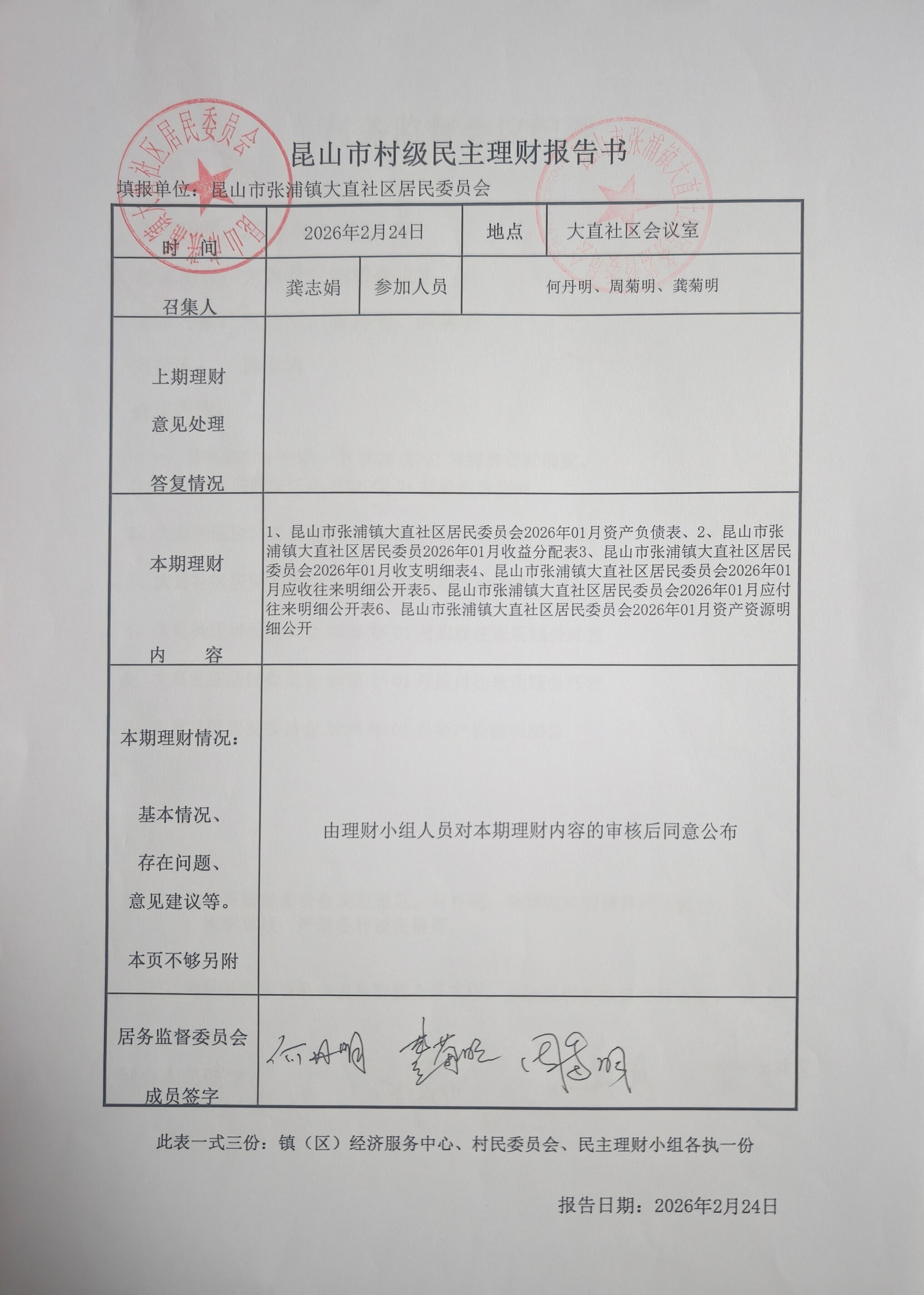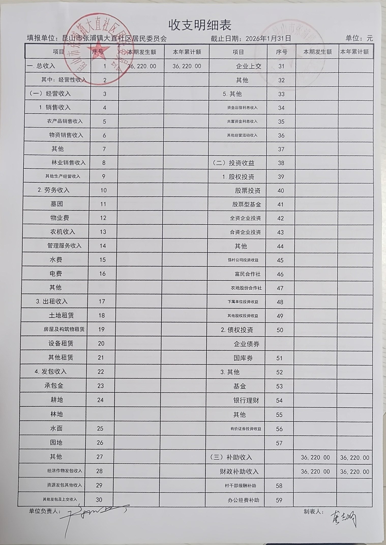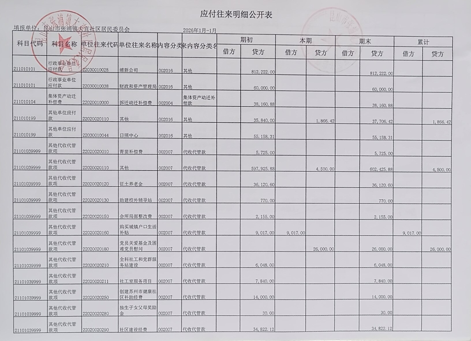 2026年1月大直社区居民委员会财务公开