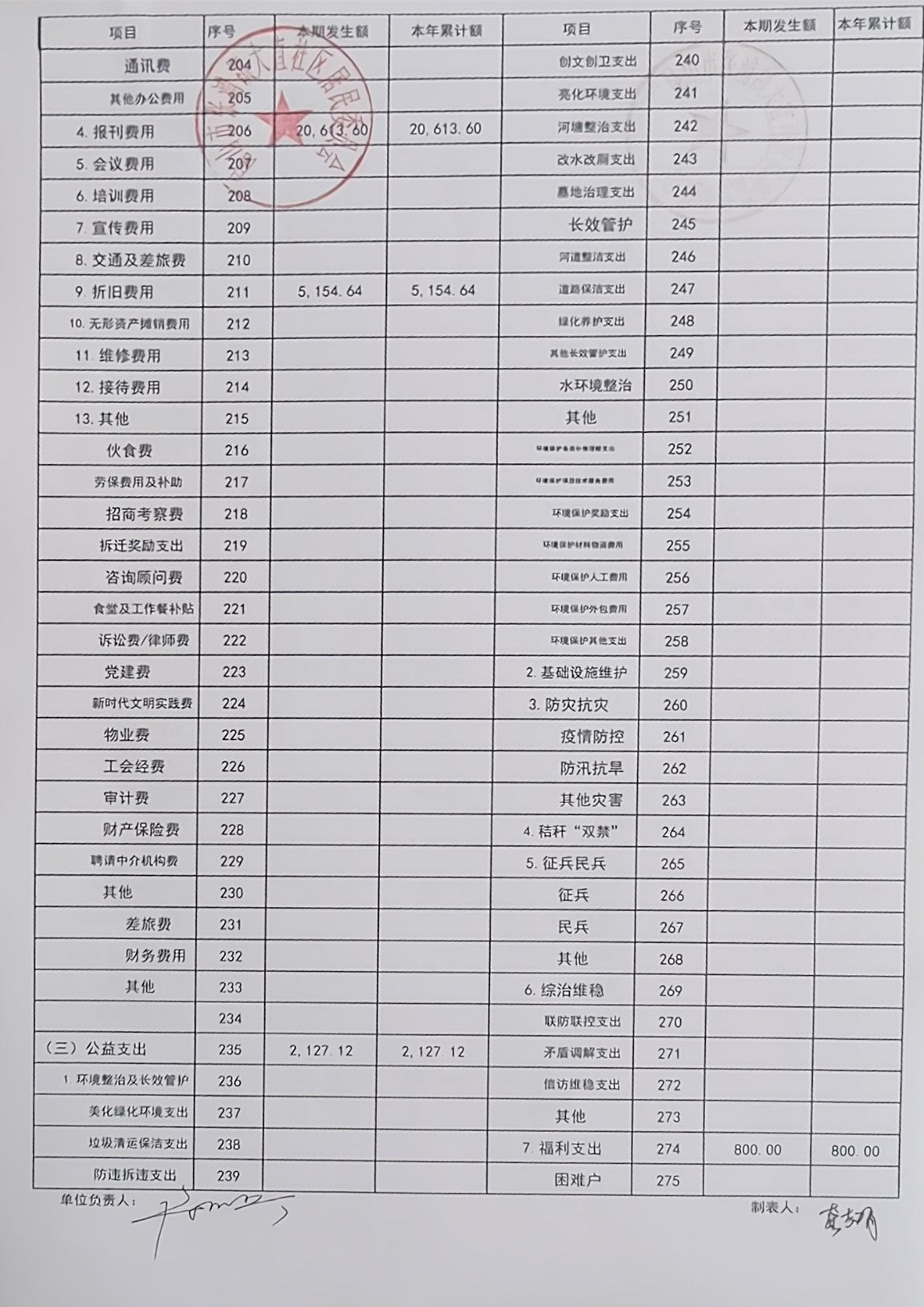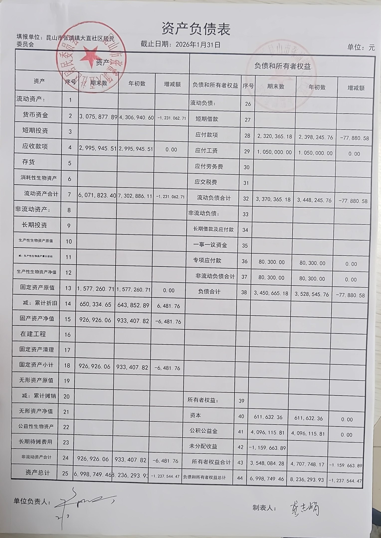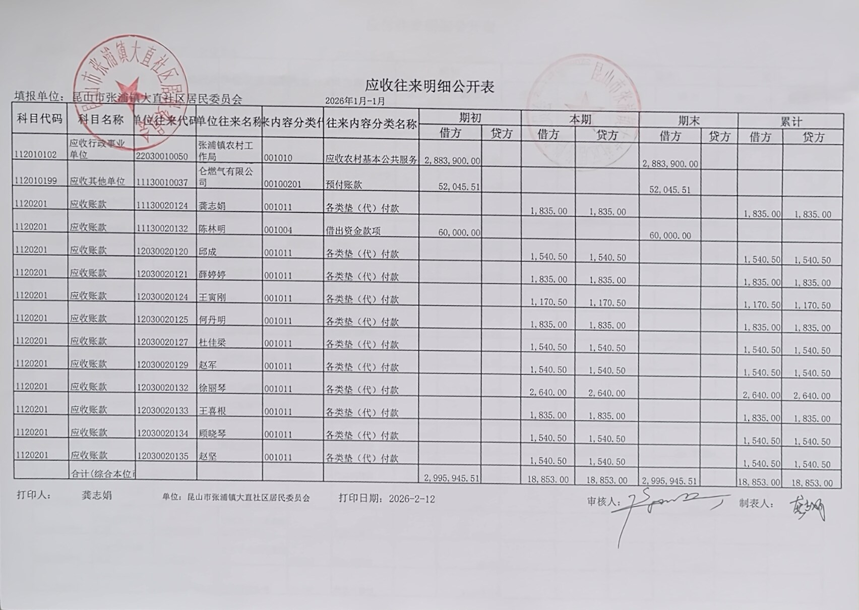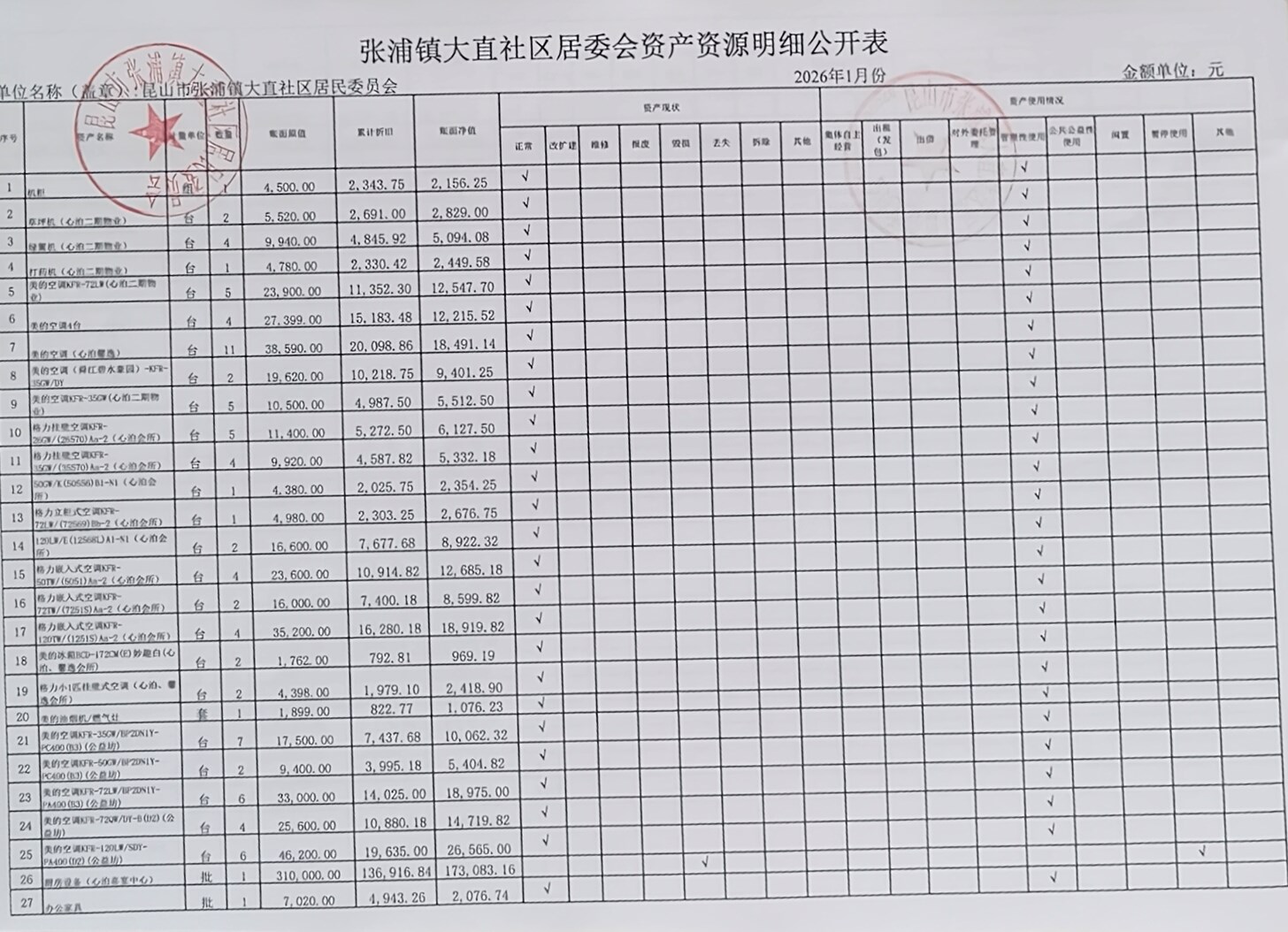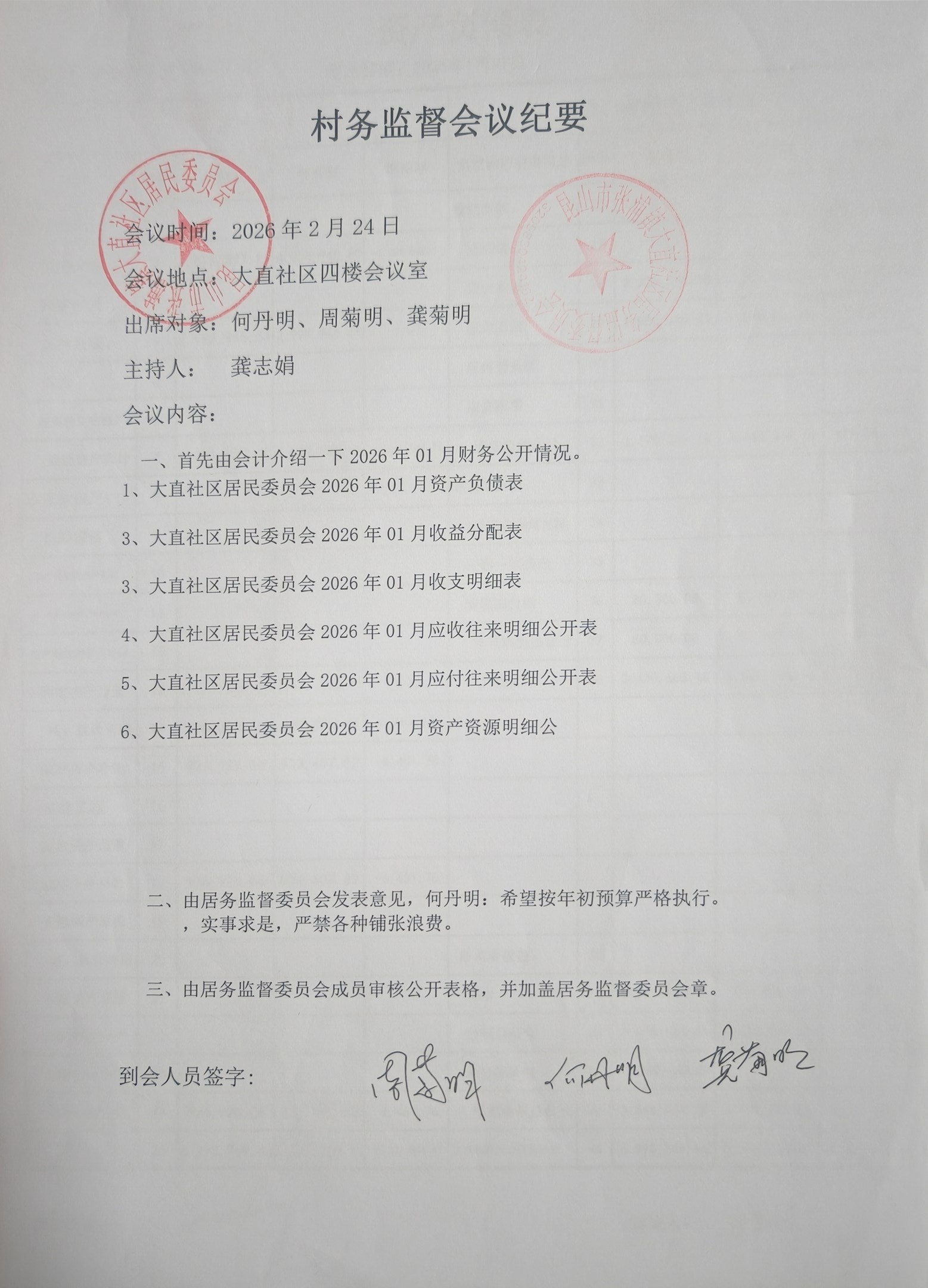 2026年1月大直社区居民委员会财务公开
