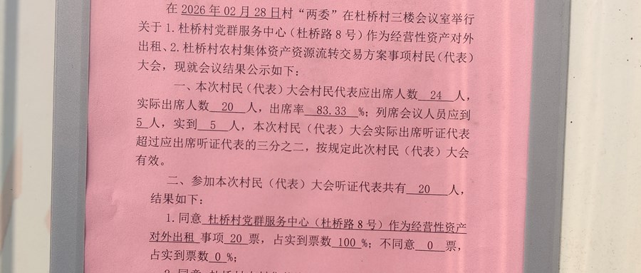关于杜桥村党群服务中心(杜桥路8号)作为经营性资产对外出租、杜桥村农村集体资产资源流转交易方案决策听证结果的公示