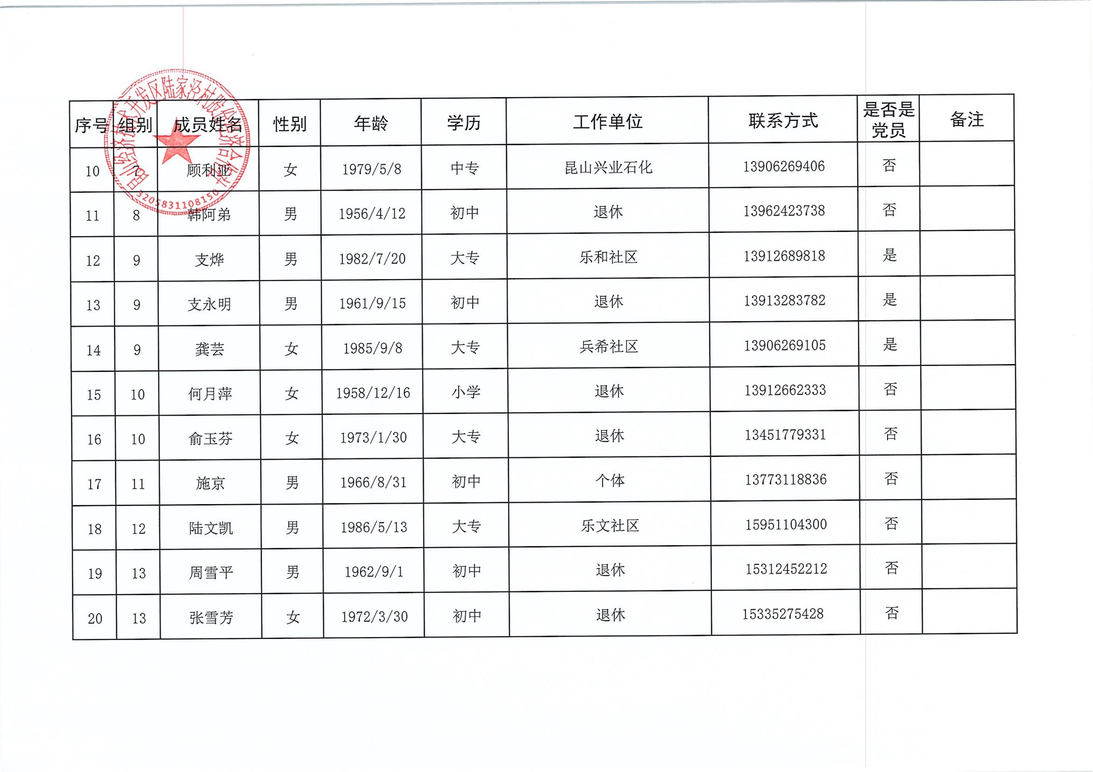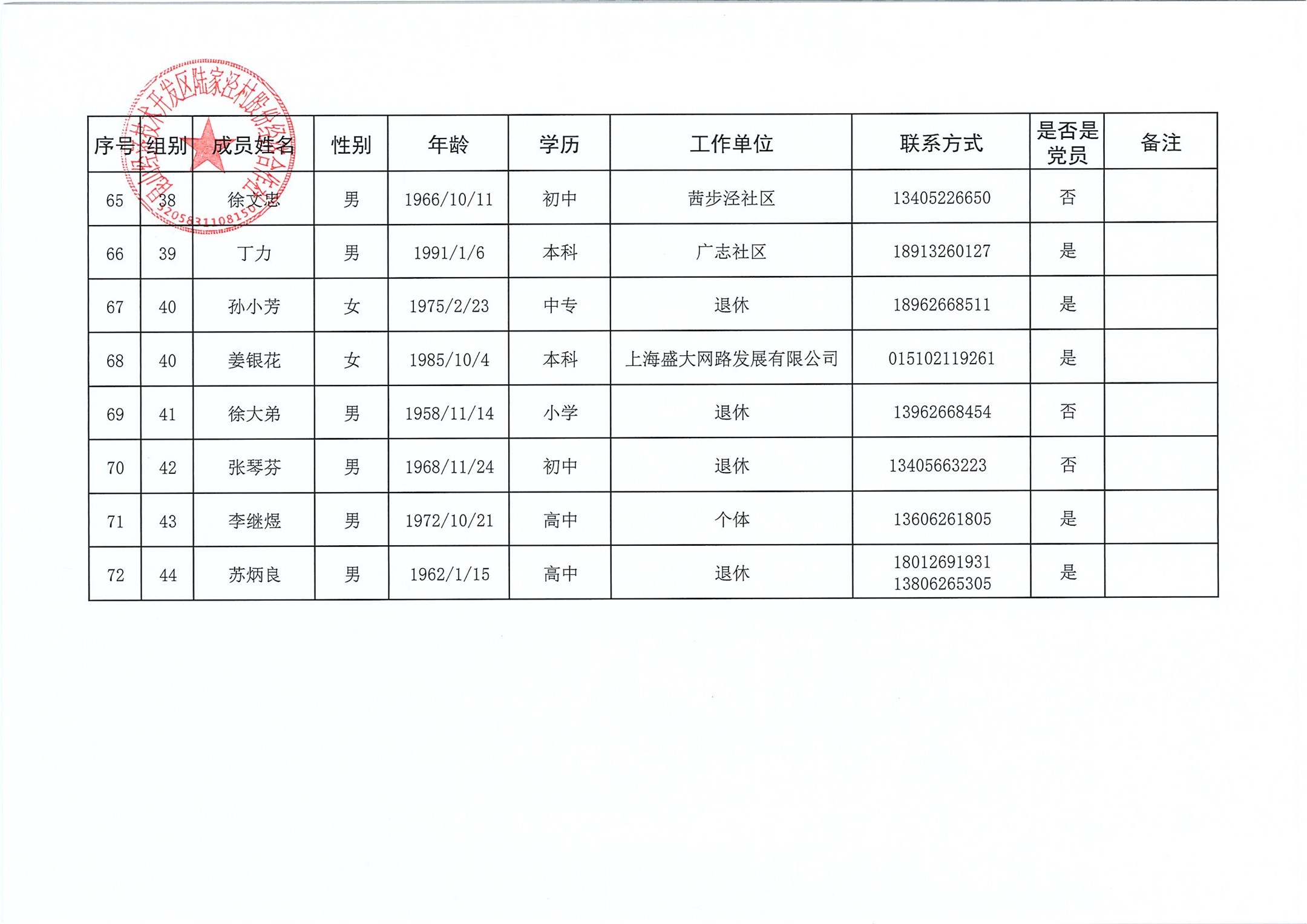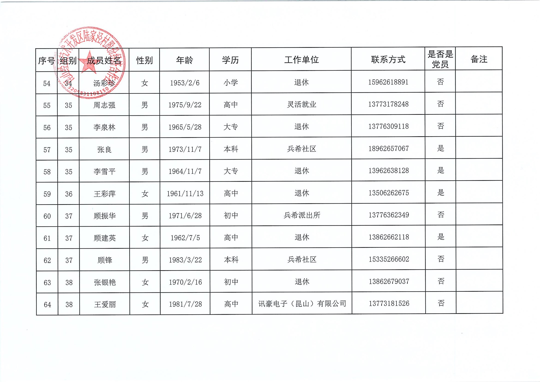 陆家泾村股份经济合作社成员代表