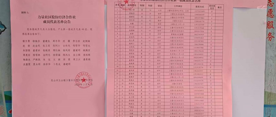 根据昆山市农村集体经济组织换届工作部署和《力量社区股份经济合作社选举方案》,现将力量社区股份经济合作社新一届成员代表名单公告如下: