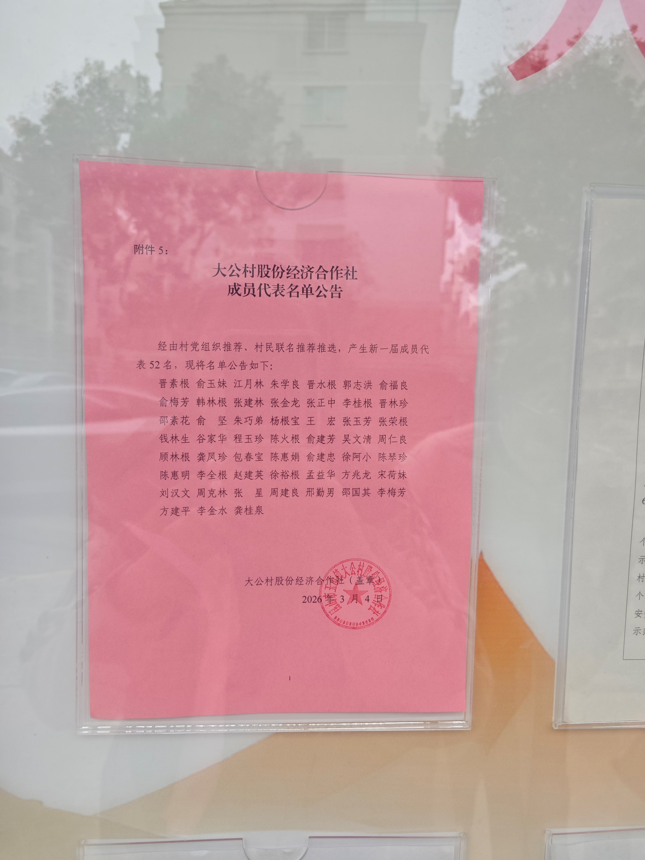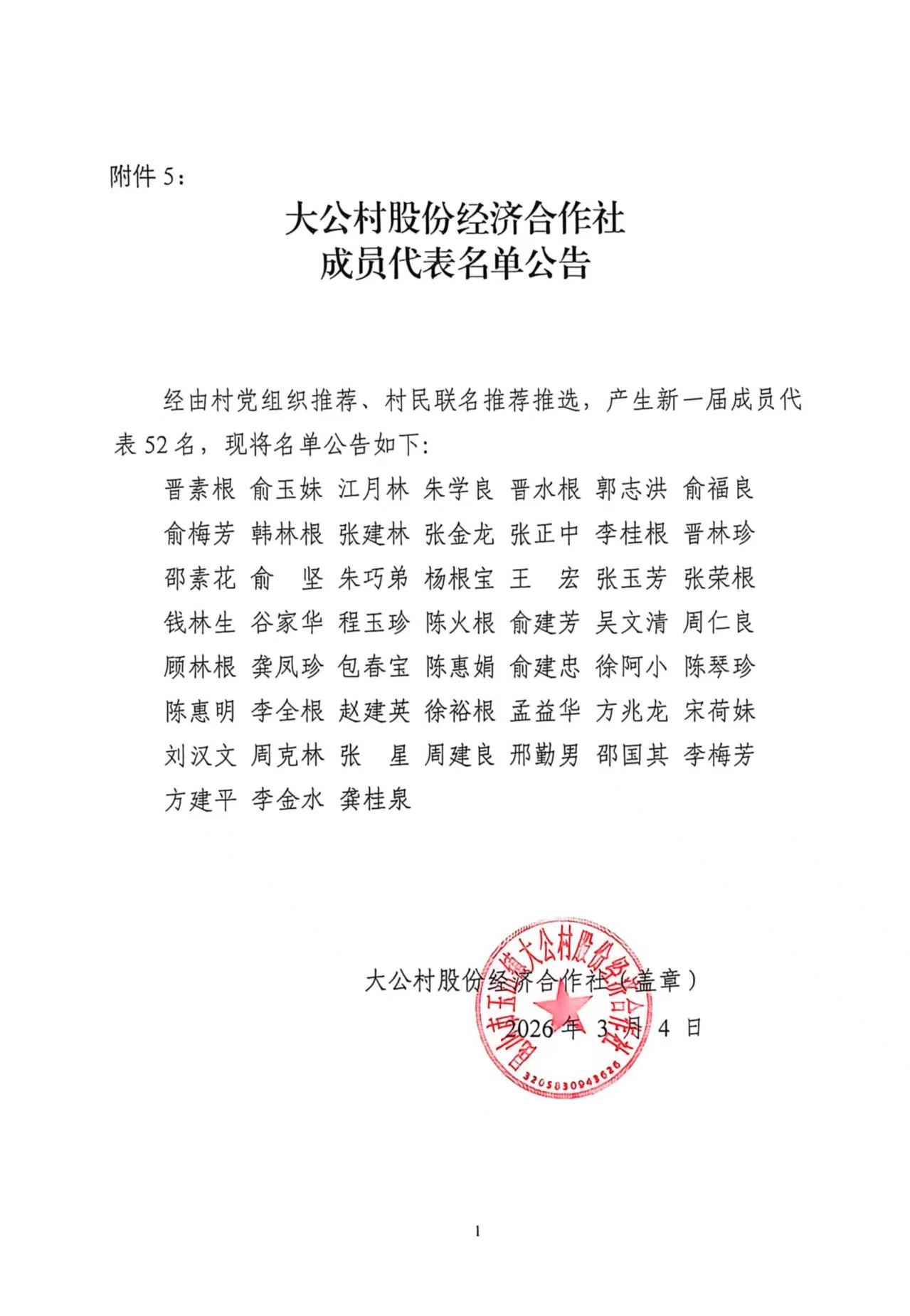昆山市玉山镇大公村股份经济合作社新一届成员代表名单公示