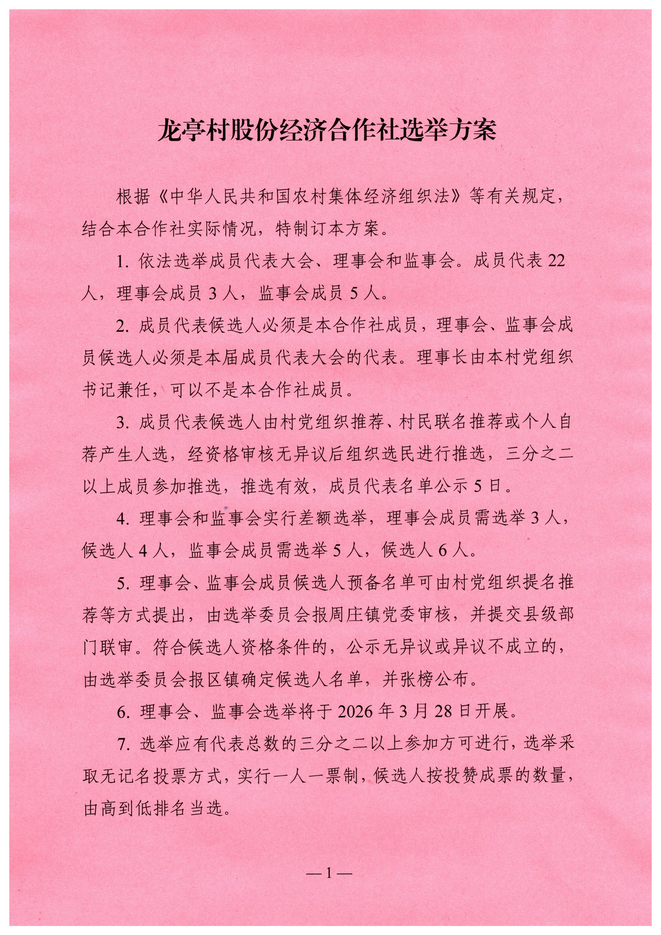 龙亭村股份经济合作社选举方案