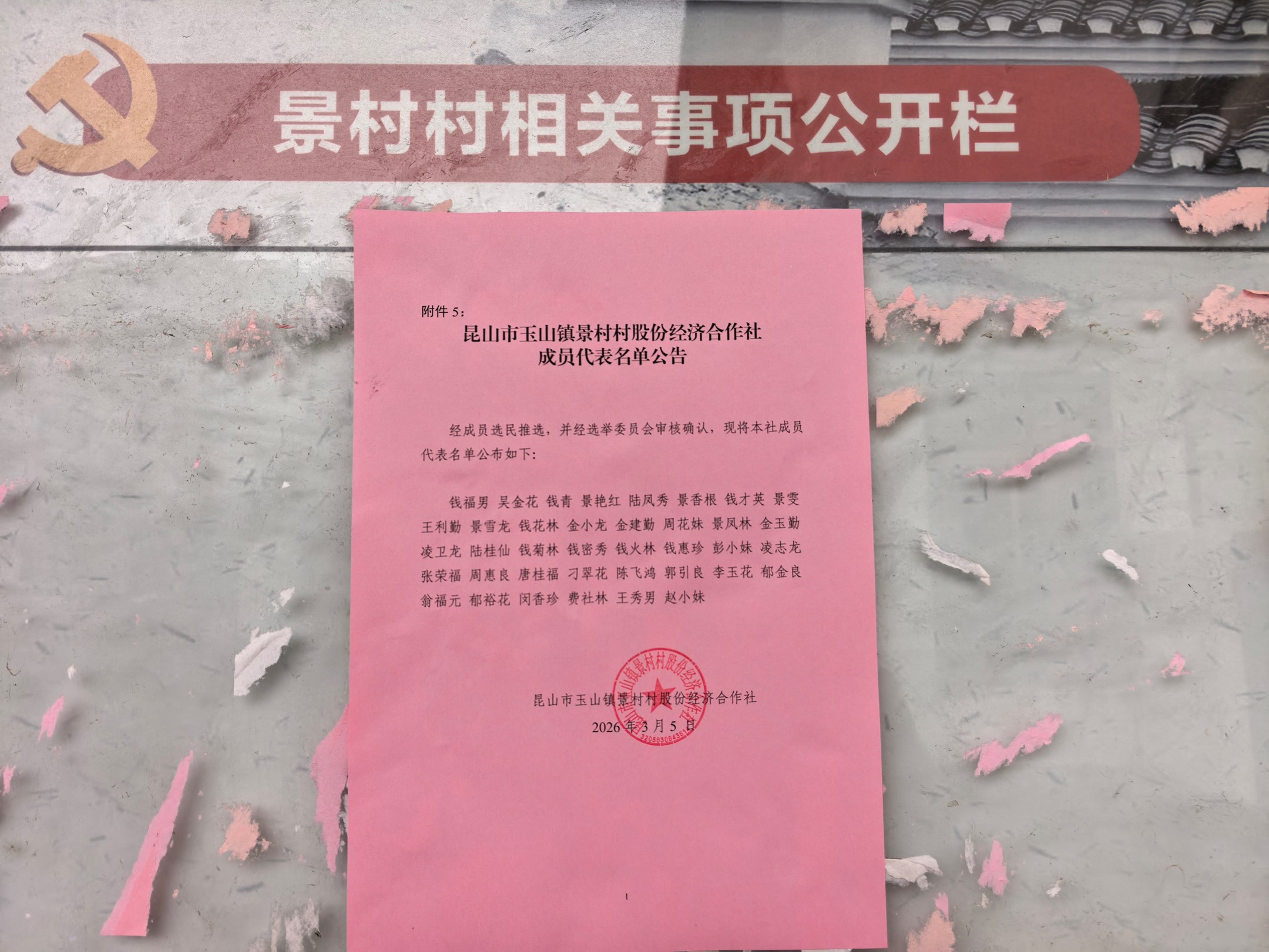 昆山市玉山镇景村村股份经济合作社成员代表名单公告: